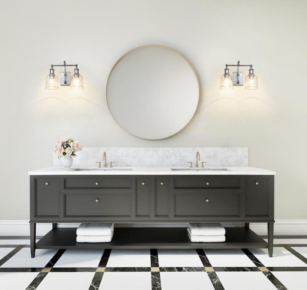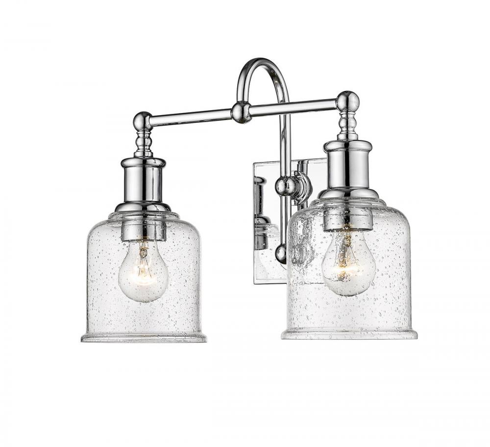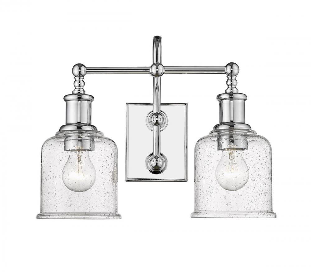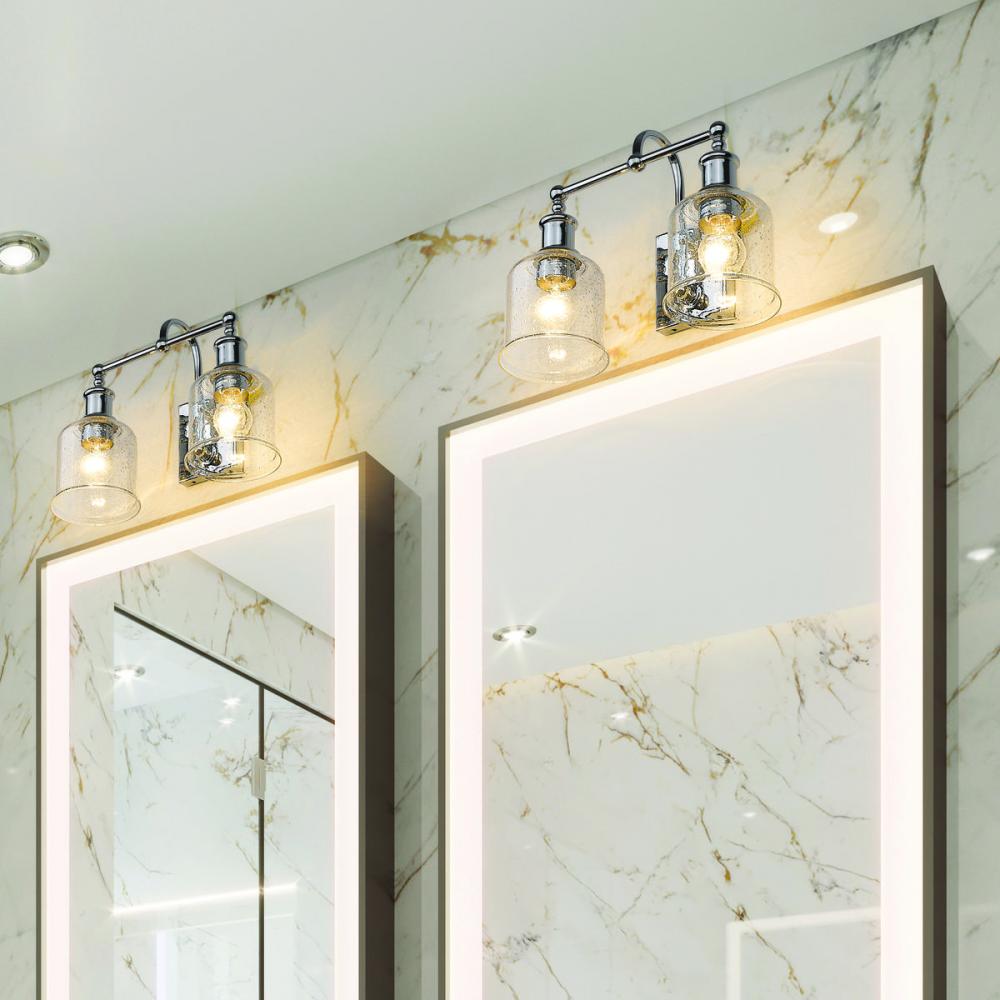 Choose a vintage industrial look with nautical influence, adding this two-light vanity light from the Bryant collection. Embrace a shiny chrome finish steel frame and mount, blending beautifully with clear seedy glass shades. A curved arm, ornate holders, and lipped shades generate extra charm that stylize a custom bath space, dining area, or main living room.