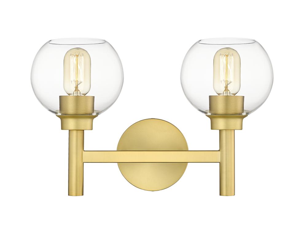 A contemporary two-light vanity sconce boasts graceful curves that create its perfect circle design elements. Its familiar, torch-inspired silhouette is adorned with a brushed gold finish for warm, glamorous flair in an entry or bathroom. A pair of open-edged, clear glass globe shades adds precision, and this fixture can be mounted with lights either up or down to best suit your space and preference.