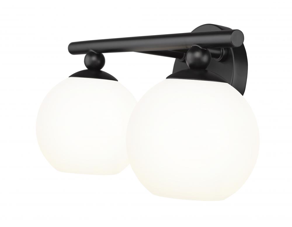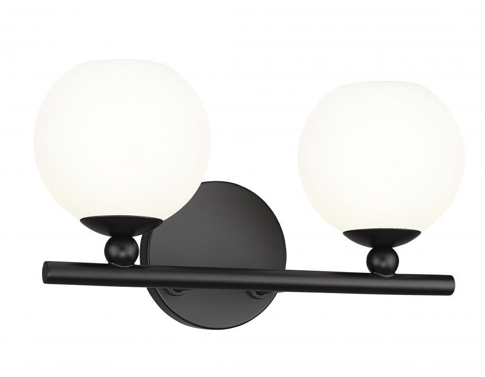 Embolden modern style in an updated custom bath space with this two-light vanity light from the Neoma collection. Symmetry and a hint of festive retro influence blend to add an outspoken design aesthetic featuring side-by-side opal etched glass globe shades affixed to a minimalist frame made of dynamic matte black finish steel. This contemporary vanity light transforms a master ensuite or guest bath into a haven for style.