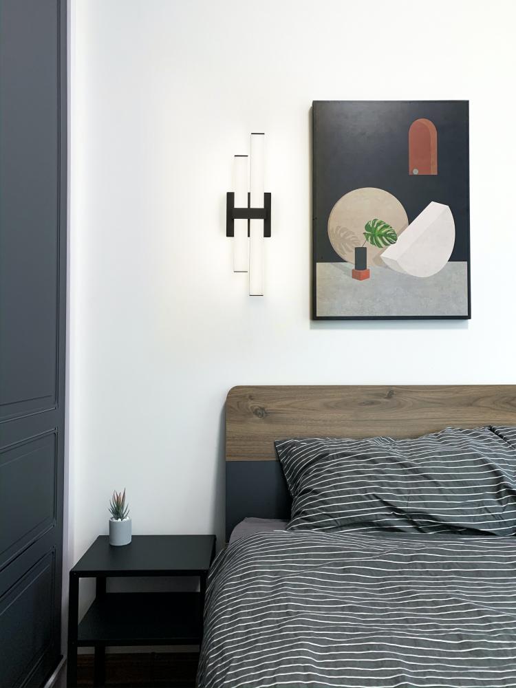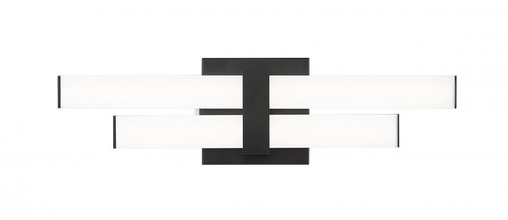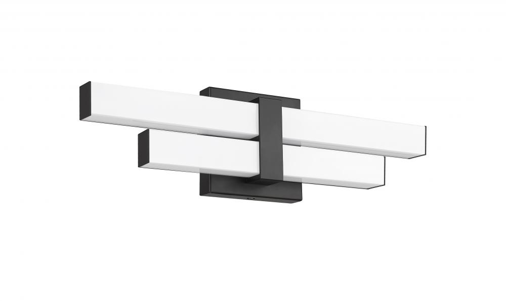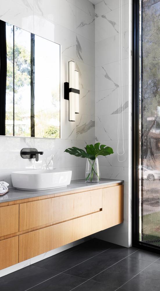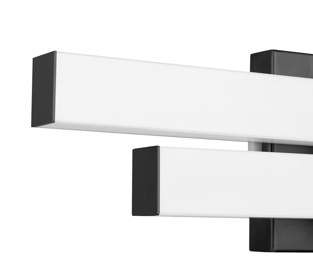 Contrasting finishes embellish the impact of a crisp geometric motif as this two-light vanity light delivers structural and linear styling. Aluminum framing and accents offer a dramatic matte black finish, as graduated frosted bar diffusers align vertically to emit dimmable LED lighting with a customized option of white color values.