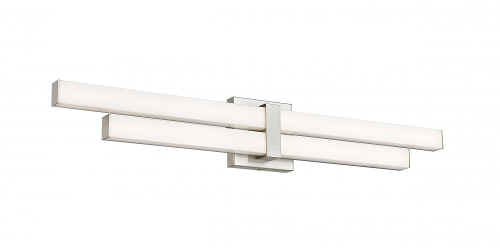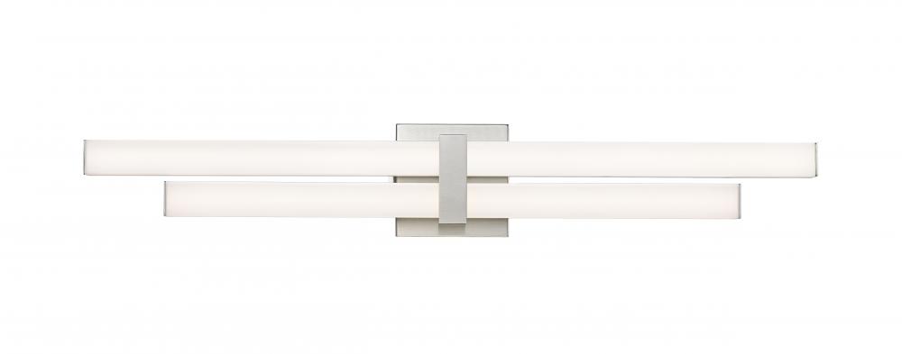 Edgy modern style shows structural symmetry with visual impact in a contemporary two-light vanity light, a sophisticated fixture with design creds. Aluminum framing and accents offer a clean brushed nickel finish, as graduated frosted bar diffusers align vertically to emit dimmable LED lighting with a customized option of white color values.