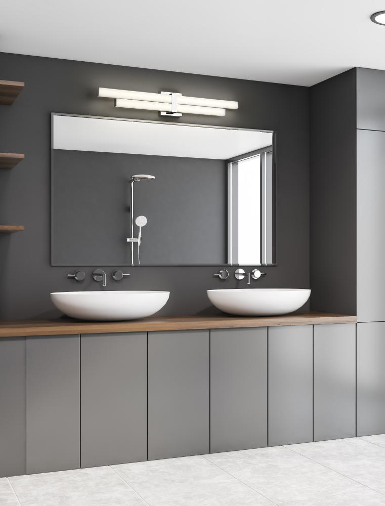The Zane family of vanity lights is comprised of an asymmetrical stacked design that provides ample light and plenty of style. The choice of 18-, 25-, 32-, and 40-inch widths ensures that Zane will suit the most popular vanity sizes. Lamped with dimmable m