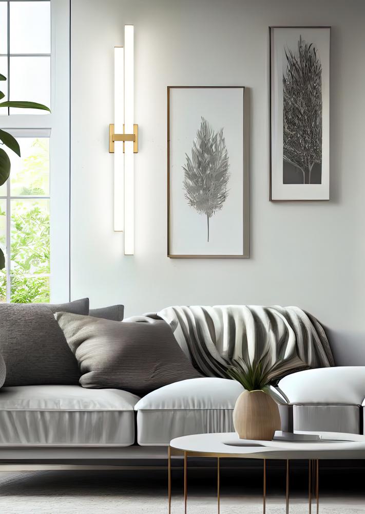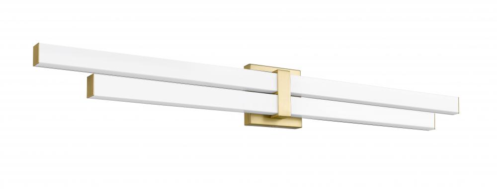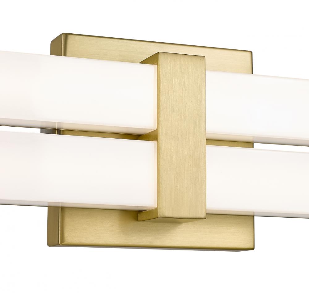 Seek out structural symmetry and a clean silhouette in a two-light modern vanity light that complements a custom bath space. Aluminum framing and accents add a warm modern gold finish, as graduated frosted bar diffusers align vertically to emit dimmable LED lighting with a customized option of white color values.