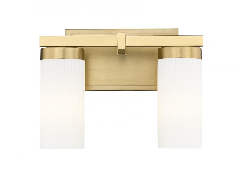 A pair of frosted white glass cylinders diffuse illumination from a modern two-light vanity fixture. In modern gold, it boasts a straight arm with robust details and a wide wall plate, all add warmth and sophistication to your bath.