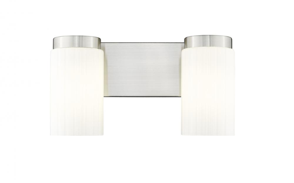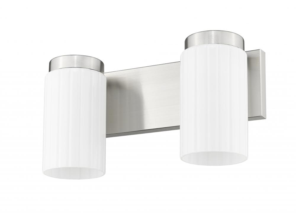 Elegant simplicity infuses every aspect of a modern two-light vanity fixture. It showcases a cylindrical shade in clear opal glass, with a brushed nickel finish gracing a rectangular wall plate and thick bands on top of each shade, creating a sleek, clean-lined silhouette that delivers beautiful illumination for all your grooming and beauty tasks.