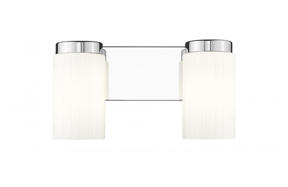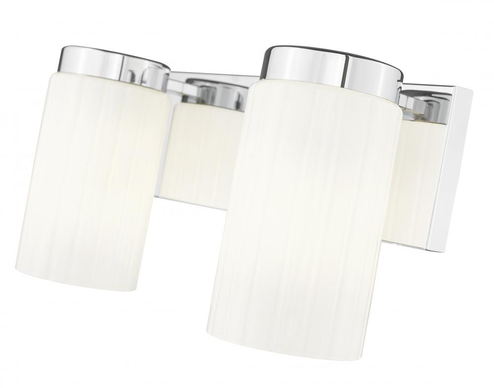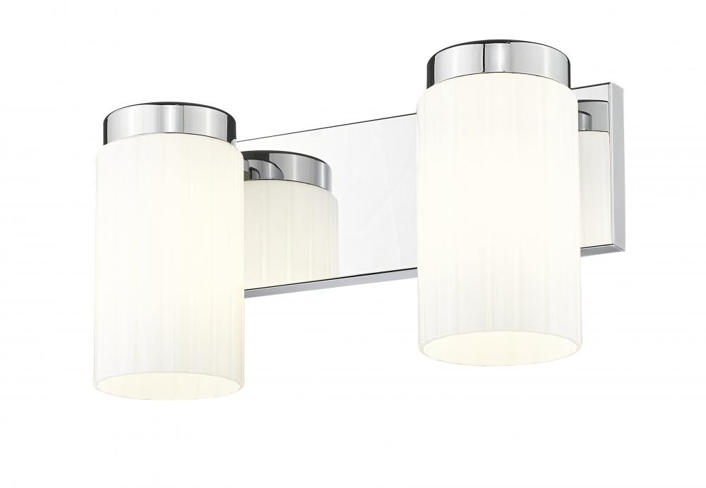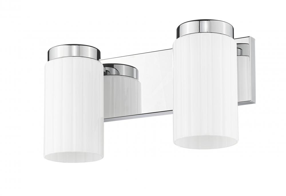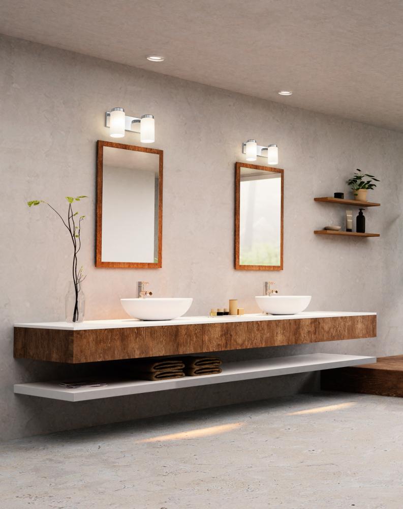 Simplicity sets the tone for a modern two-light vanity fixture. The perfect solution over a sink, it boasts a pair of opal glass cylinders set on a rectangular wall plate, creating a clean-lined silhouette that complements in virtually any space. A chrome finish gleams in the light and adds a clean, contemporary style.