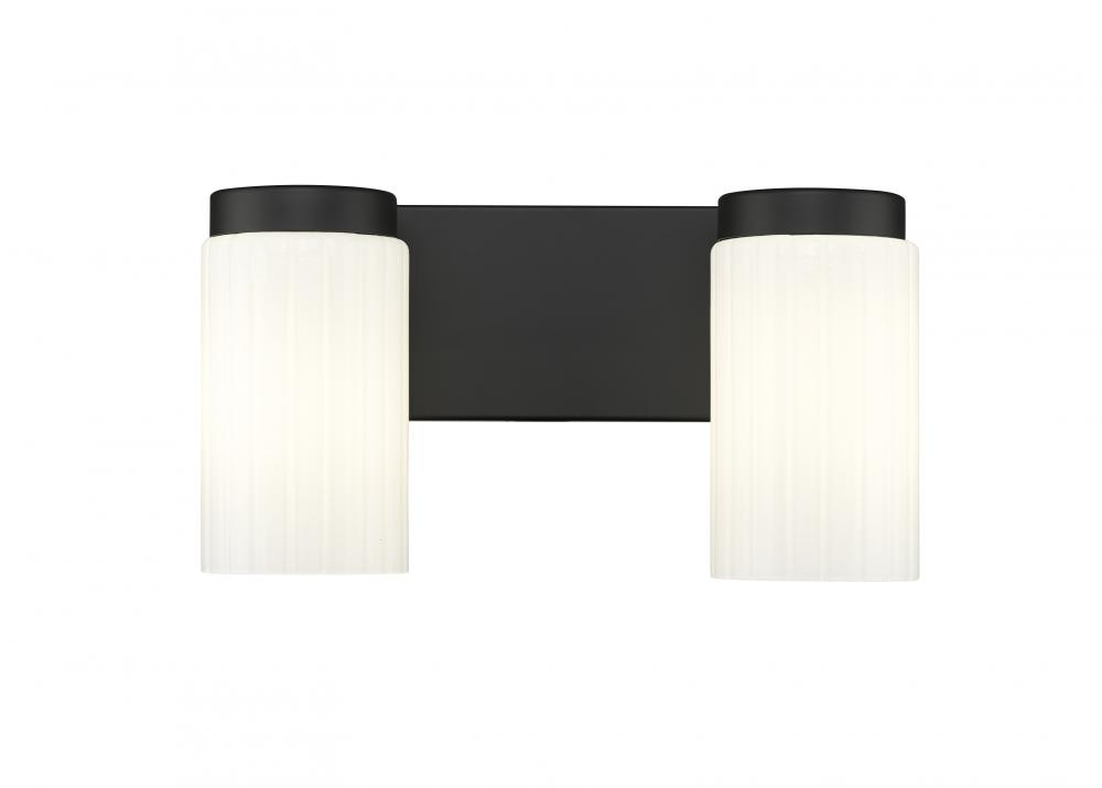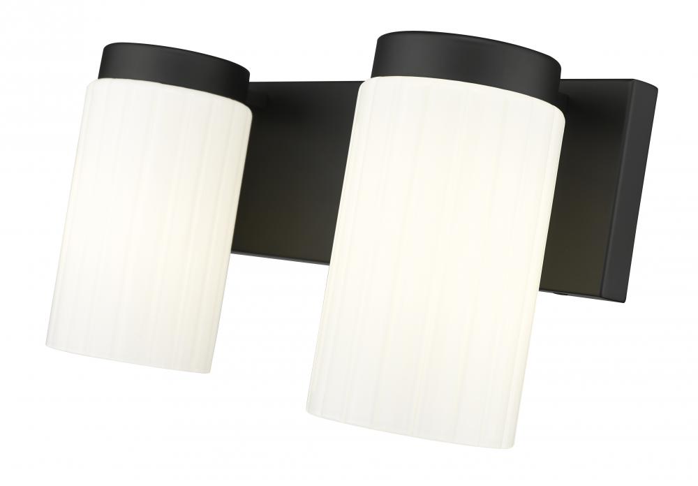 Freshen up the look and feel of your bath with a modern two-light vanity fixture. In matte black, it adds eye-catching contrast, complete with opal glass cylindrical shades that soften illumination and provide a lovely ambiance for both relaxation and tasks.