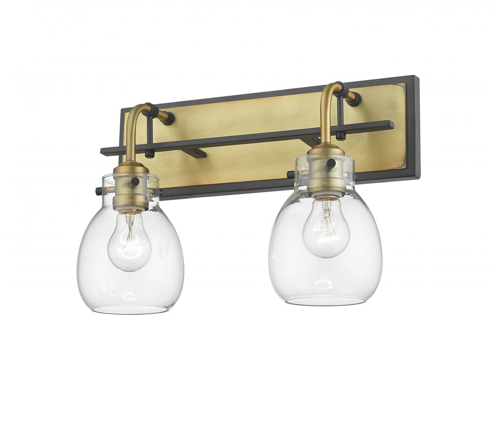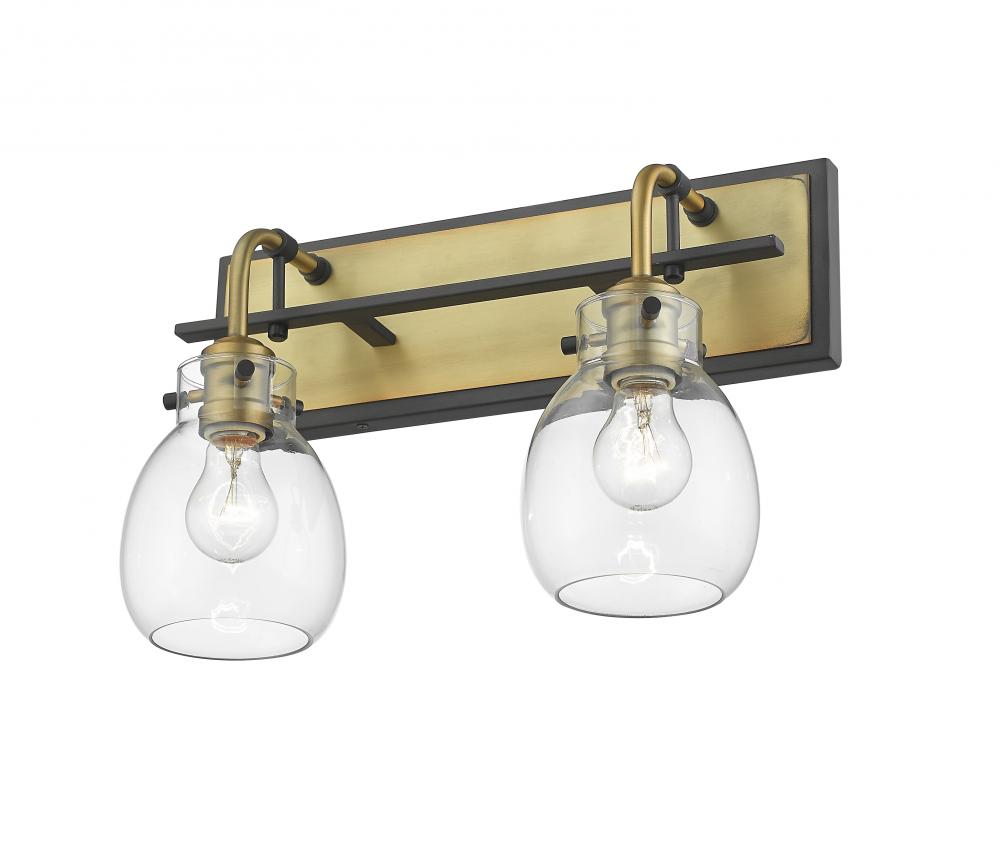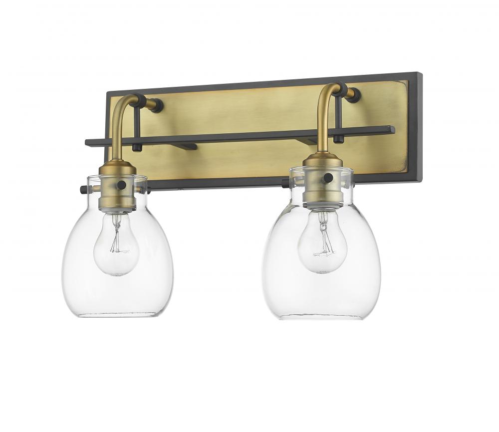 Jazz up a transitional space with an exceptional fixture that delivers warmth and beauty. Enjoy a dramatic matte black and olde brass finish over a rectangular mount, and clear glass shades that make this two-light wall sconce an excellent option.