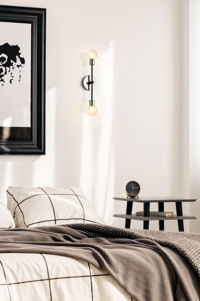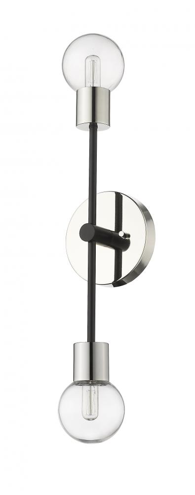 Handsome with a mid-century modern vibe, this contemporary two-light wall sconce from the Neutra collection gives an Art Deco air to any space. This dual pendant wall sconce also includes a plumb steel design, complete with contrasting polished nickel and matte black finishes. In addition, this dual light sconce can be hung vertically as a hallway accent light or horizontally over a bathroom vanity, offering ample lighting with its two clear glass globes.