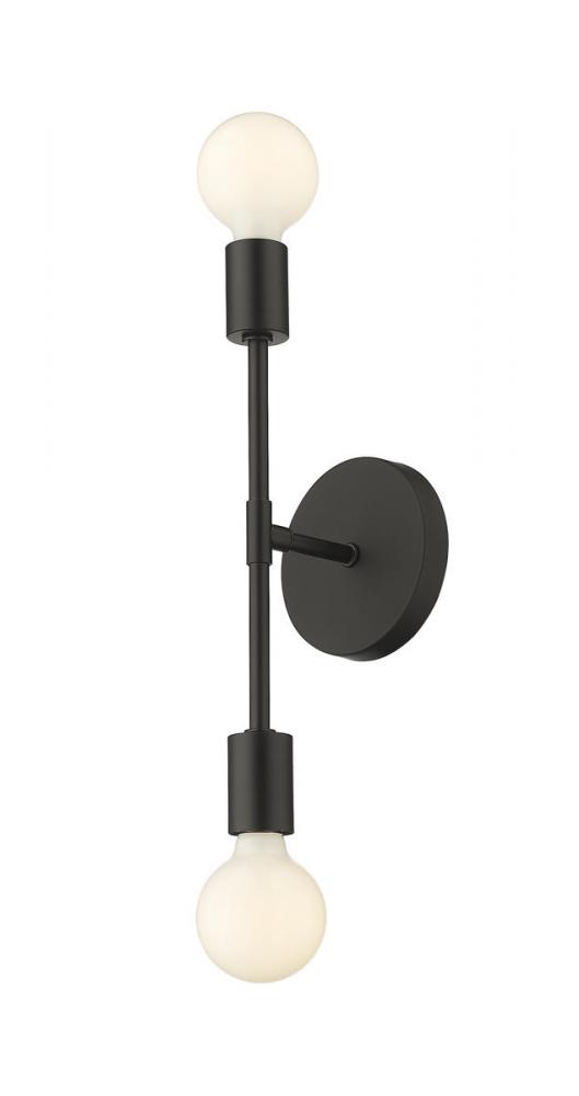 The bold aesthetic of matte black finish steel creates drama, bringing a notable quality to this two-light wall sconce. From the Modernist collection, this contemporary sconce delivers a sleek linear design with a vertical frame hosting bulbs at each end, and a round wall mount offering visual balance.