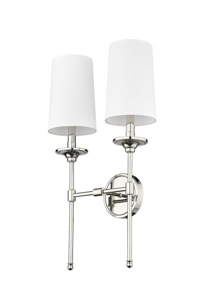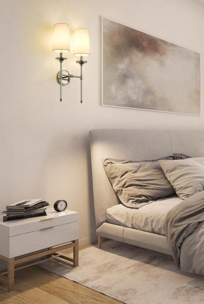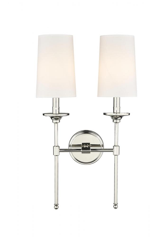 Complement the aesthetic of a traditional bedroom or bath with this elegant, two-light wall sconce from the Emily collection. A deep, rich matte black finish enhances the sleek silhouette of its classic metal frame. Two off-white cloth shades create a softly diffused glow for mood-lifting ambiance.