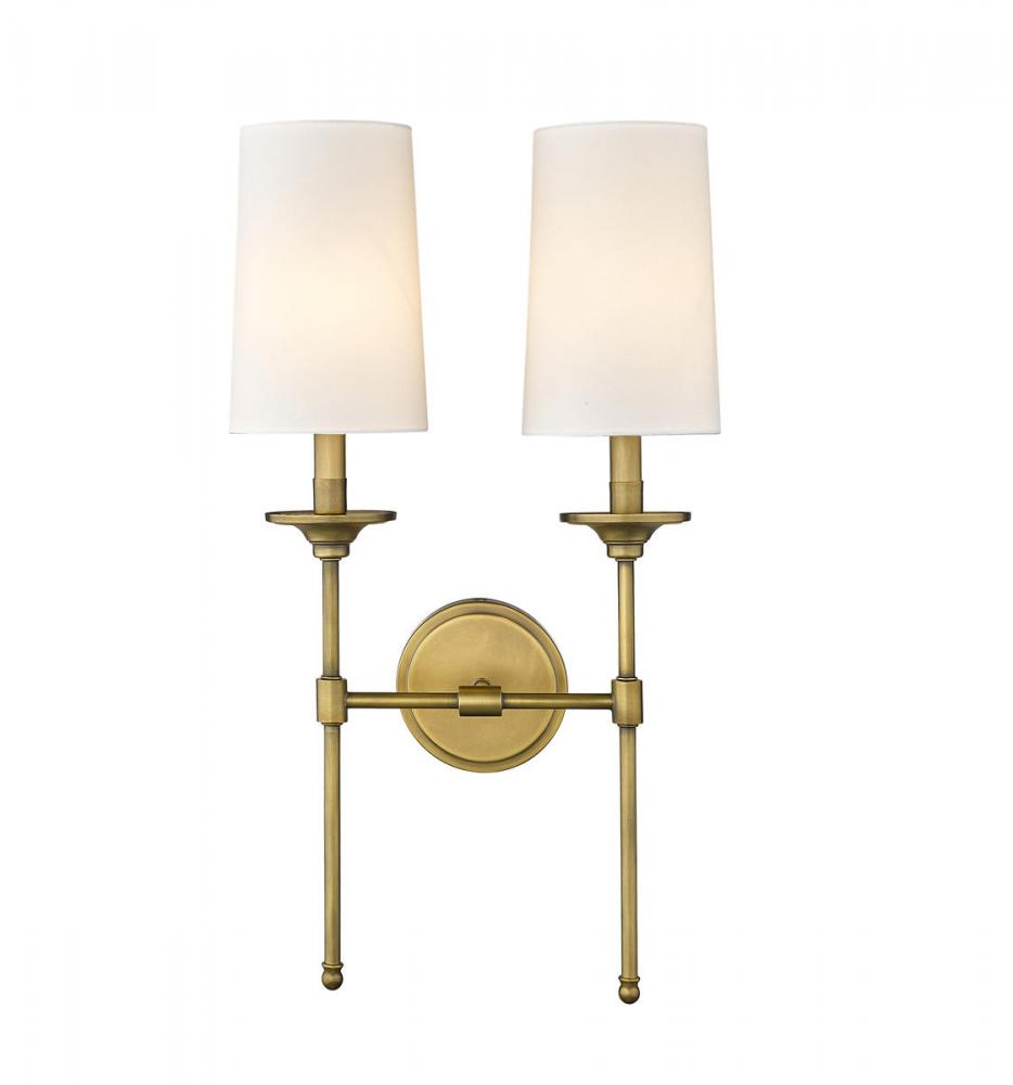 Complement the aesthetic of a traditional bedroom or bath with this elegant, two-light wall sconce from the Emily collection. A high-shine, polished nickel finish enhances the sleek silhouette of its classic metal frame. Two off-white cloth shades create a softly diffused glow for mood-lifting ambiance.