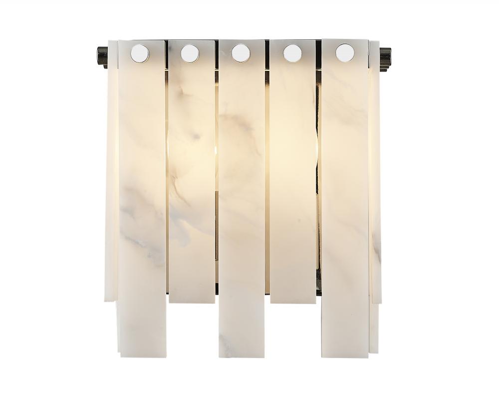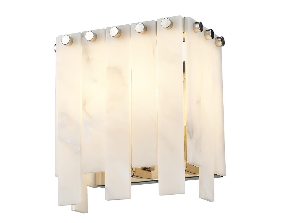 An intriguing Art Deco aesthetic leans toward minimalism in the design of a fixture that sets itself apart. This two-light wall sconce from the Viviana collection offers a decadent design featuring tasteful alabaster-like strips alternating in length and arranged around a squared polished nickel finish steel frame. Dressed up with whimsical rivot detailing, this sconce goes with the flow as it complements a gritty rendition of toned-down glam in a main living setting, en suite, or bedroom.