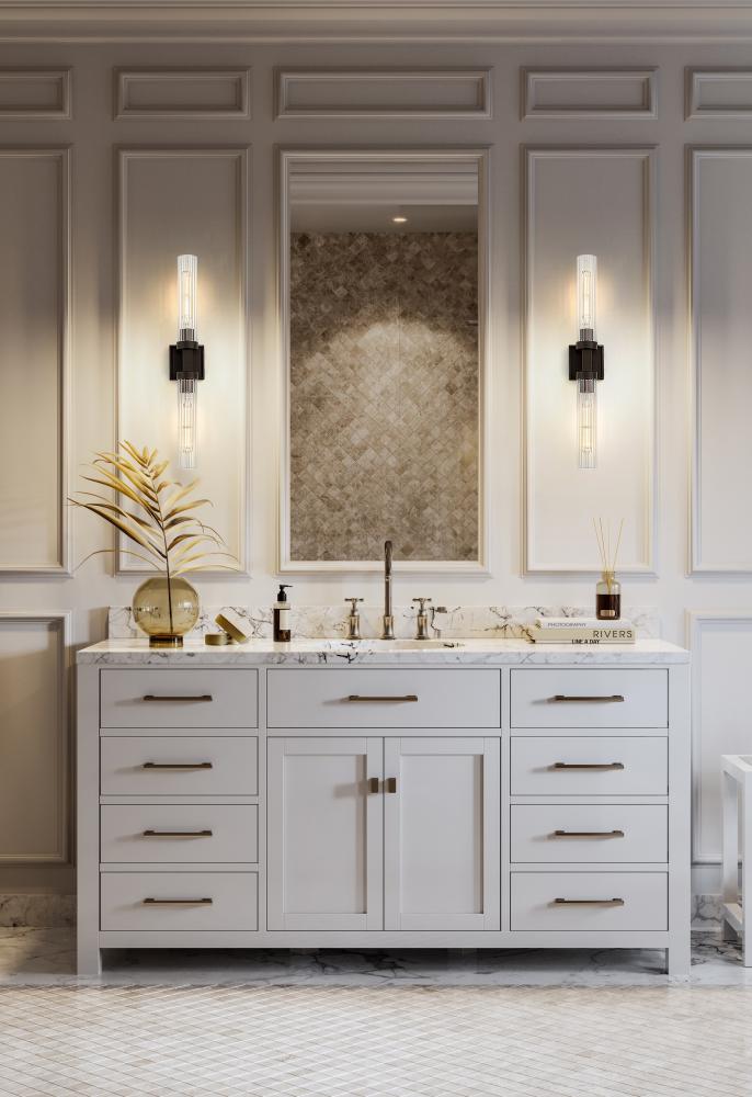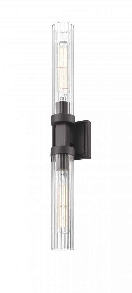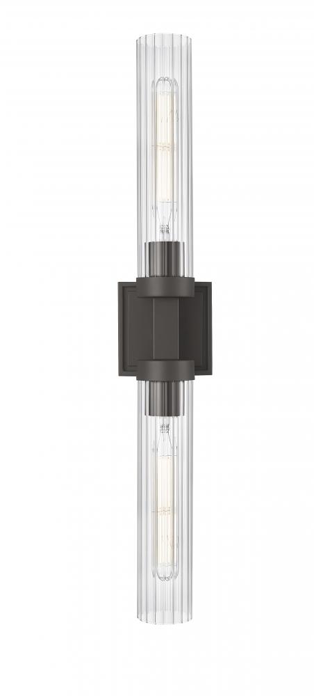 Rich, warm bronze sets the tone for a modern two-light wall sconce. Its double-ended design creates a linear profile, offering excellent style and lighting at the vanity or in your living spaces. Its slim, cylindrical shades are crafted in a delicate fluted glass, adding radiance and sophistication.