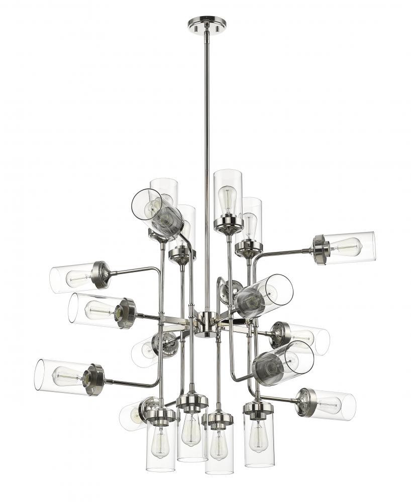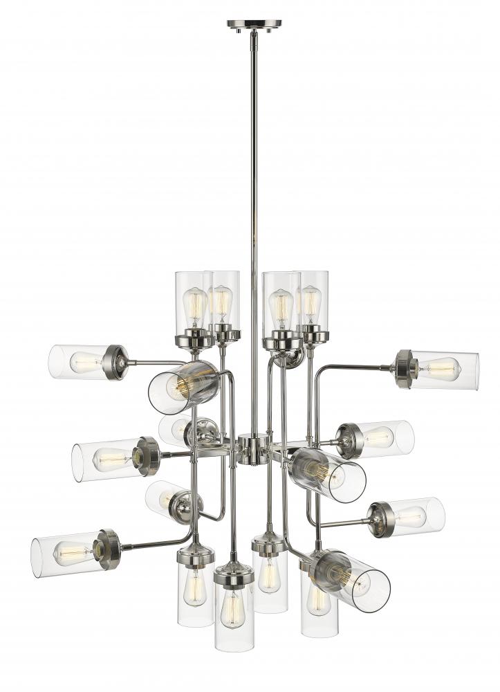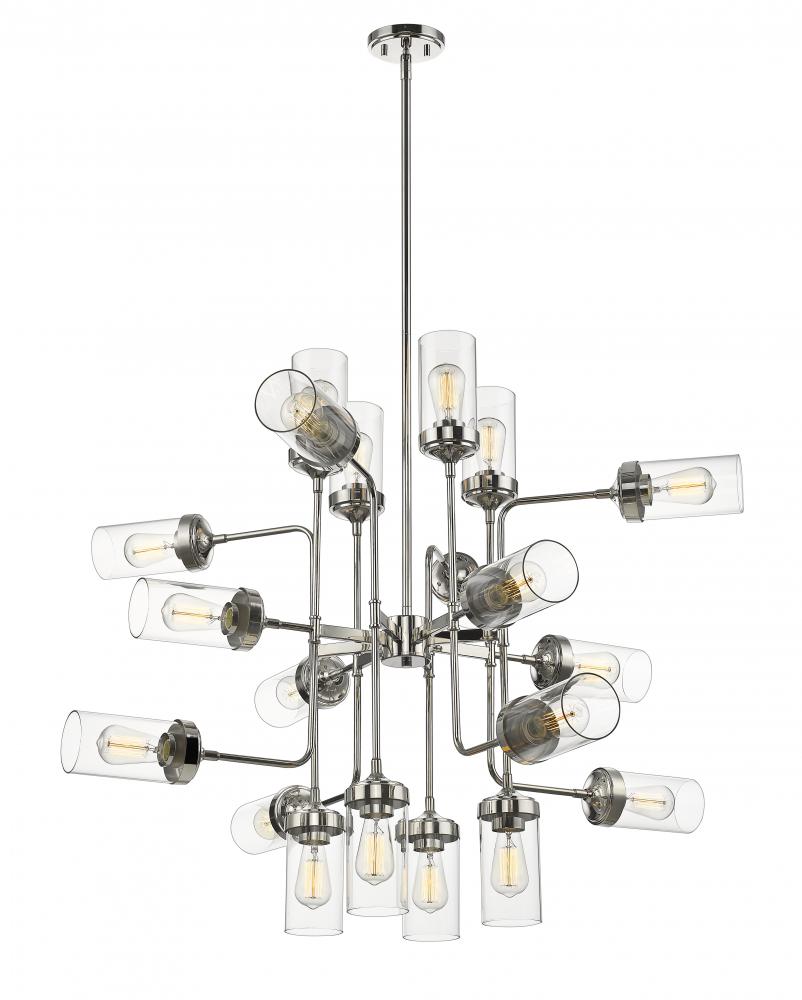 Turn a transitional living space into an industrial d?cor museum with this fashionable 20-light pendant. Hardware-inspired shapes in polished nickel finish steel form a symmetrical puzzle with clear glass shades offering a finishing touch.