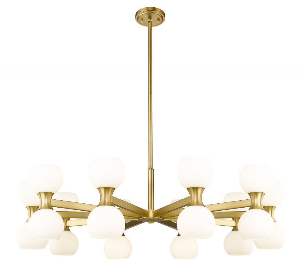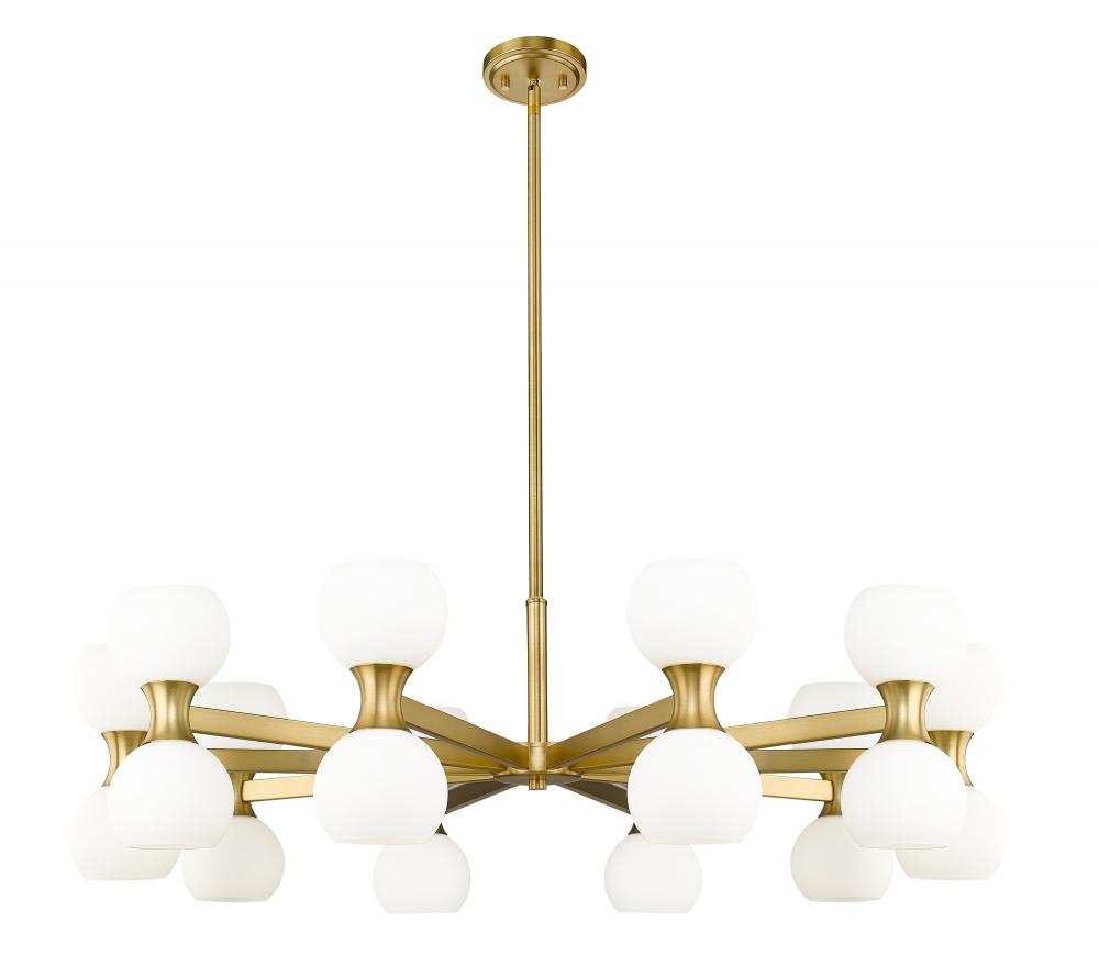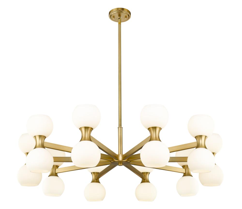 A gleaming gold finish and charming globe shades bring a hint of retro style to a light fixture with timeless elegance and charm. Choose this Mid-Century Modern 20-light chandelier from the Artemis collection to make a signature design statement in a spacious living area in need of strong ambient lighting. Delicate matte opal glass shades attach to a linear modern gold finish steel frame, dressed up with alluring curved elements and packaged to provide both fashion and function.