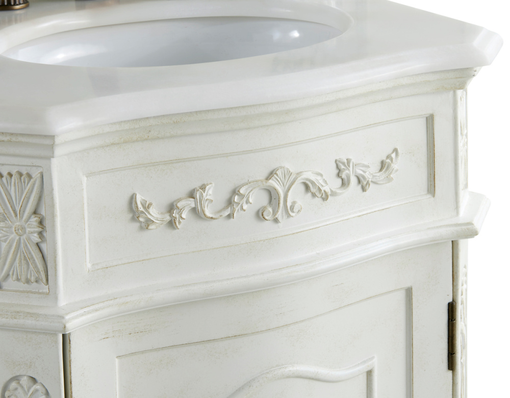 This superb balance of timeless tradition and opulent beauty in a engineered marble-topped vanity will certainly enhance the aesthetics of any home or office bathroom! Featuring an ivory white durable engineered marble countertop complimenting the hand painted cabinet with a delicate carved floral design, stands on stylishly carved solid wood French scroll feet. Don't let the design fool you, the engineered marble countertop and porcelain undermount sink allows for space to get ready, while the antique bronze hardware allows you to discover storage spaces with ease. You and your guests will marvel at this vanity that will both store away your bathroom essentials and enhance the aesthetics of your room.