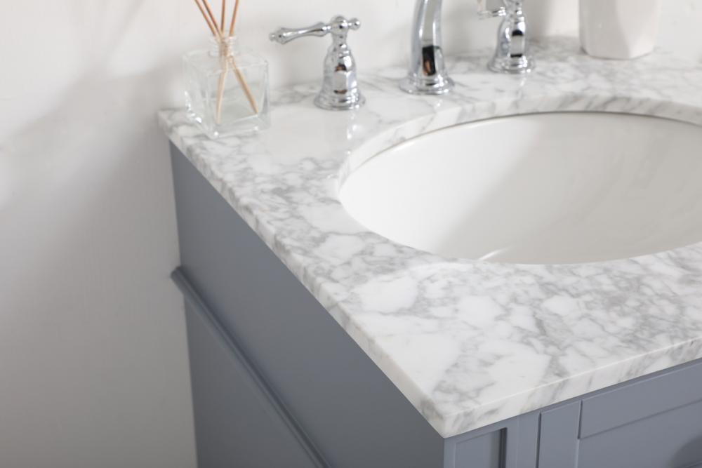 Comes with an undermount porcelain sink and a carrara white marble countertop