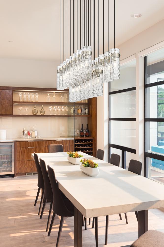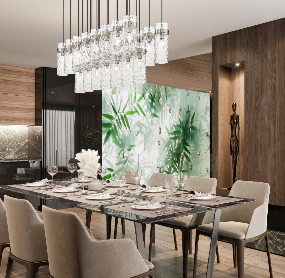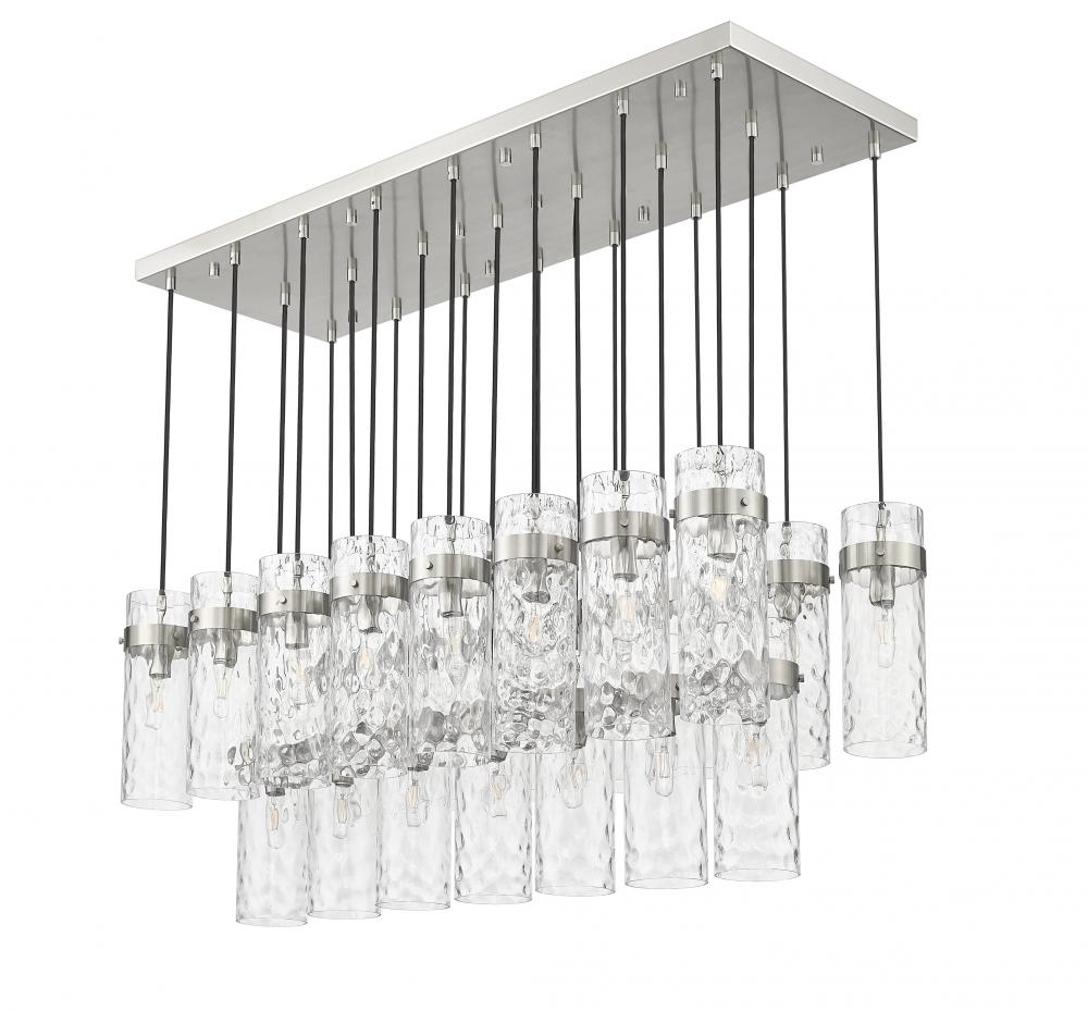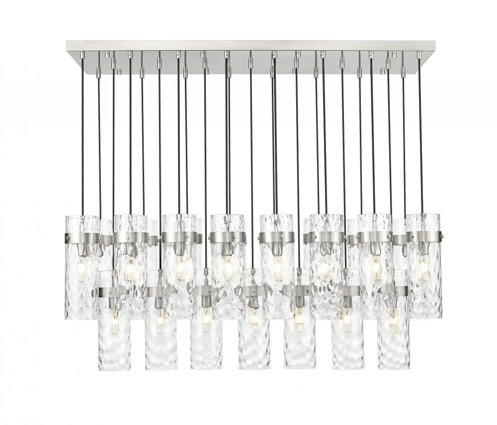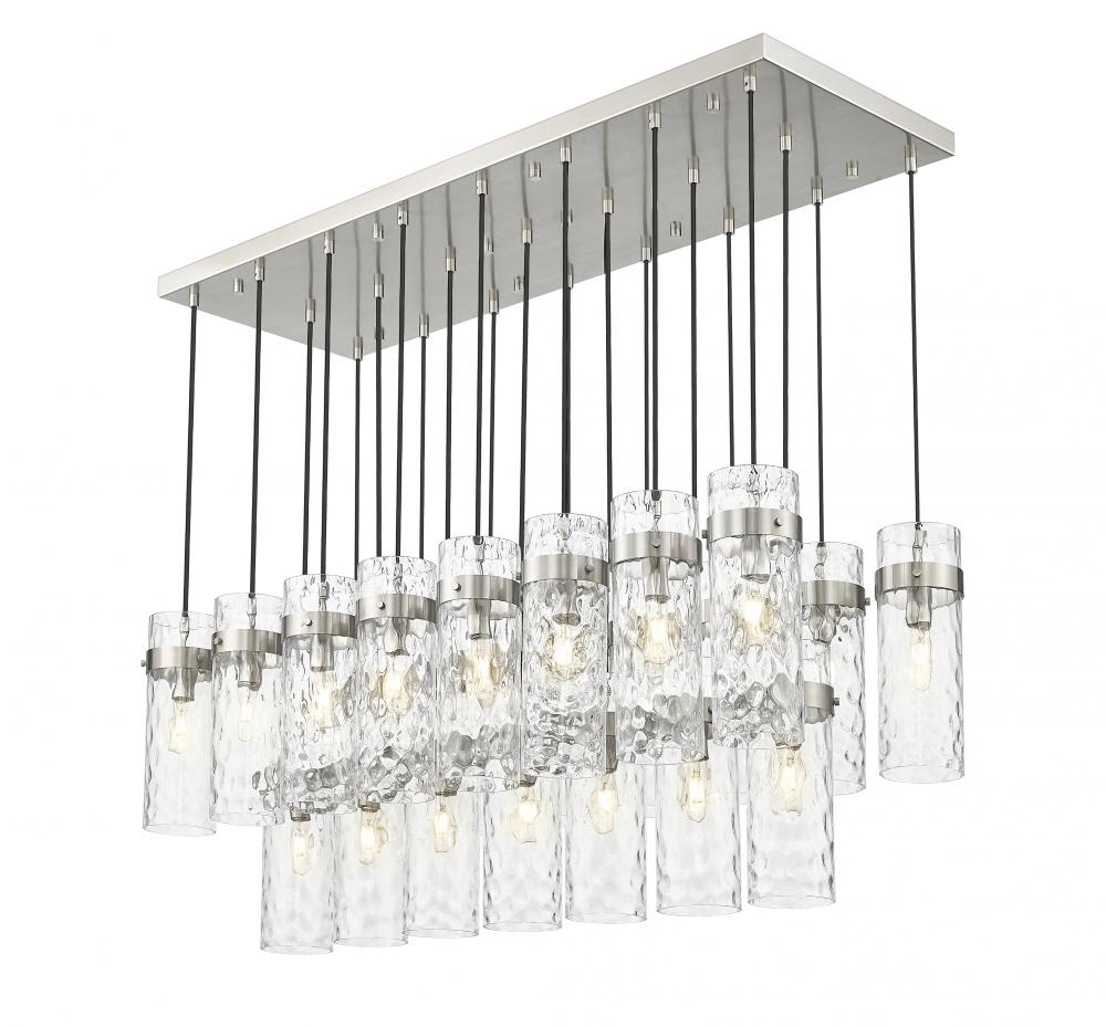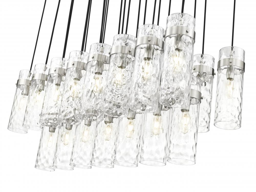 Put finishing touches on a grand, luxurious space with the opulence of this modern 23-light linear chandelier. A stunning centerpiece over a two-story living space, it features dual tiers of suspended cylindrical water glass shades with a rippled texture and creates elegant illumination in any setting. A brushed nickel finish and black braided cord complete the look with sophistication.