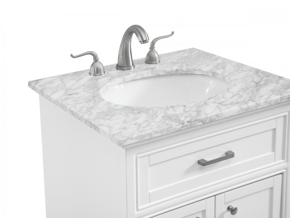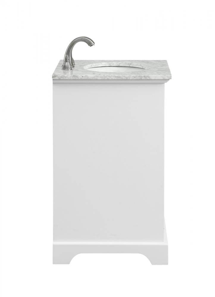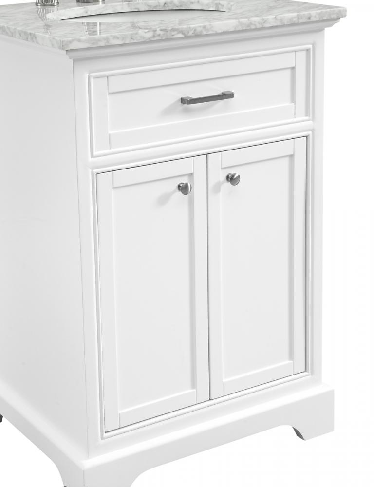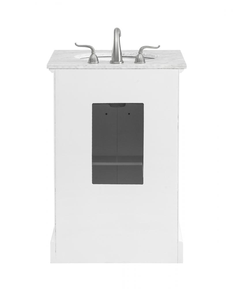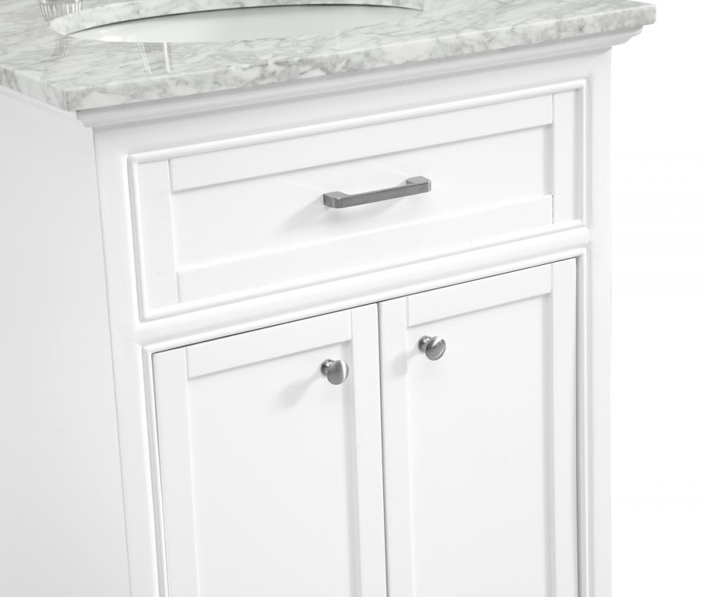 From its Italian Carrara white marble top to its contemporary-styled hand painted white cabinet, this member of our “Americana” vanity collection is sure to enhance either your home or office bathroom. Beneath its lustrous, natural marble top and an oval, white porcelain under mount sink, a handsome 2-door cabinet with a Single shelf for all your bathroom essentials, highlighted with recessed panel doors, brushed steel bar handle and knobs, stands on strong solid pedestal feet. A wonderful balance of simplicity and practical function! Measurements: W24”xD21.5”xH35”