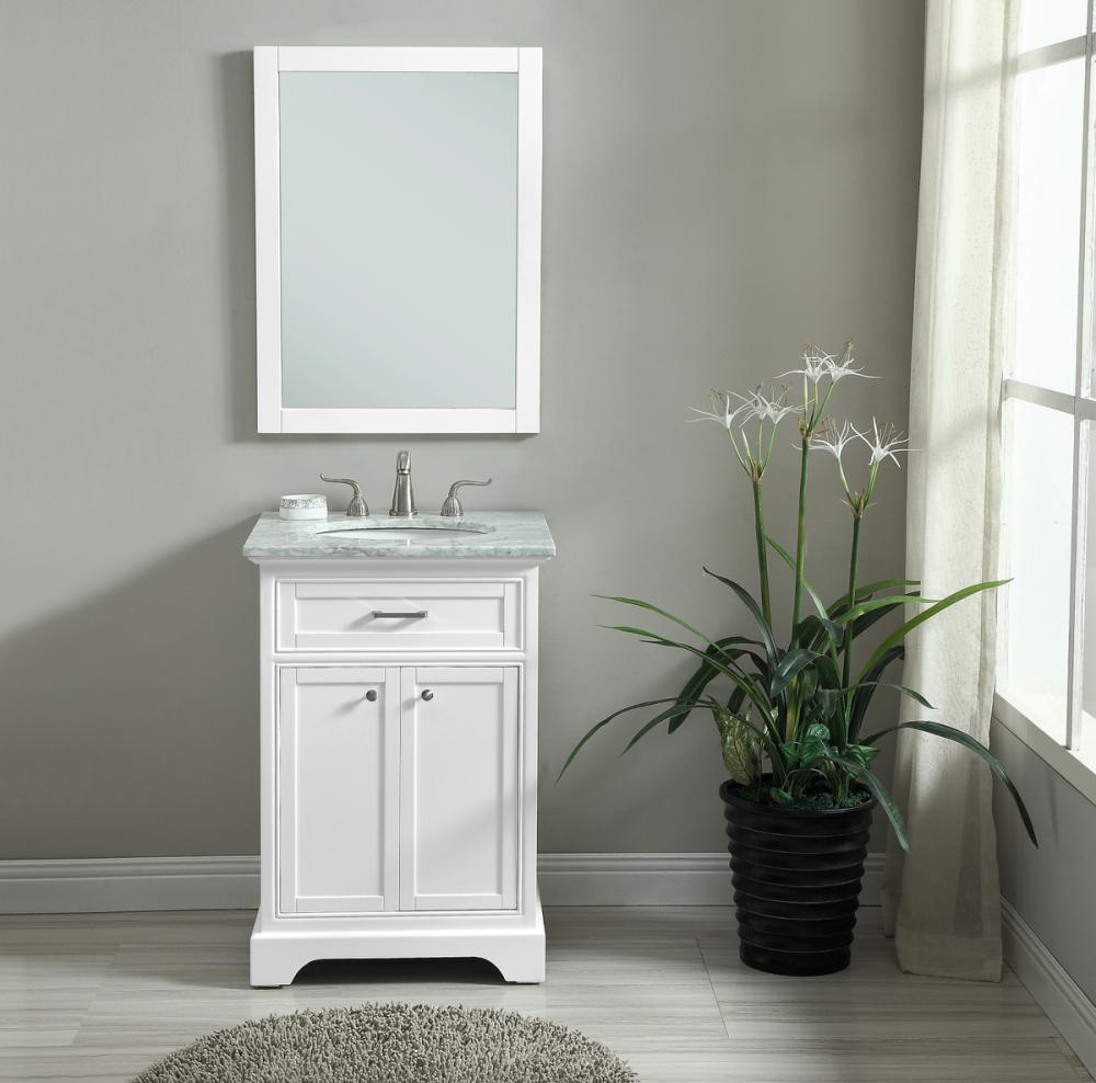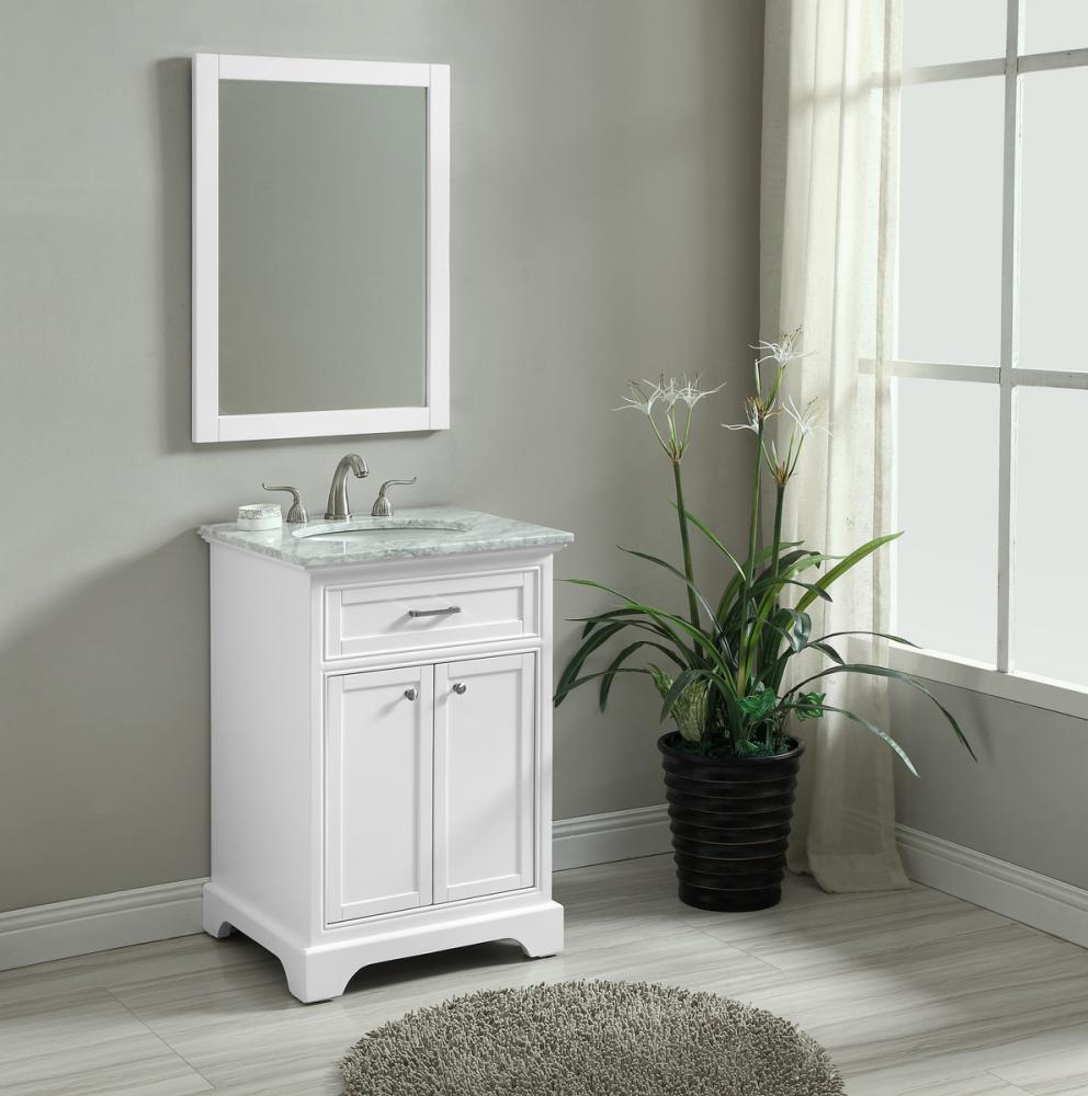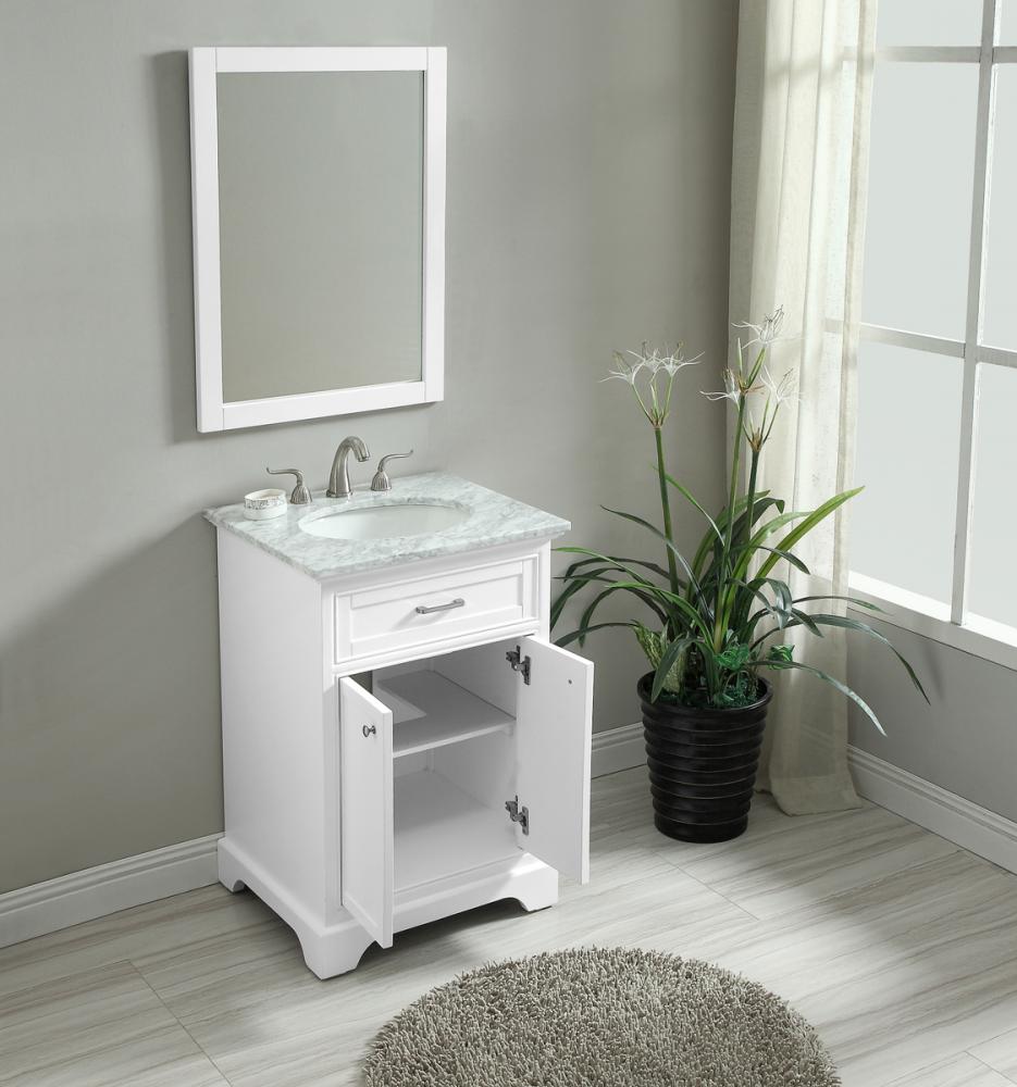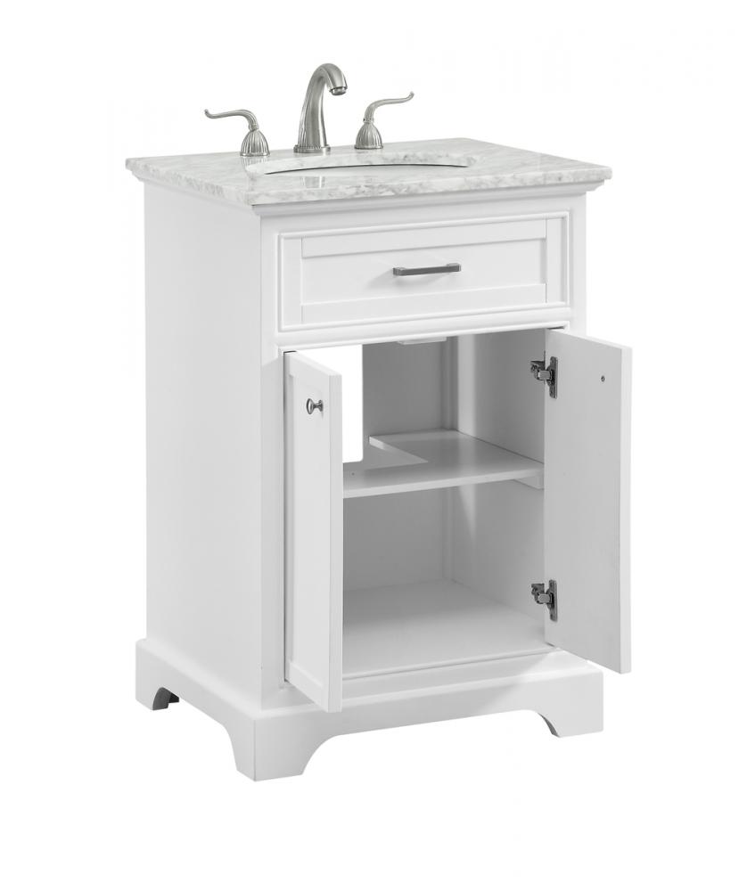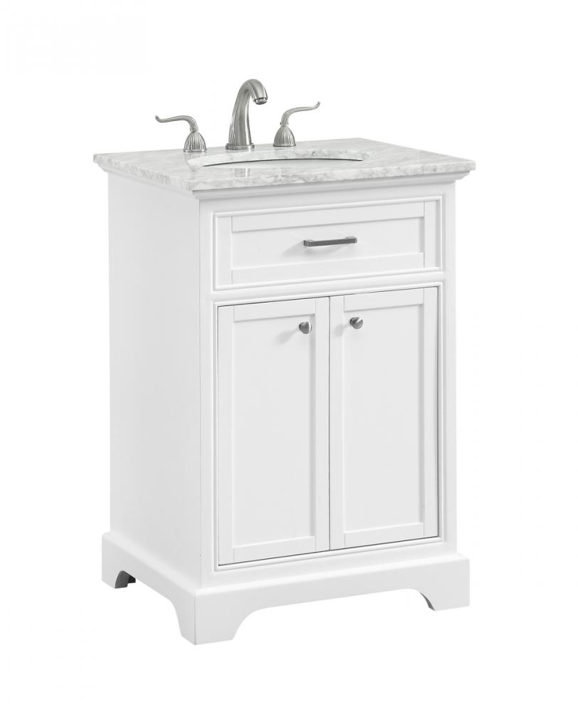 From its Italian Carrara white marble top to its contemporary-styled hand painted white cabinet, this member of our “Americana” vanity collection is sure to enhance either your home or office bathroom. Beneath its lustrous, natural marble top and an oval, white porcelain under mount sink, a handsome 2-door cabinet with a Single shelf for all your bathroom essentials, highlighted with recessed panel doors, brushed steel bar handle and knobs, stands on strong solid pedestal feet. A wonderful balance of simplicity and practical function! Measurements: W24”xD21.5”xH35”