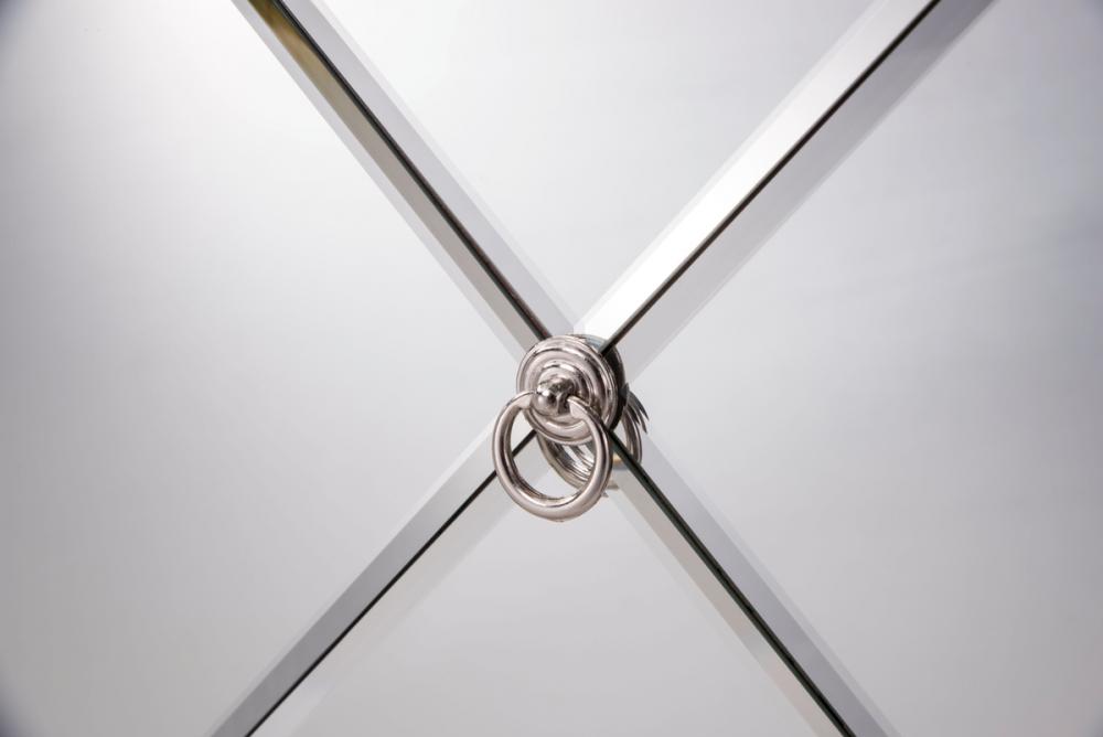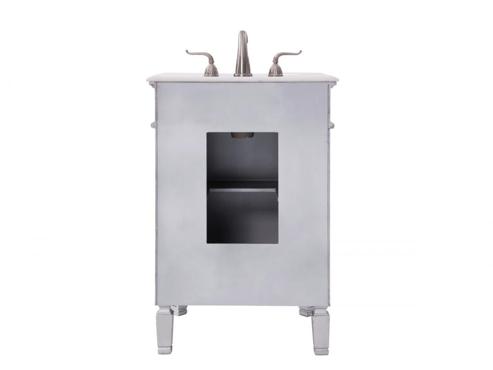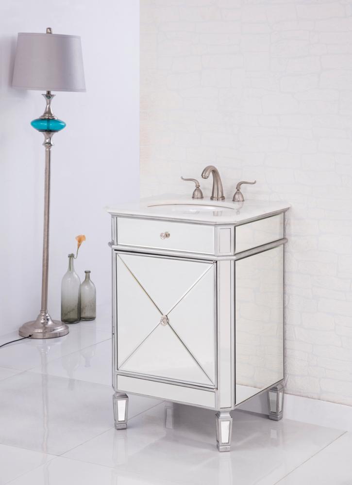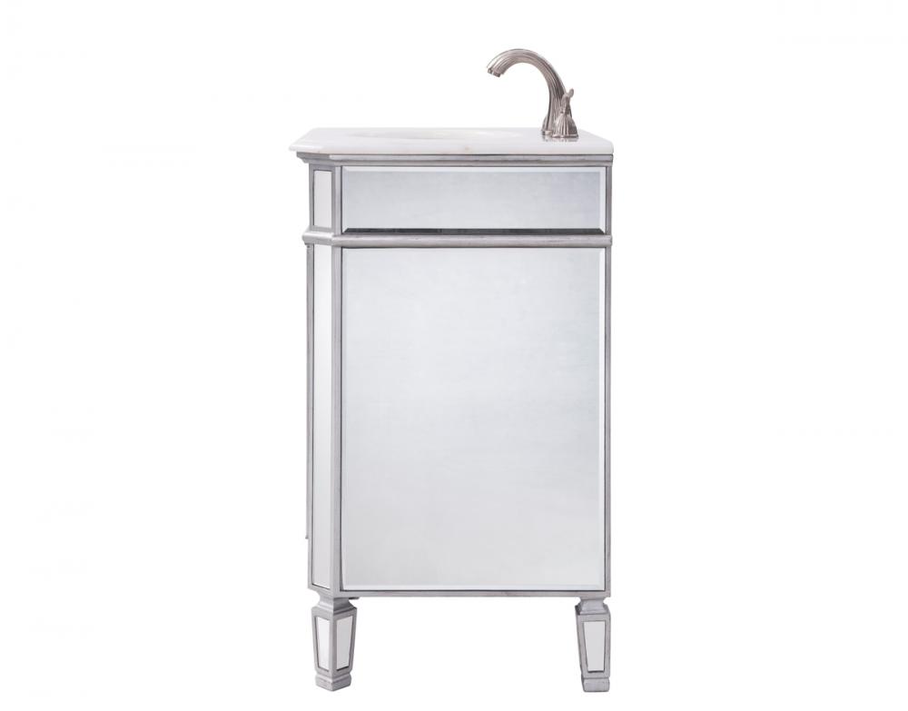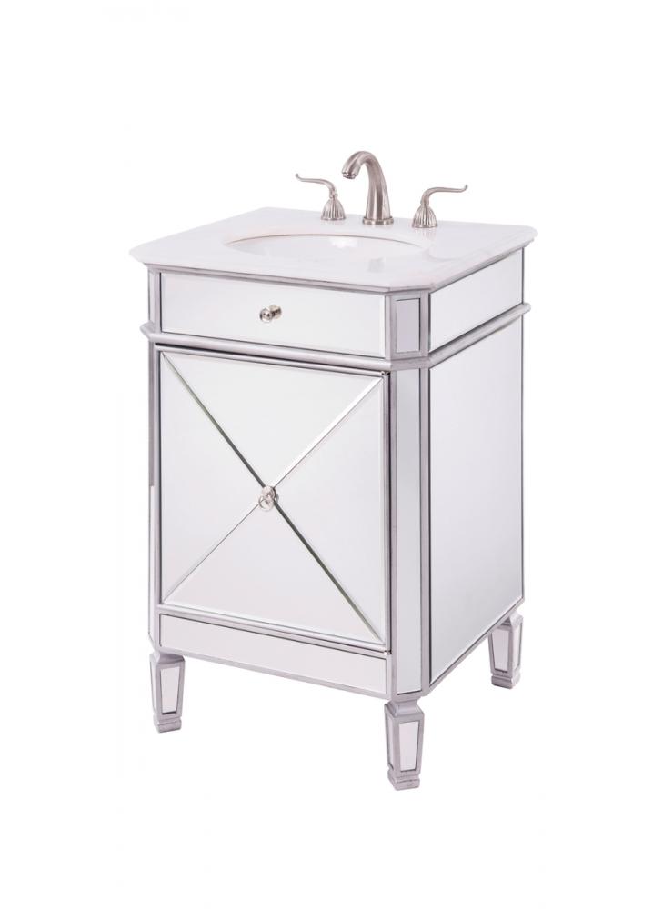 Beautiful vanity with an authentic carerra white marble top. The door is decorated in crisscrossed mirror panels in a hand-rubbed in silver finish. Decorated with brushed steel knobs and ring pull, this vanity will add a clean, sharp contemporary look and destine to please. Vanity ships ready to install.