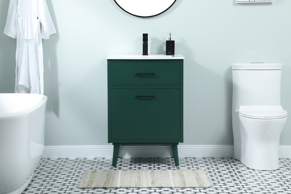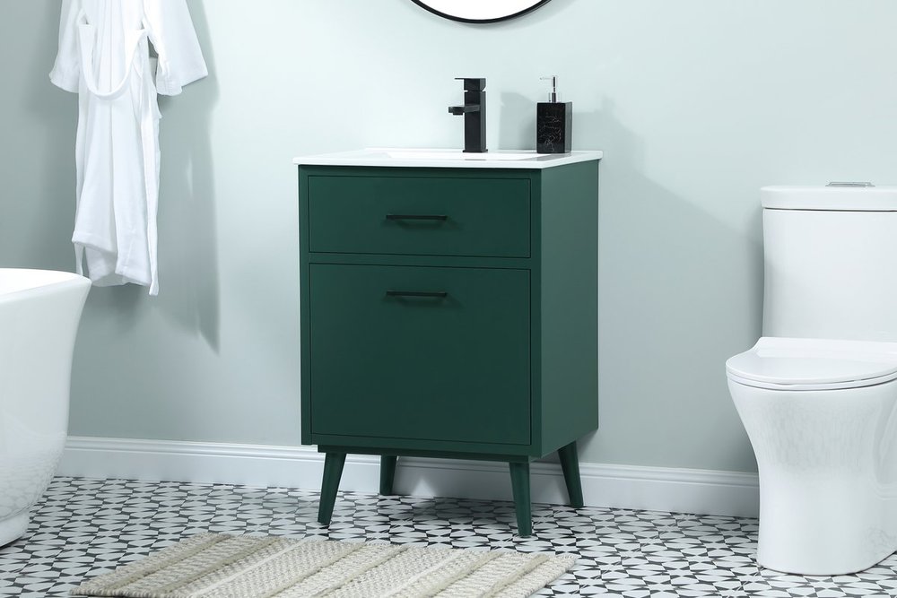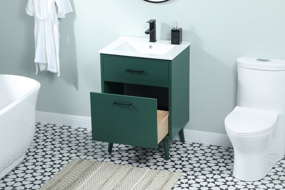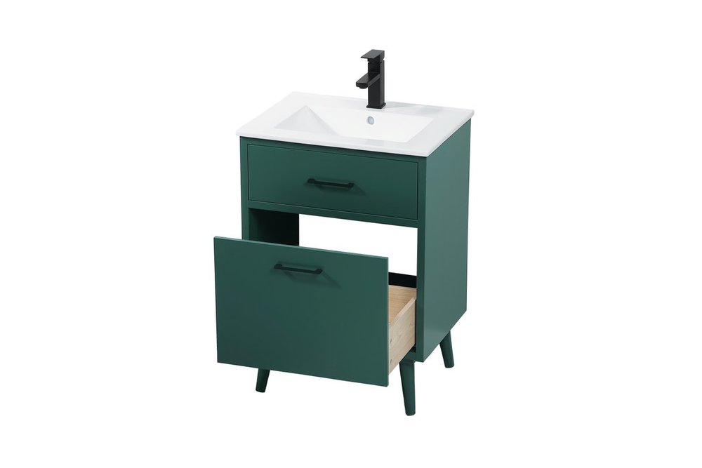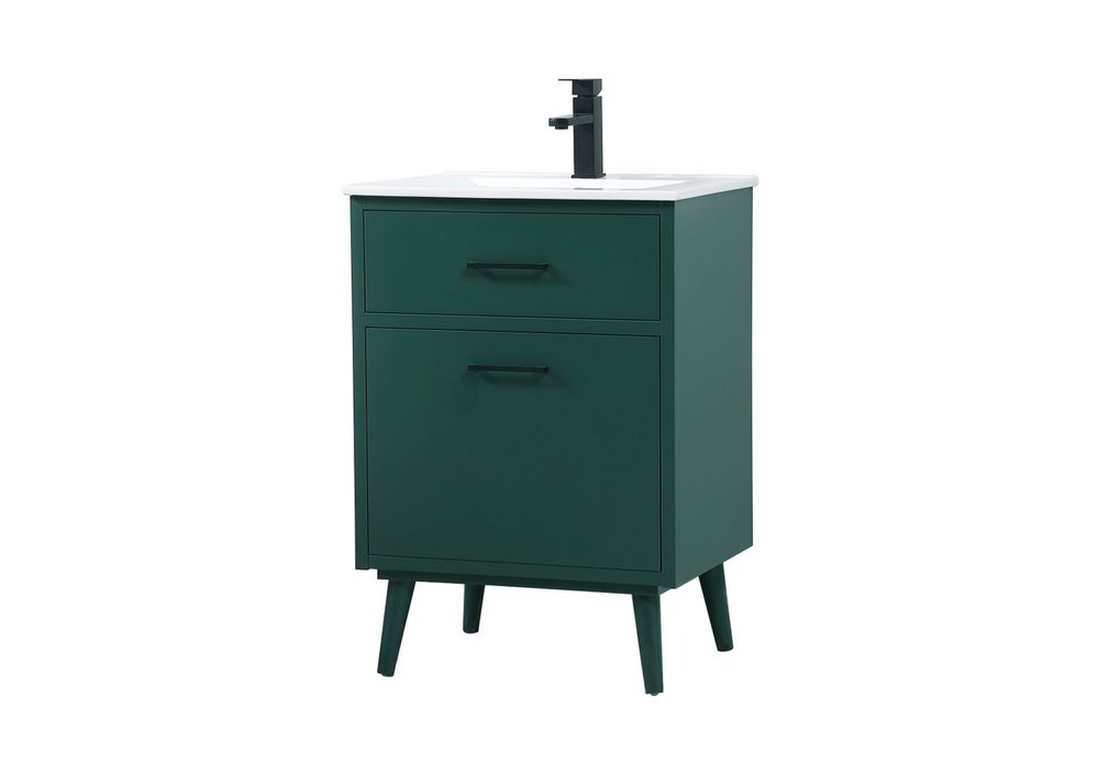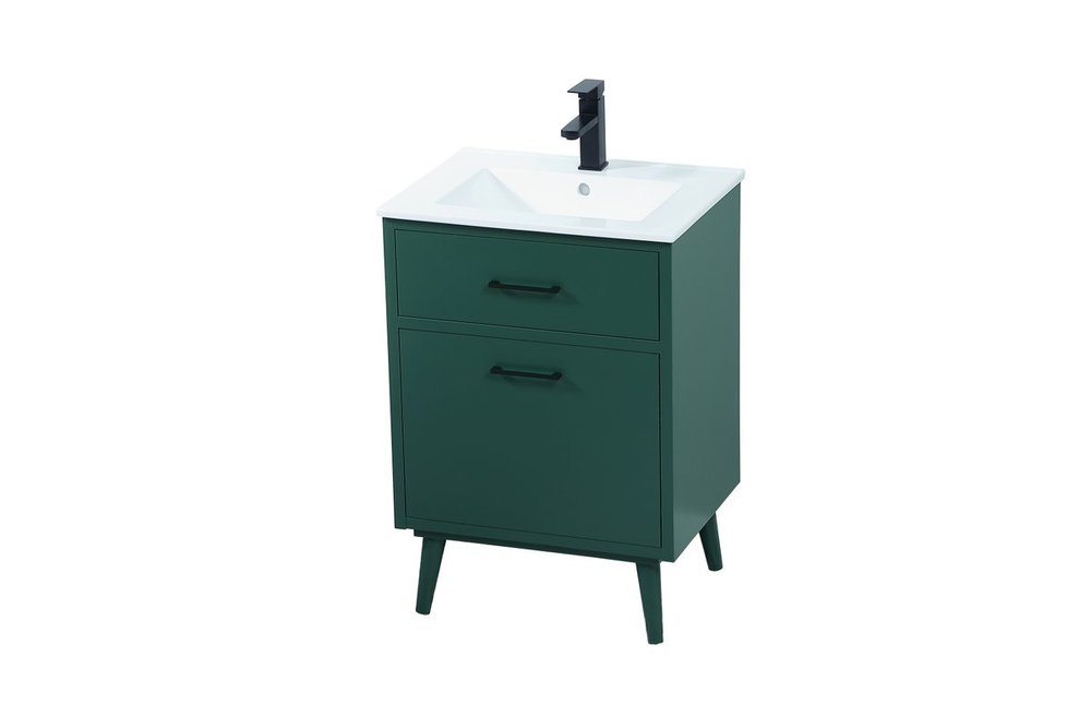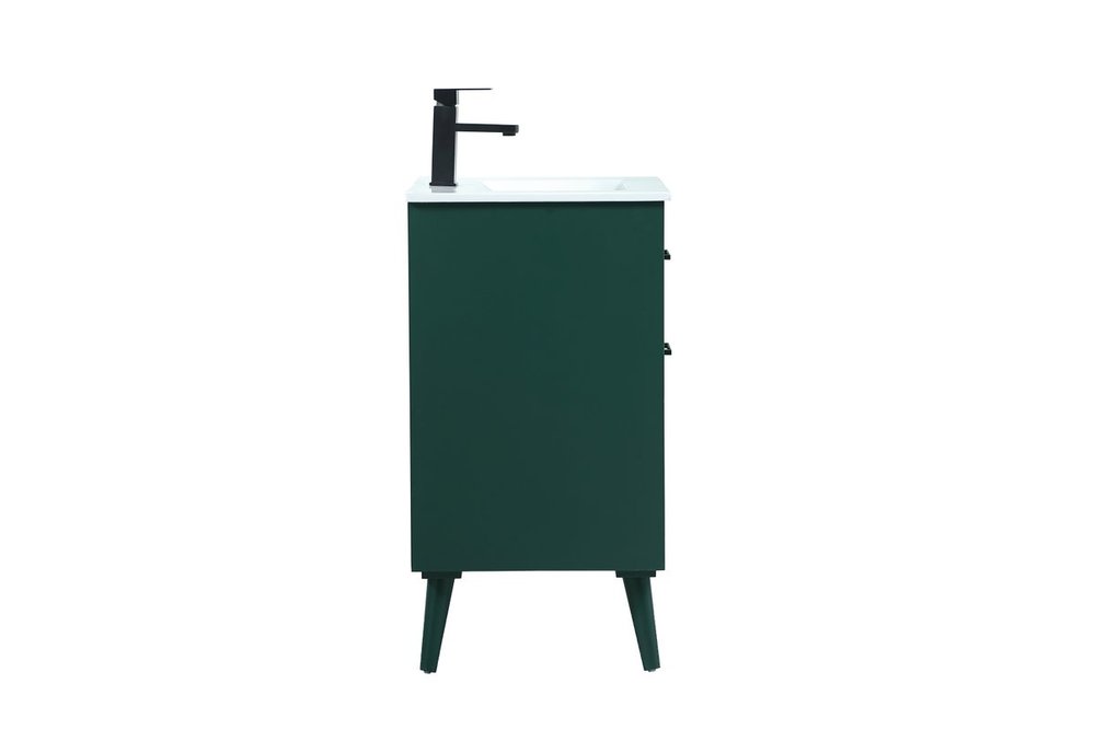 Delve into a world of minimalistic fashion and contemporary styling with this midcentury modern 18" vanity. The clean lines anchors the design, while the oblique tapered cylinder legs add subtle interest. A black handle adorns the top fake drawer hiding the base of the porcelain sink while another one allows you to pull the bottom drawer out, letting you store your bathroom necessities and toiletries. The compact size makes it the perfect vanity for any bathroom or powder room, regardless of size.