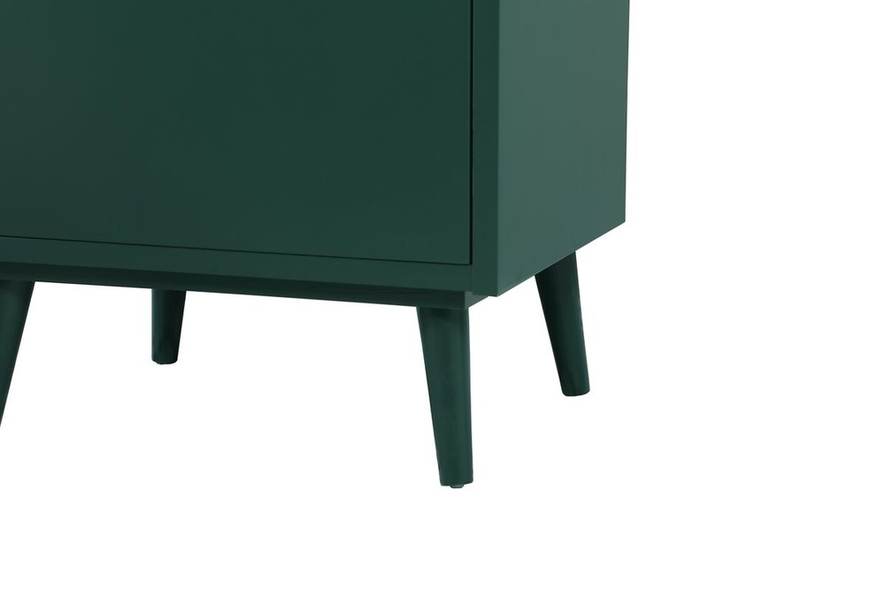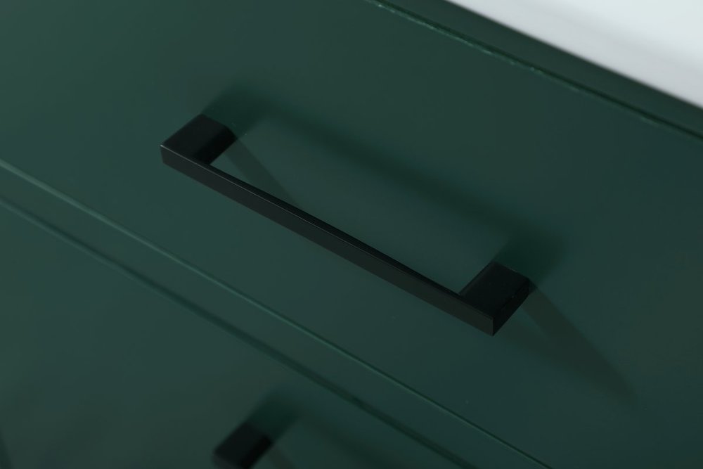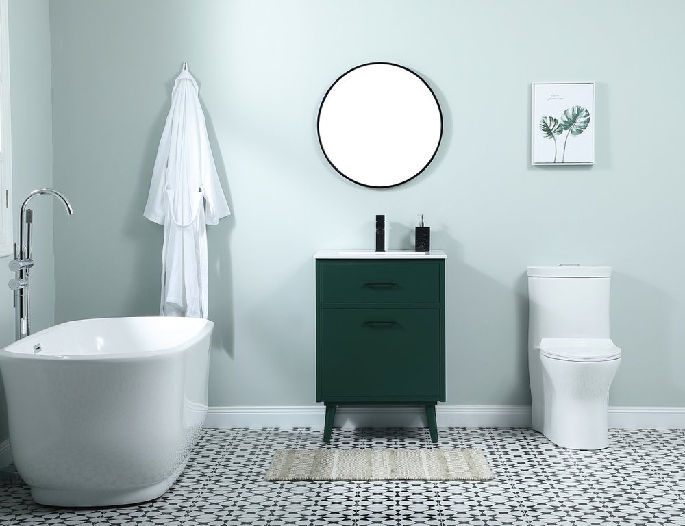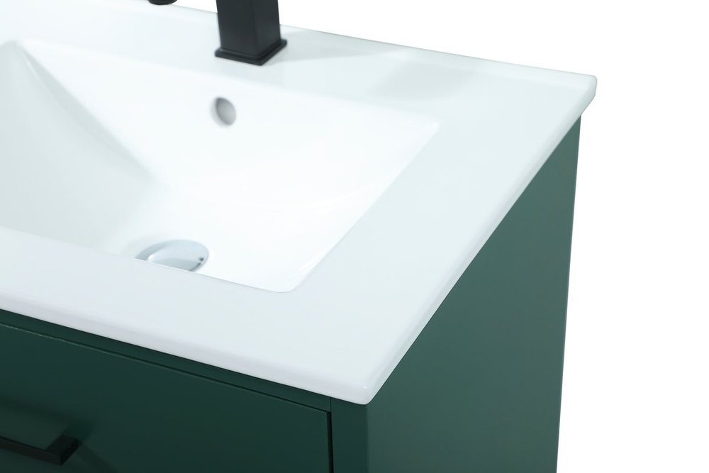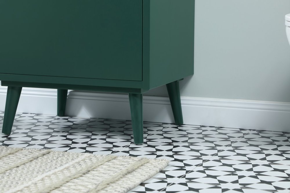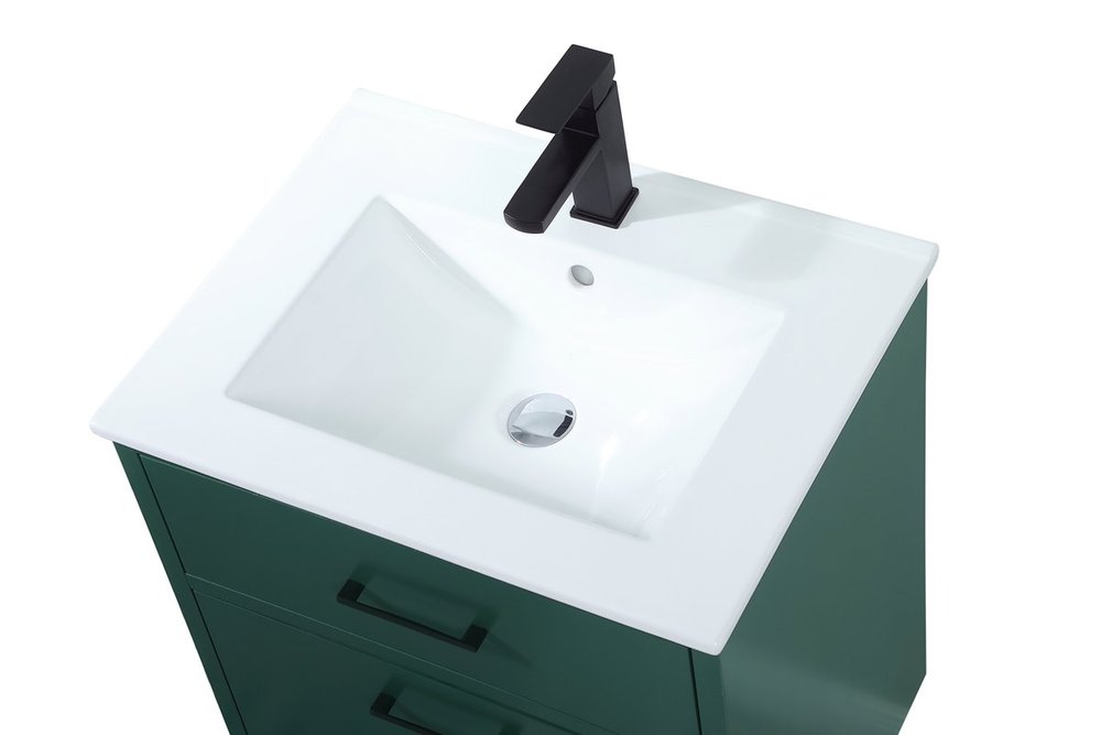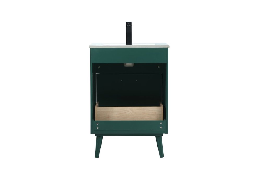 Delve into a world of minimalistic fashion and contemporary styling with this midcentury modern 18" vanity. The clean lines anchors the design, while the oblique tapered cylinder legs add subtle interest. A black handle adorns the top fake drawer hiding the base of the porcelain sink while another one allows you to pull the bottom drawer out, letting you store your bathroom necessities and toiletries. The compact size makes it the perfect vanity for any bathroom or powder room, regardless of size.