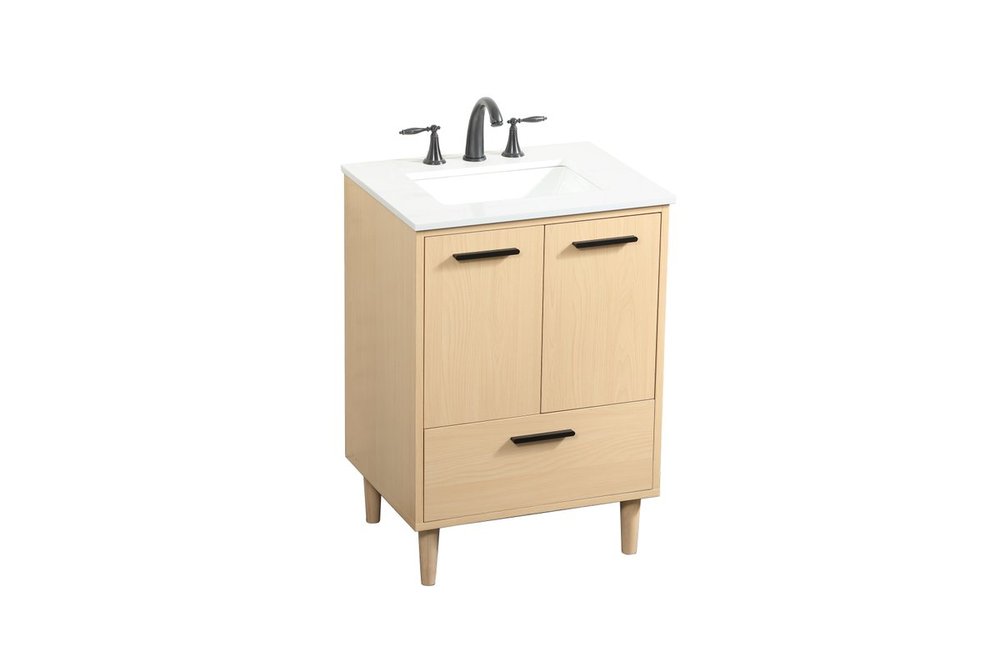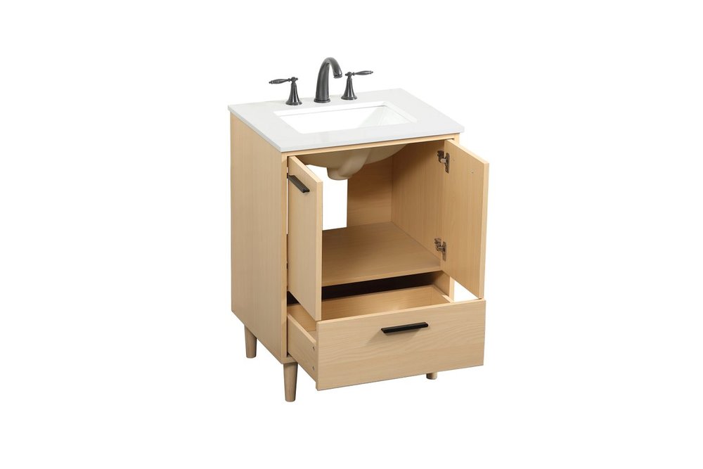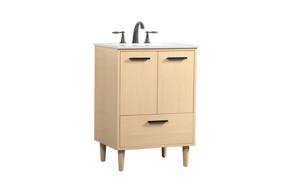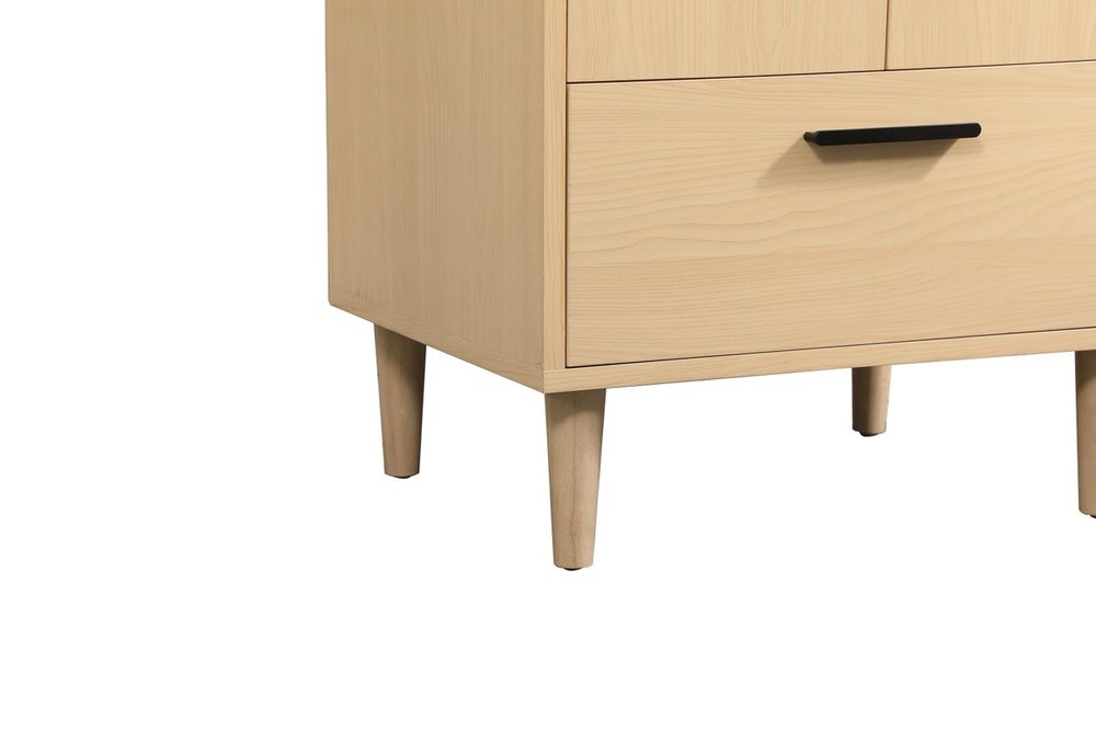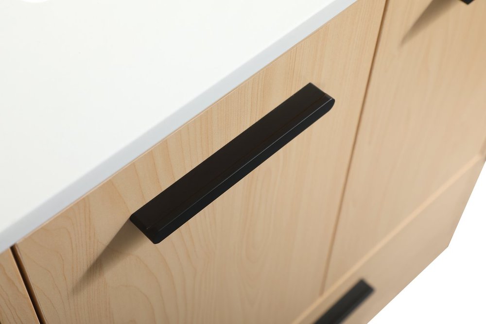 Modern sophistication is defined with the mape finish and black barpulls of this vanity and slender tapered legs. Its length makes it the perfect addition to any sized home, and saves space with its storage area hidden behind the double cabinet doors and one bottom drawer. Topped with a highly durable engineered stone countertop and a porcelain undermount sink, this modern design will become your focal point of your bathroom or powder room. Equipped with soft-closing drawer and doors adds a quiet functional touch.