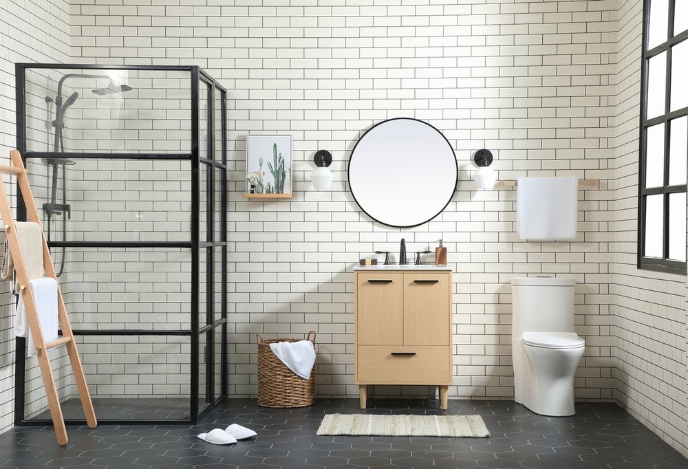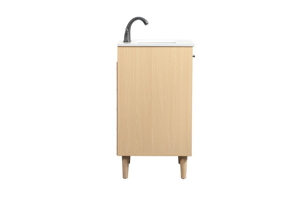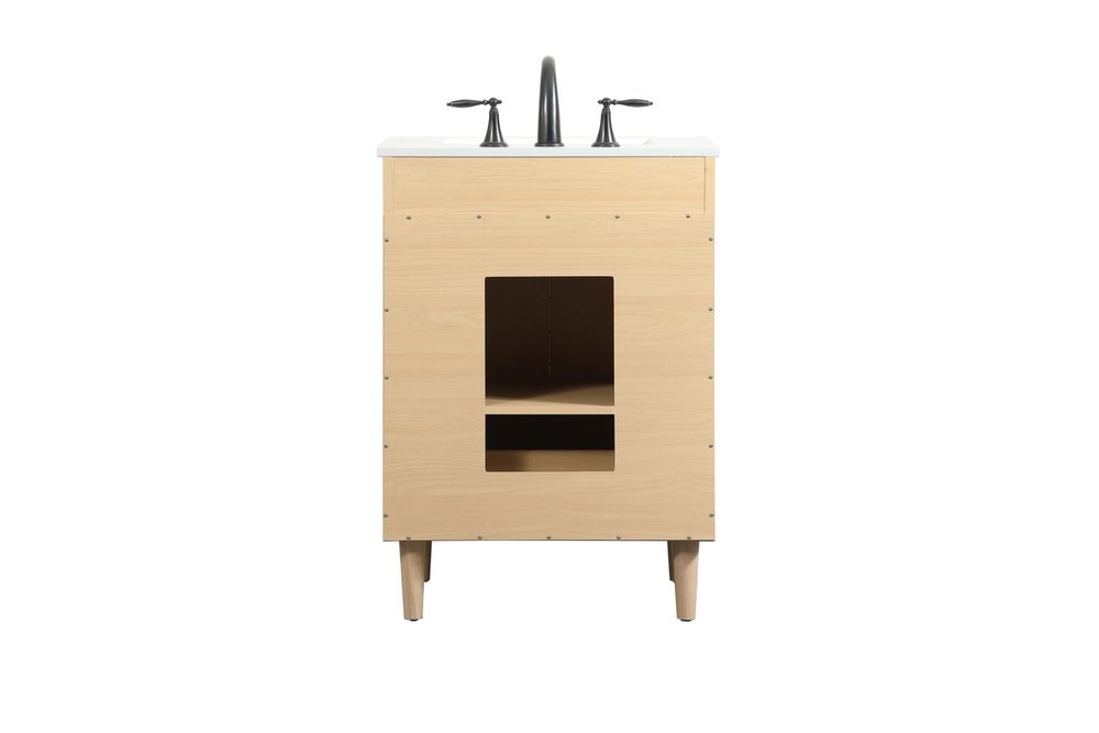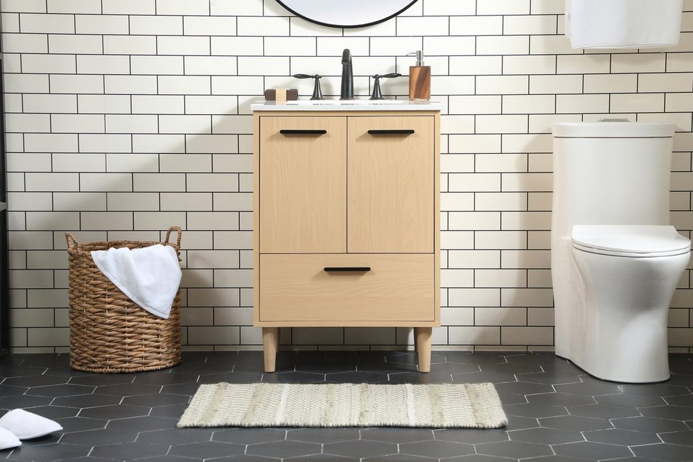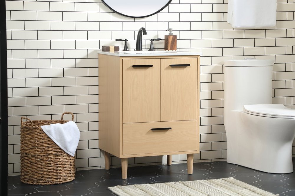 Modern sophistication is defined with the mape finish and black barpulls of this vanity and slender tapered legs. Its length makes it the perfect addition to any sized home, and saves space with its storage area hidden behind the double cabinet doors and one bottom drawer. Topped with a highly durable engineered stone countertop and a porcelain undermount sink, this modern design will become your focal point of your bathroom or powder room. Equipped with soft-closing drawer and doors adds a quiet functional touch.