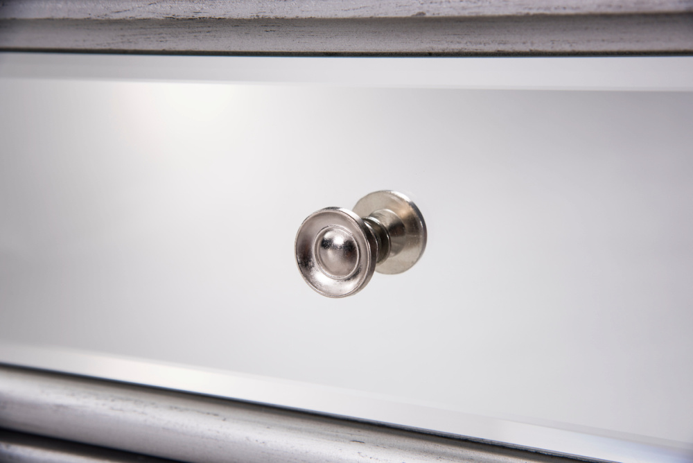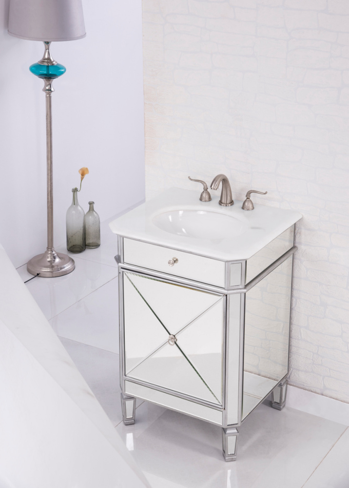 The glamorous bathroom vanity brings a tasteful statement to any home and office bathroom. Top with an ivory white engineered marble countertop, one faux front drawer in clear bevel-edged mirror and brushed steel hardware. Definitely will add a clean, sharp aesthetic appeal and destin to please. The cabinet is constructed of kiln-dried solid wood and MDF. The stone top is pre-drilled with eight inch spread faucet holes - the faucet is not included.