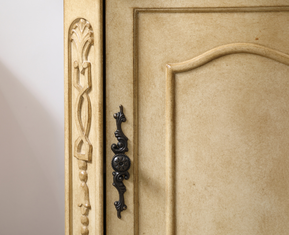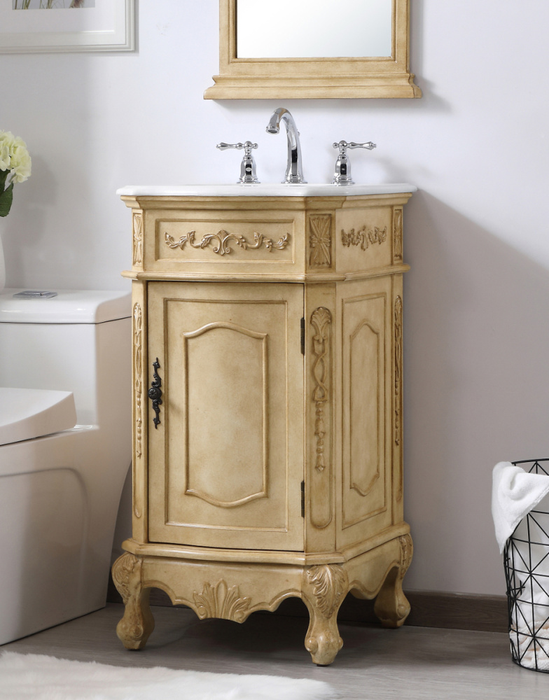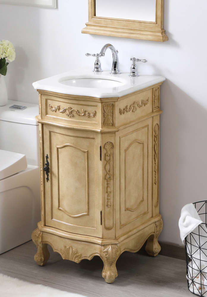 This superb balance of timeless tradition and opulent beauty in a engineered marble-topped vanity will certainly enhance the aesthetics of any home or office bathroom! Featuring an ivory white durable engineered marble countertop complimenting the hand painted cabinet with a delicate carved floral design, stands on stylishly carved solid wood French scroll feet. Don't let the design fool you, the engineered marble countertop and porcelain undermount sink allows for space to get ready, while the antique bronze hardware allows you to discover storage spaces with ease. You and your guests will marvel at this vanity that will both store away your bathroom essentials and enhance the aesthetics of your room.