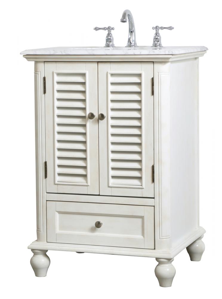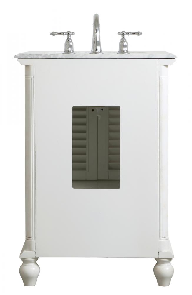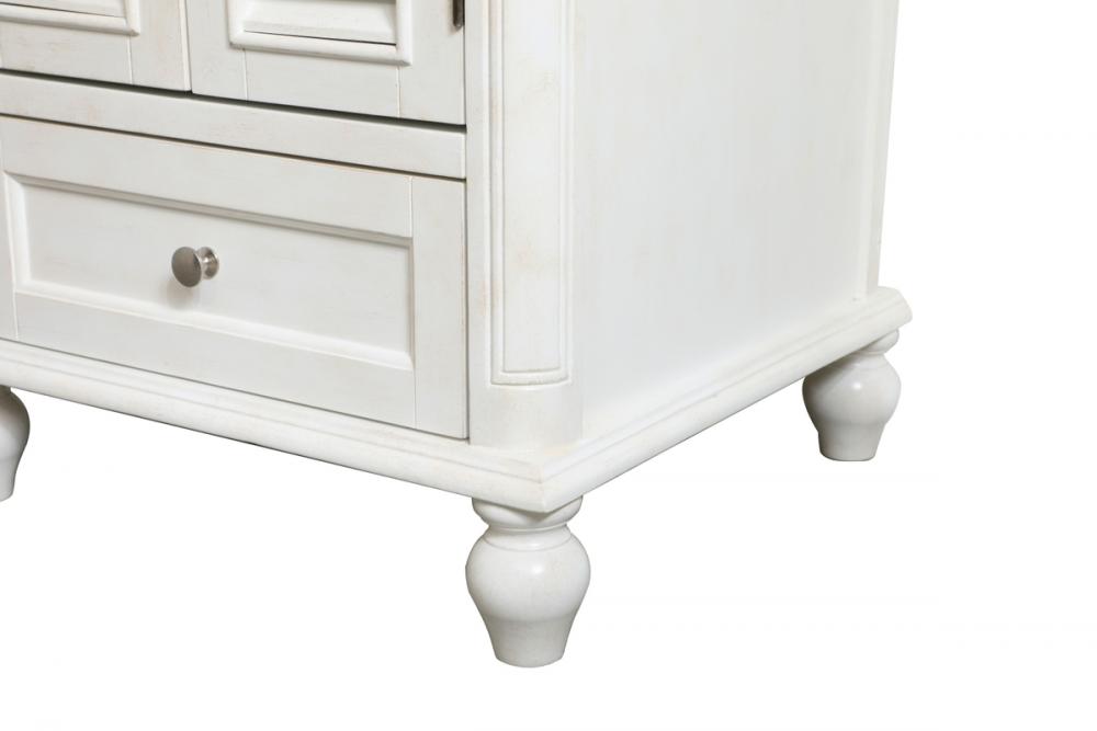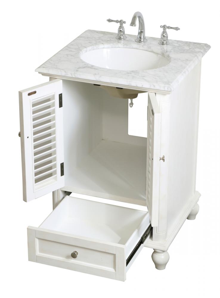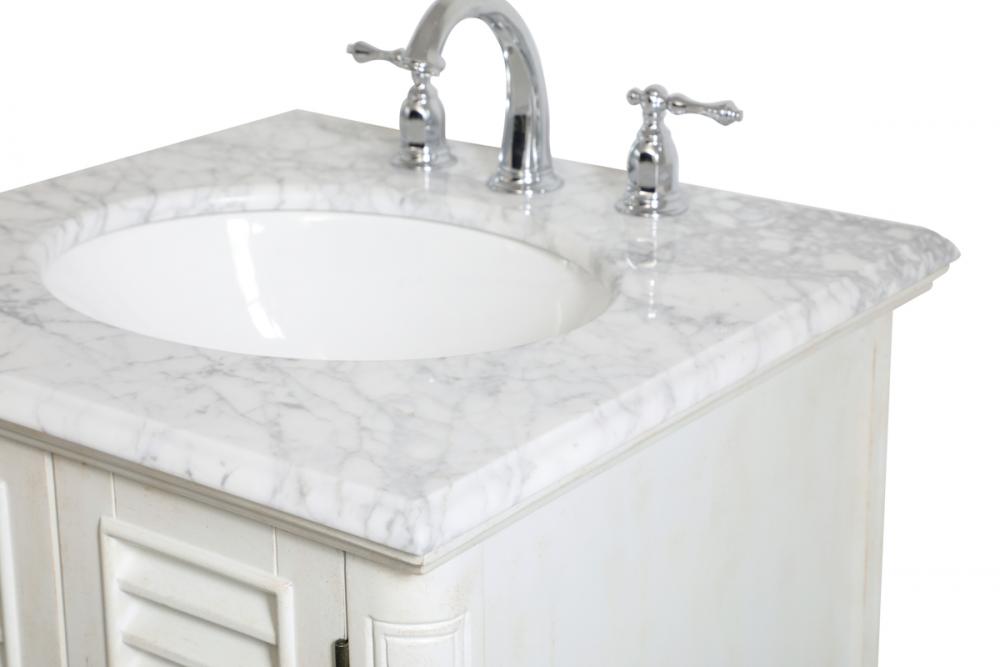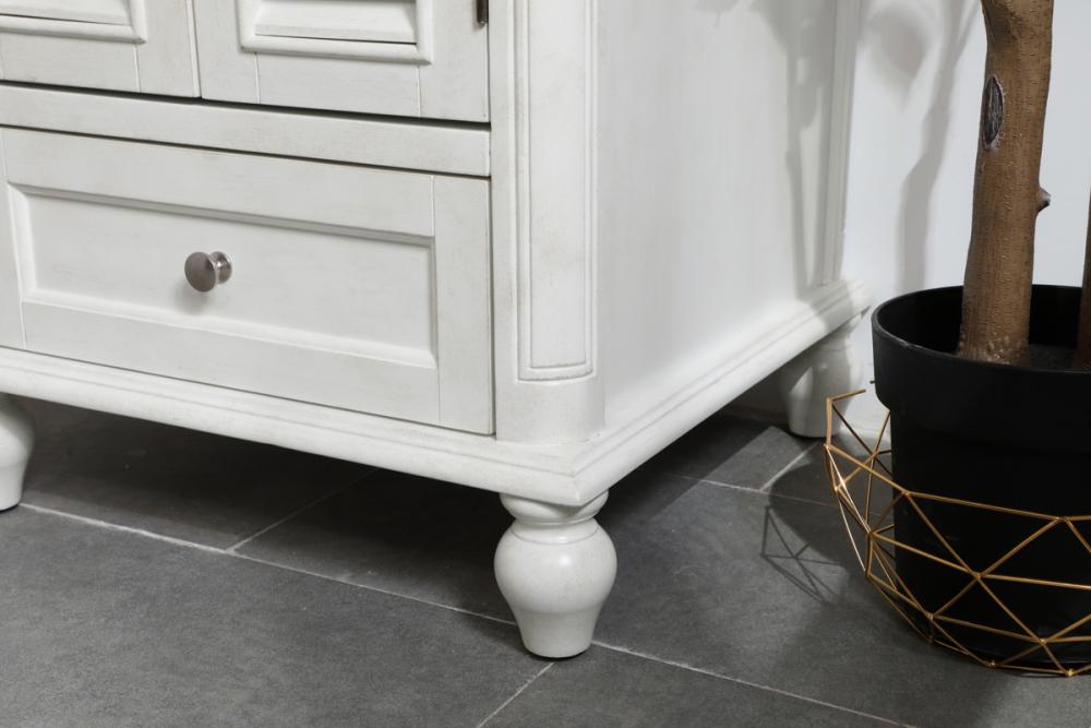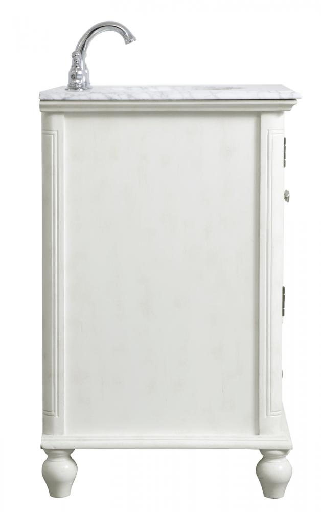 A small space doesn't mean you have to settle for less. The Rhodes collection compact vanity in an antique white finish will add lovely sophistication and complement any small bathroom or powder room, while utilizing its charm and function to provide you with ample storage spaces. Brushed nickel knobs gently adorn the shuttered cabinet doors and drawer at the base, allowing for you to store away your bathroom essentials. The Carrara white marble countertop, porcelain undermount sink, dignified subtle engravings on the side edges, and rounded legs all come together to create contemporary beauty. Work with your space, and design a beautiful room, no matter the size.
