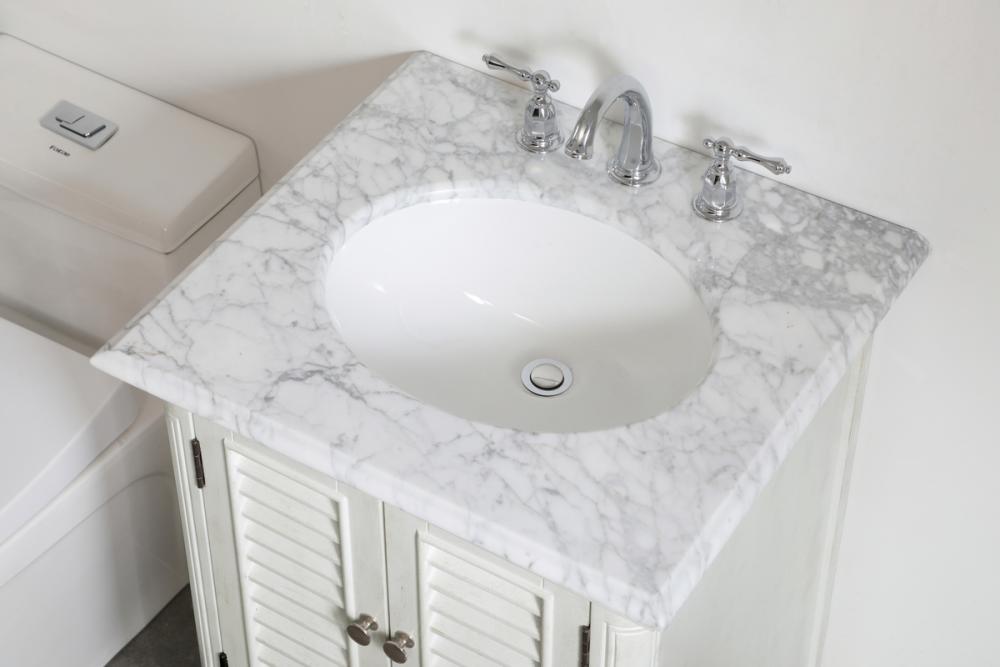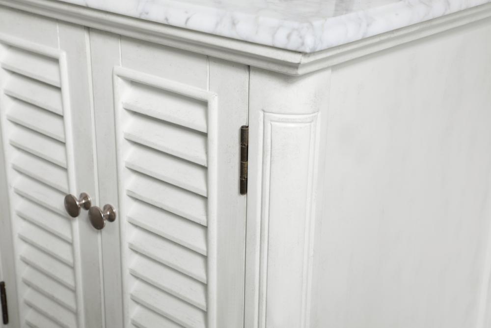Distressed antique white finish with a luxurious carrara white marble countertop