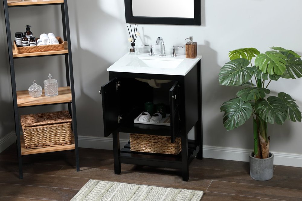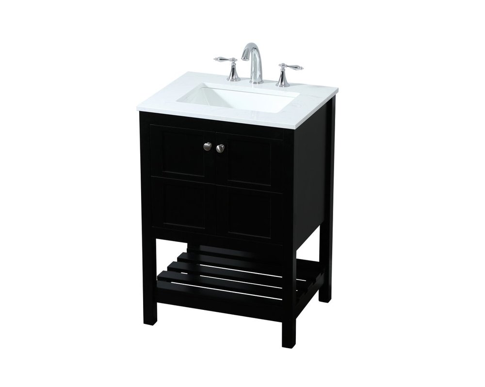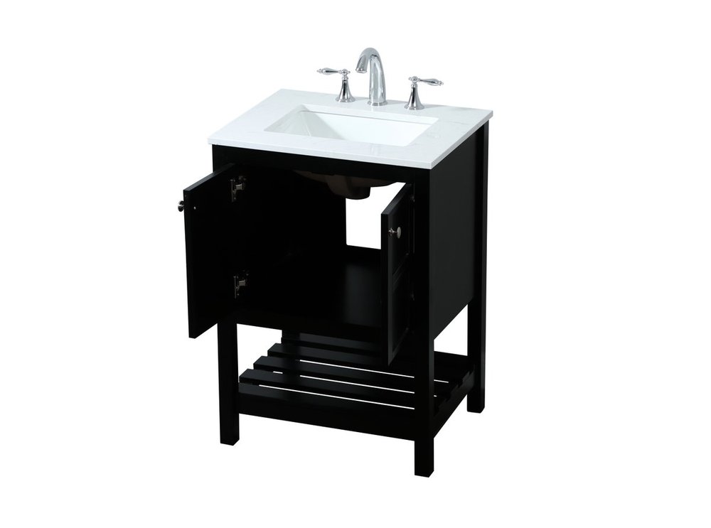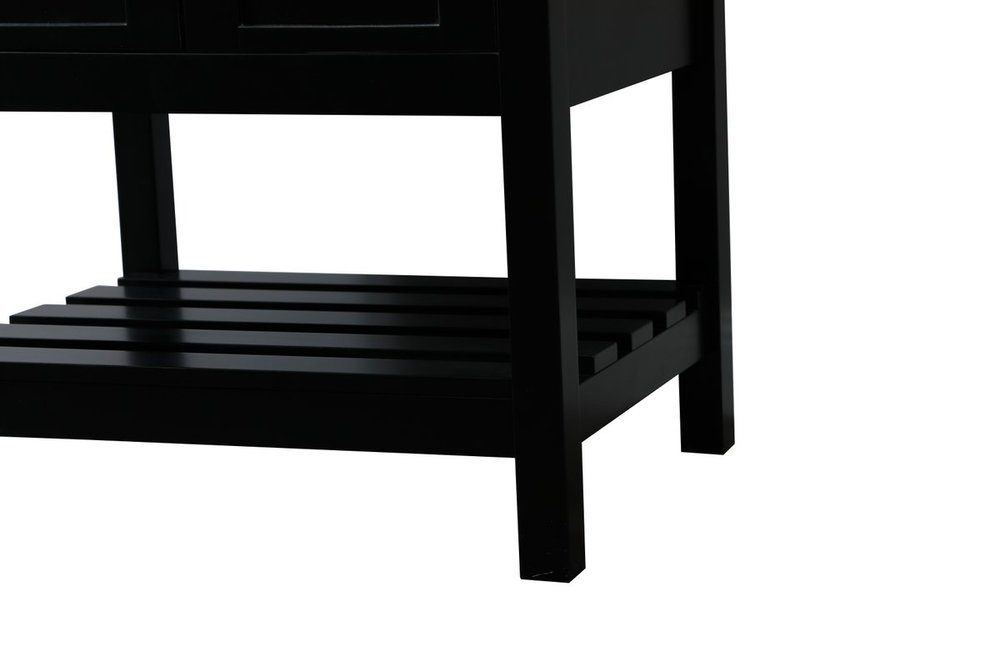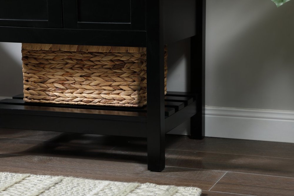 The subtle beauty of the Theo collection vanity exudes comfortable luxury. Its modern, yet traditional beauty will surely dress up your bathroom or powder room without any fuss. The calacatta engineered marble countertop and porcelain undermount sink shows quiet opulence, and the legs support upright without fail. Brushed nickel hardware complements the classic black finish, with pulls adorning the two cabinet doors, showcasing ample storage space within. Slated shelf allows for additional space to organize your towels. Whether this vanity is in your bathroom or for guests, its presence will surely elevate the aesthetics of your room.