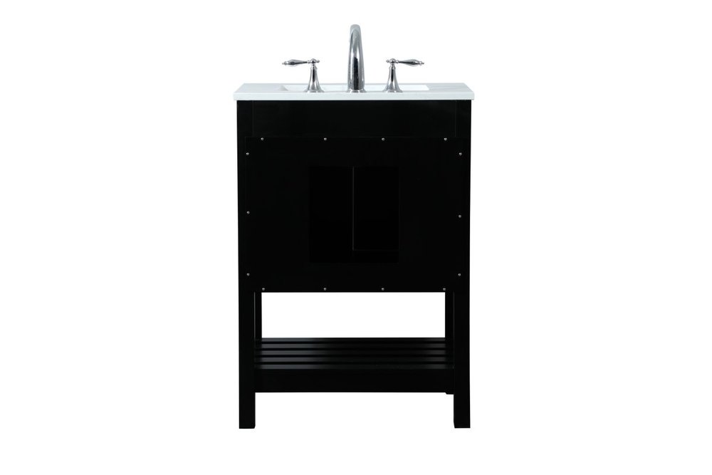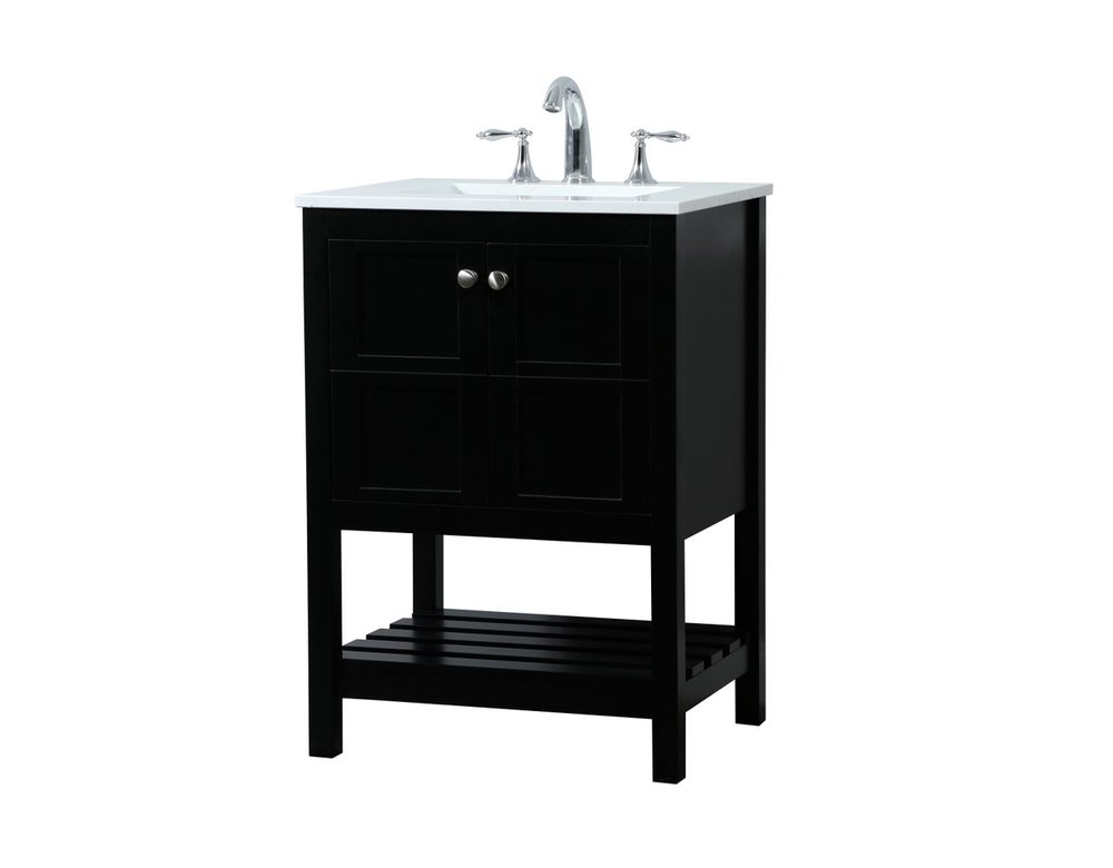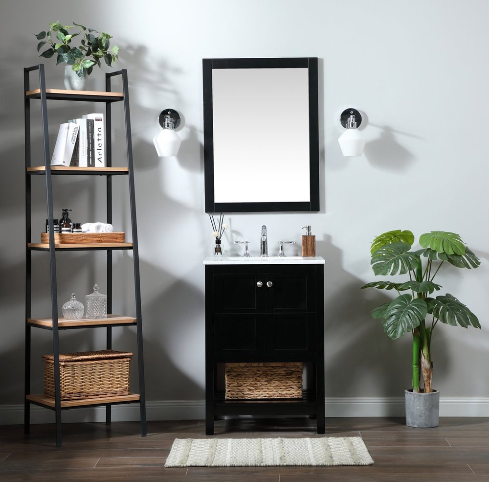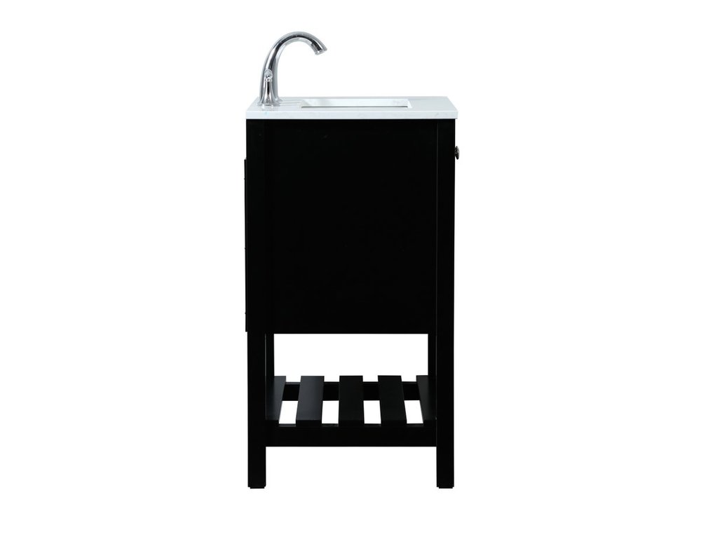 The subtle beauty of the Theo collection vanity exudes comfortable luxury. Its modern, yet traditional beauty will surely dress up your bathroom or powder room without any fuss. The calacatta engineered marble countertop and porcelain undermount sink shows quiet opulence, and the legs support upright without fail. Brushed nickel hardware complements the classic black finish, with pulls adorning the two cabinet doors, showcasing ample storage space within. Slated shelf allows for additional space to organize your towels. Whether this vanity is in your bathroom or for guests, its presence will surely elevate the aesthetics of your room.