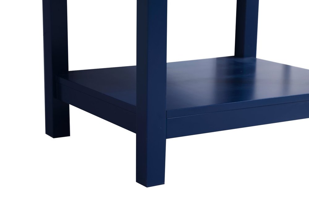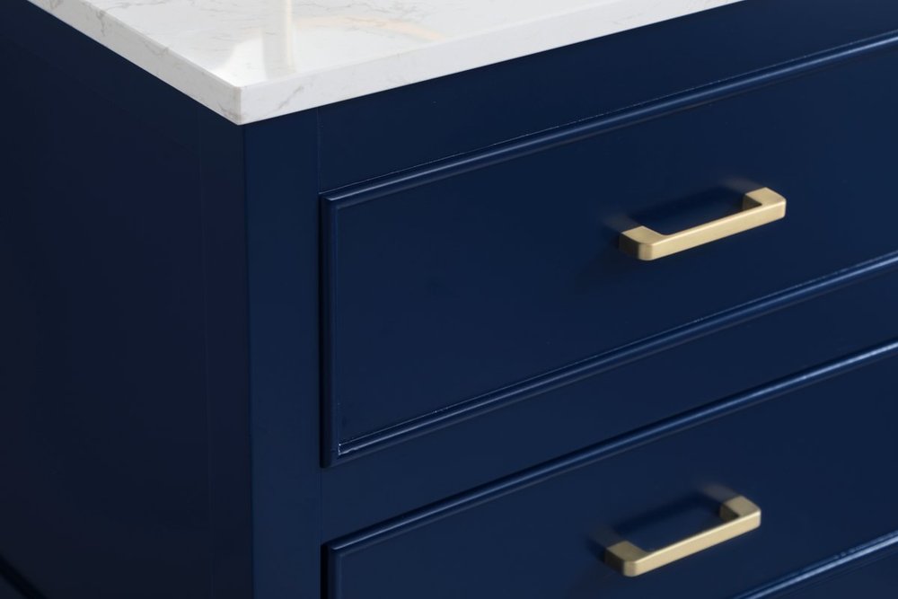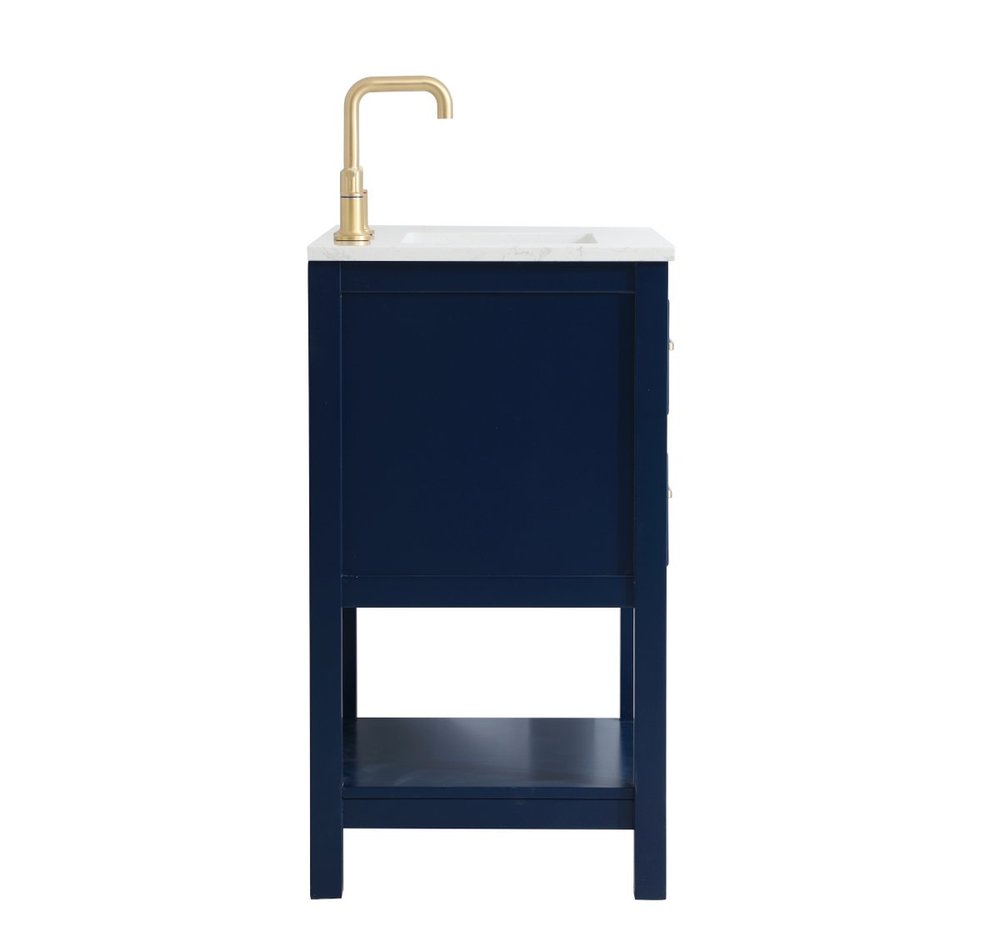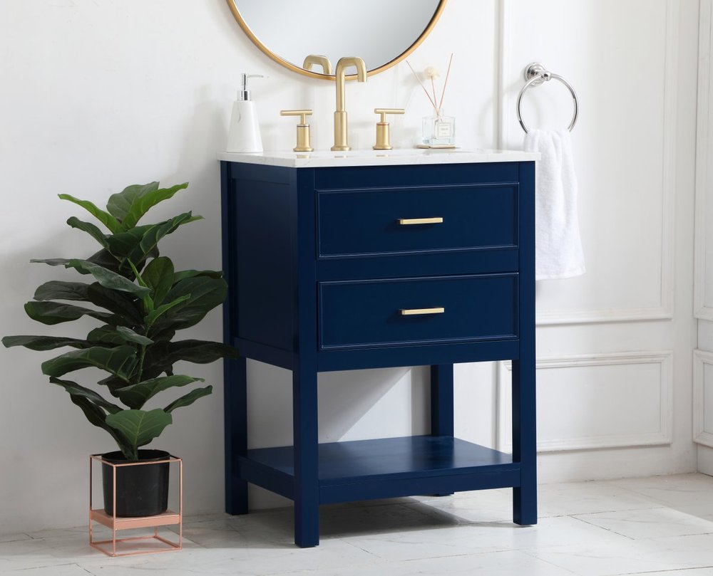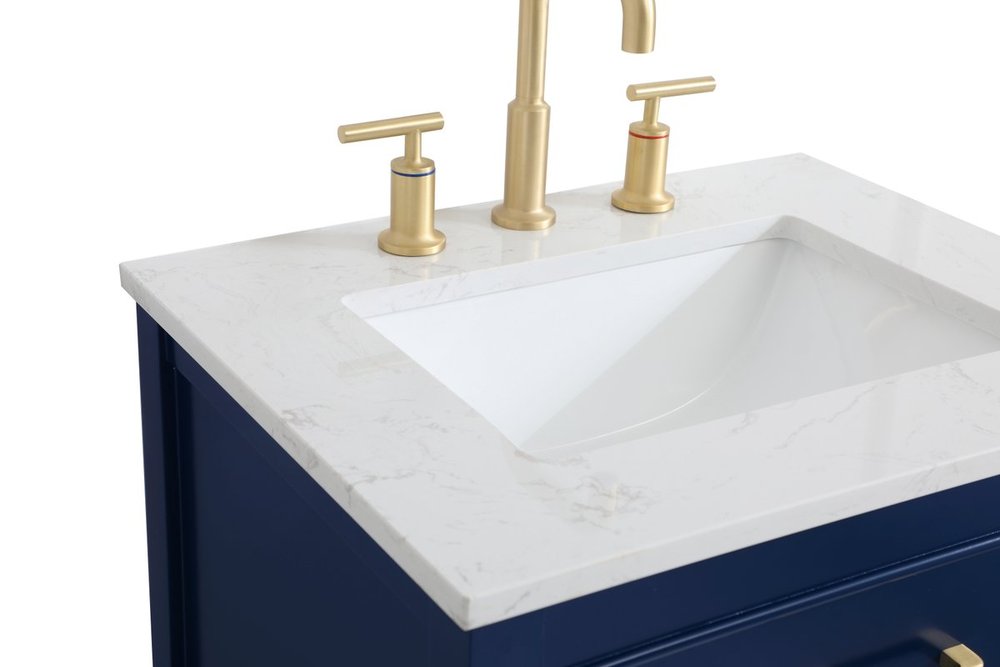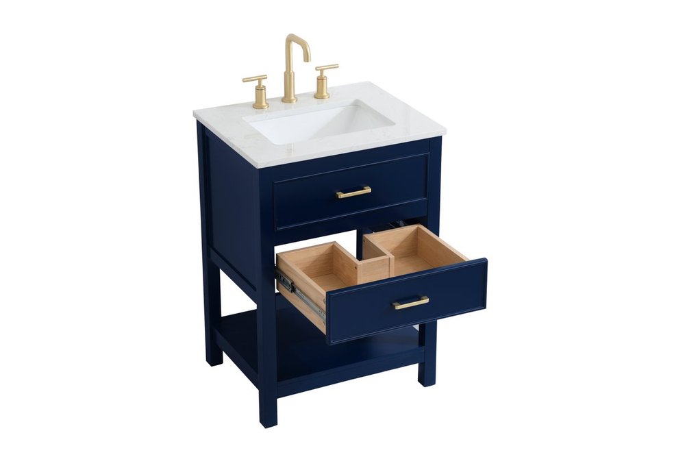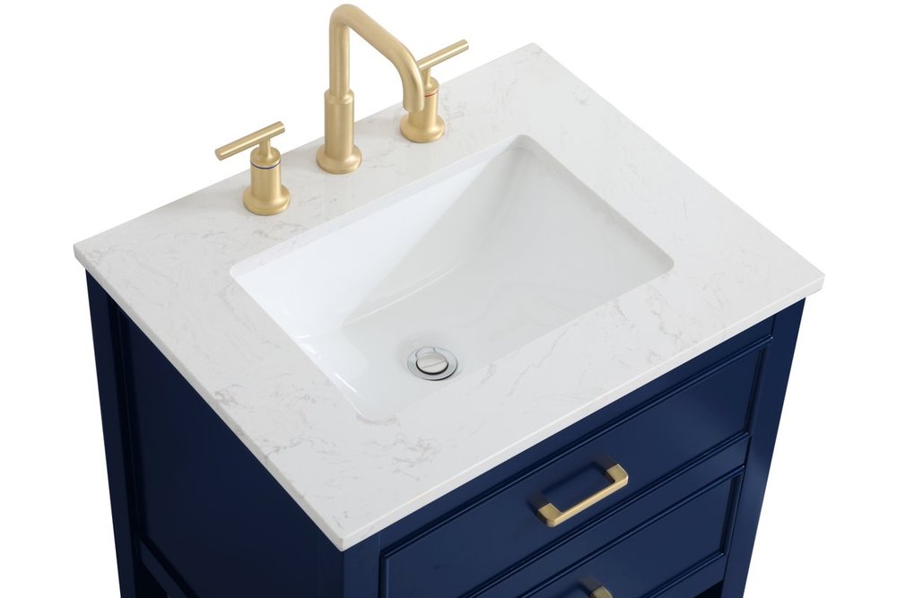 Make the most of your space with this 24" traditional style bathroom vanity. Its traditional style is able to complement many aesthetics with its blue finish, Calacatta engineered marble countertop, and the contemporary slender gold finish handle bar that sits on the upper false drawer and the lower u-shaped drawer, allowing you to store an assortment of bathroom essentials. The lower shelf makes it the perfect space to hold new towels for your guests. This compact vanity ensures both form and function in your bathroom or powder room for you and your guests.