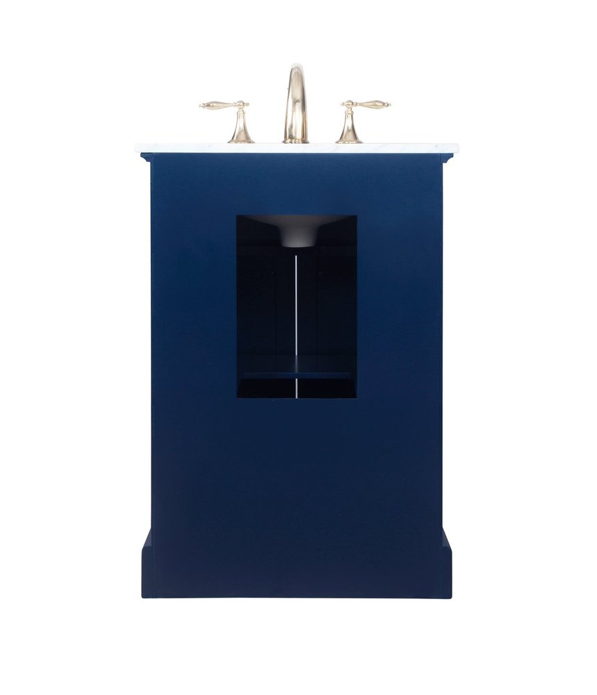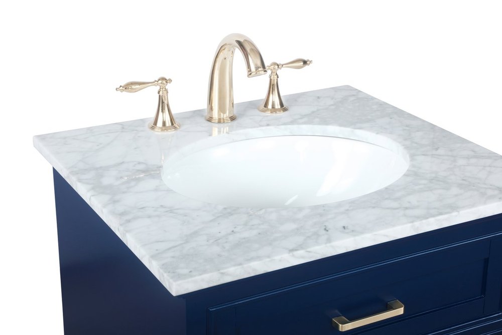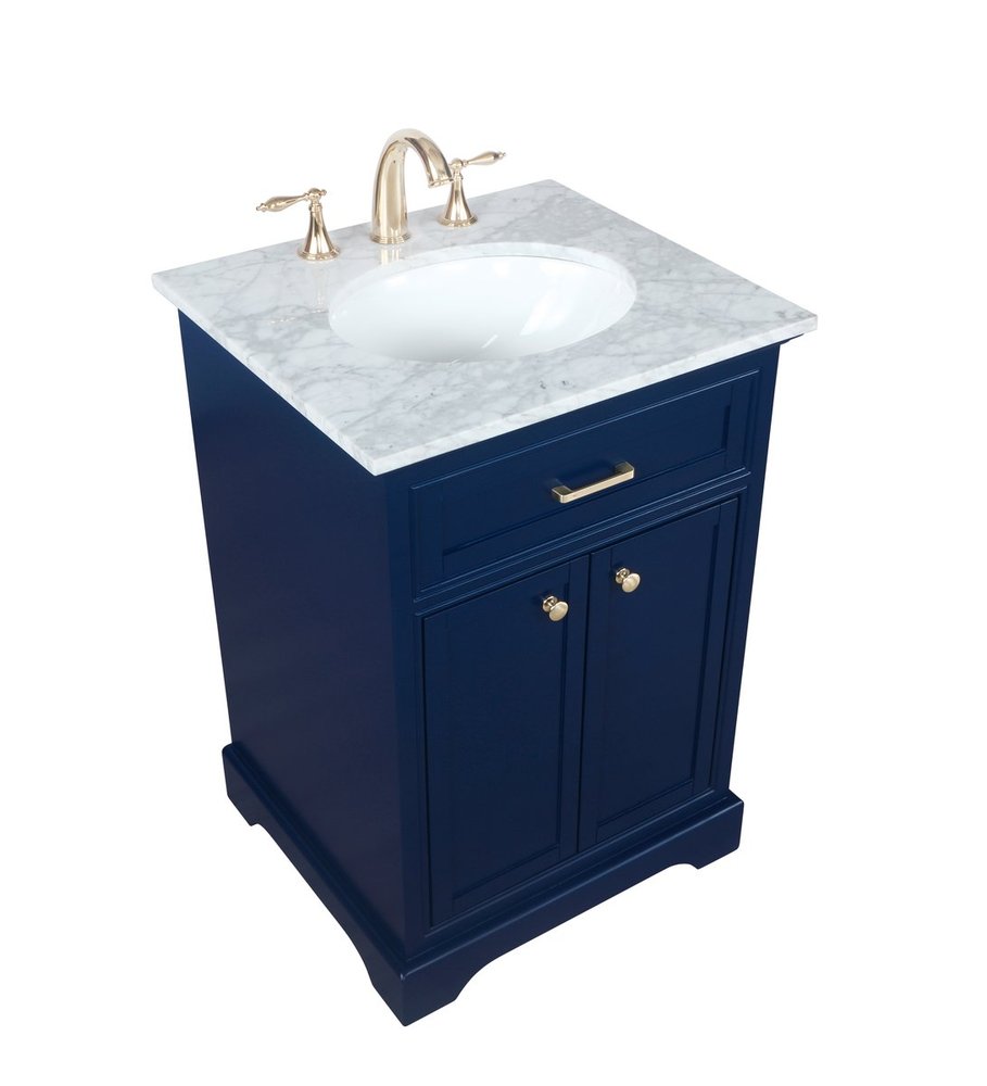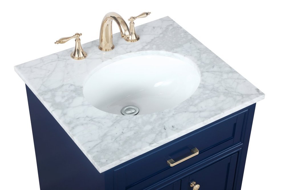 From its Italian Carrara white marble top to its contemporary-styled hand painted blue cabinet, this member of our “Americana” vanity collection is sure to enhance either your home or office bathroom. Beneath its lustrous, natural marble top and an oval, white porcelain under mount sink, a handsome 2-door cabinet with a Single shelf for all your bathroom essentials, highlighted with recessed panel doors, brushed gold bar handle and knobs, stands on strong solid pedestal feet. A wonderful balance of simplicity and practical function! Measurements: W24”xD21.5”xH35”