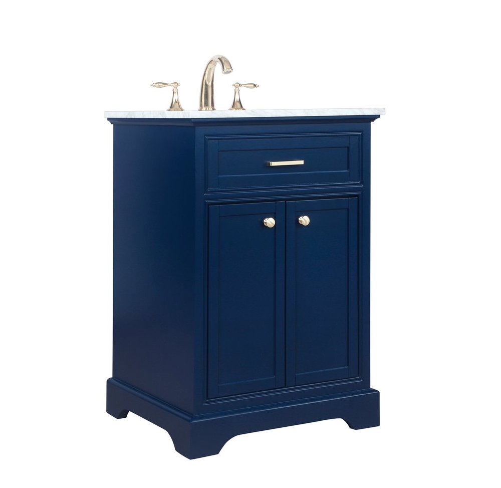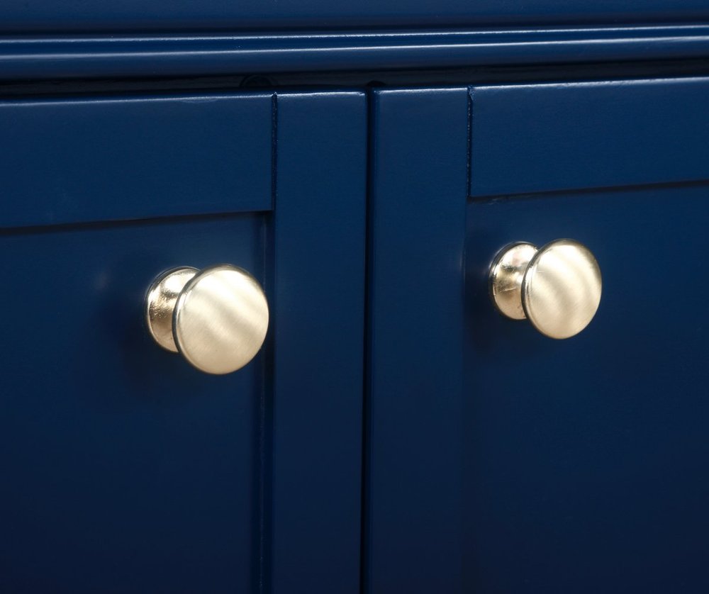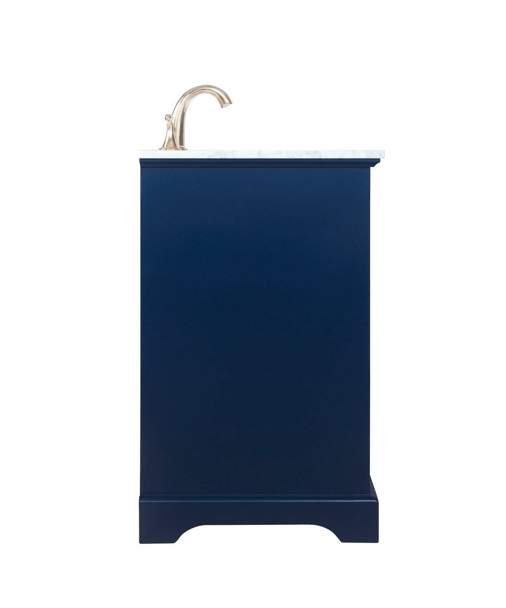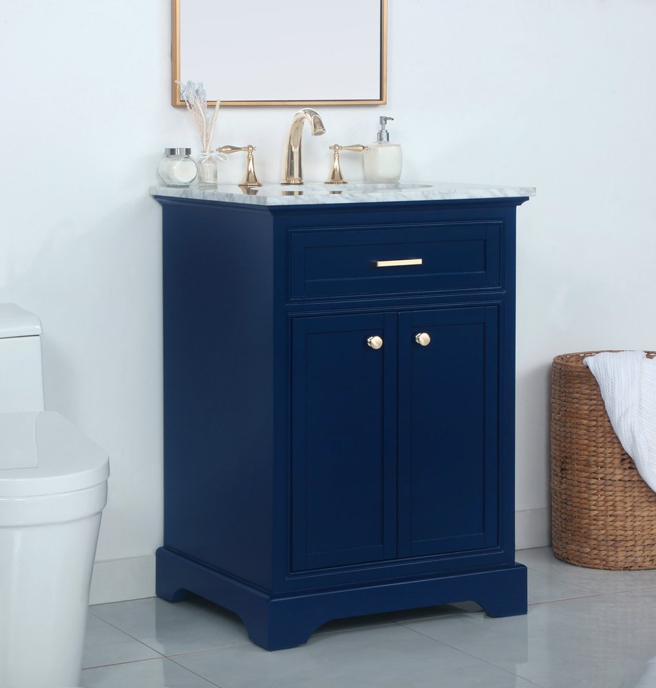 From its Italian Carrara white marble top to its contemporary-styled hand painted blue cabinet, this member of our “Americana” vanity collection is sure to enhance either your home or office bathroom. Beneath its lustrous, natural marble top and an oval, white porcelain under mount sink, a handsome 2-door cabinet with a Single shelf for all your bathroom essentials, highlighted with recessed panel doors, brushed gold bar handle and knobs, stands on strong solid pedestal feet. A wonderful balance of simplicity and practical function! Measurements: W24”xD21.5”xH35”