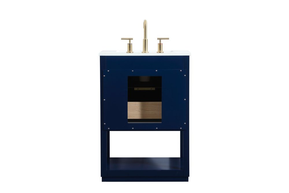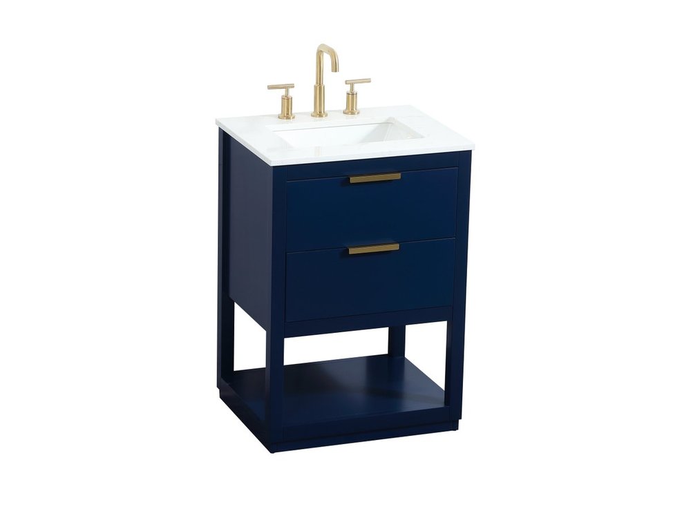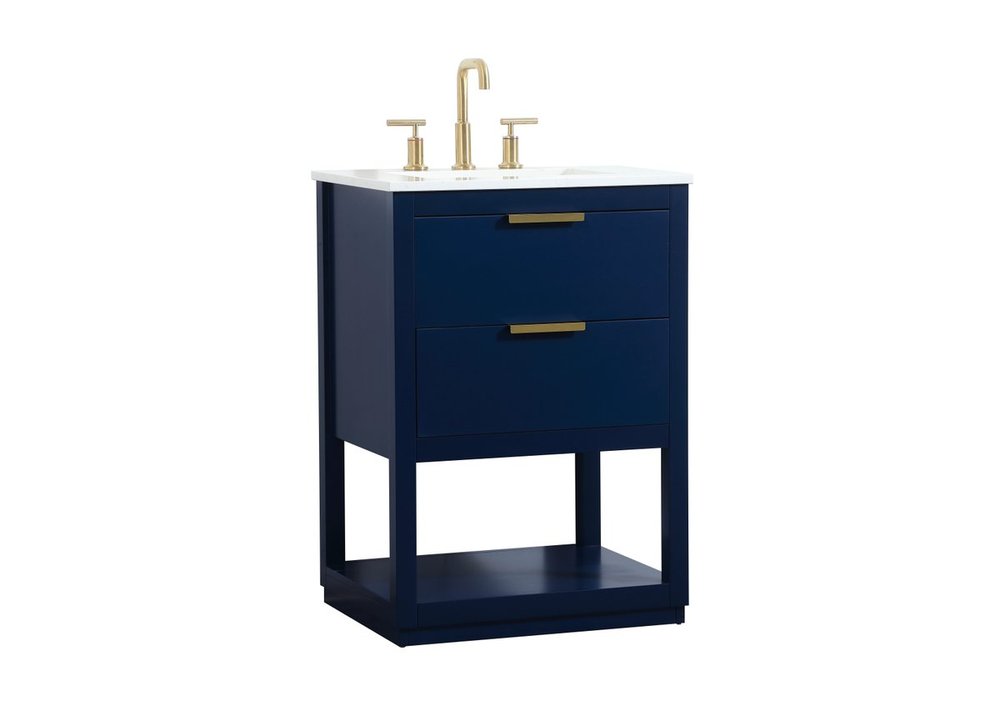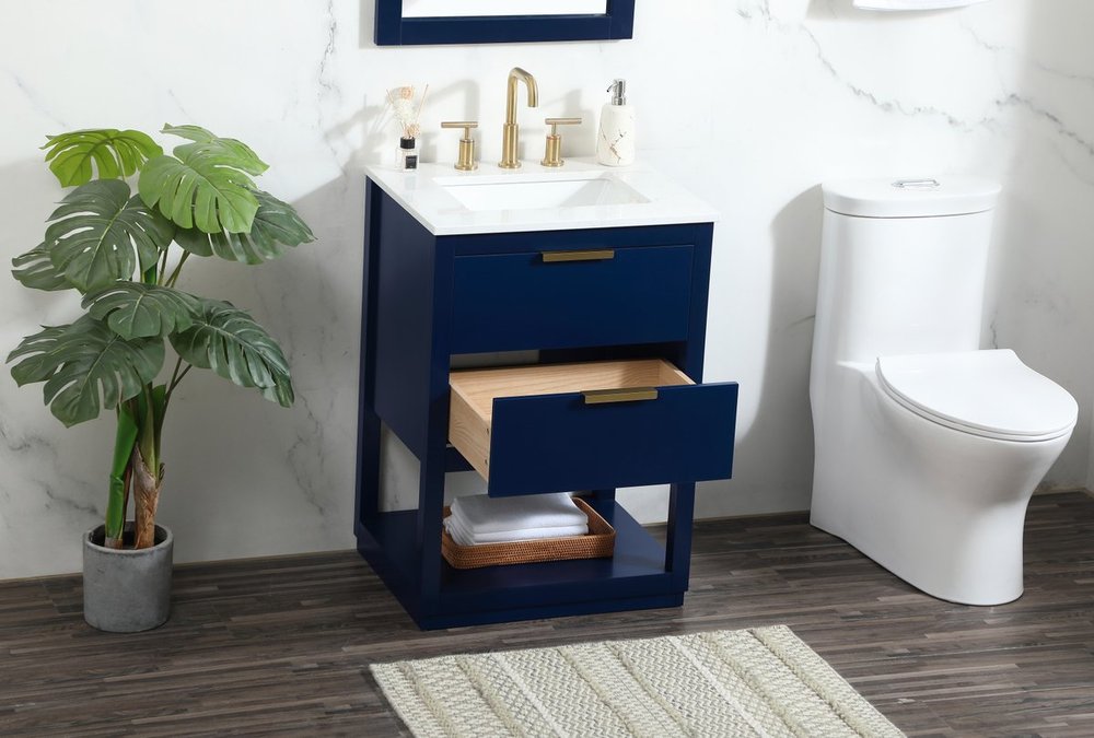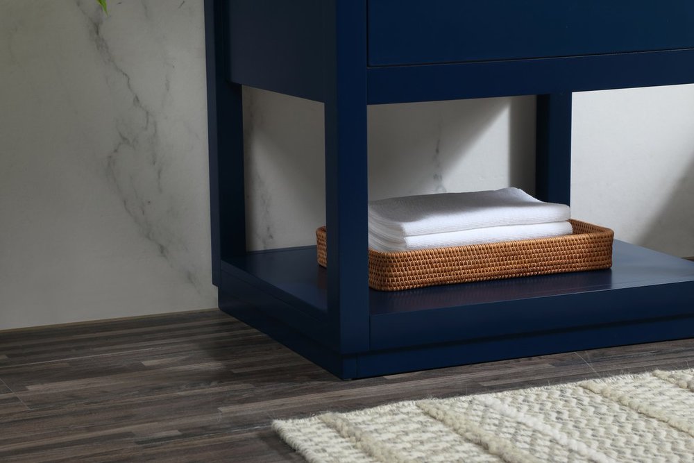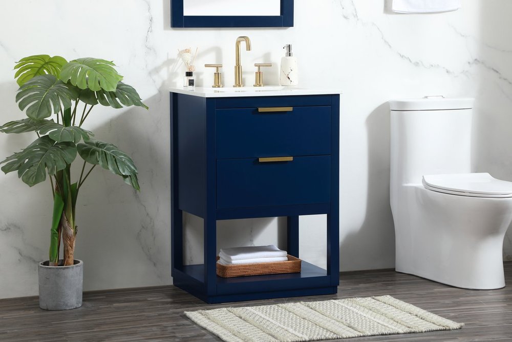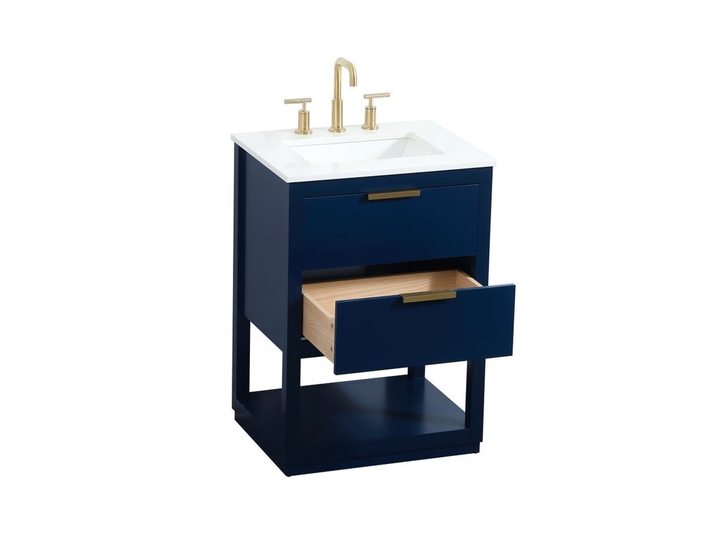 Live in modern comfort with this 24" blue finish vanity. Dressed in a blue and sleek gold metal hardware, its contemporary style will have your bathroom or powder room elevated in modern sophistication. The open shelf at the base and one drawer reveal ample storage space for your bathroom essentials and miscellany. Clean lines create its own visual interest, adding trendy looks to your already chic room.