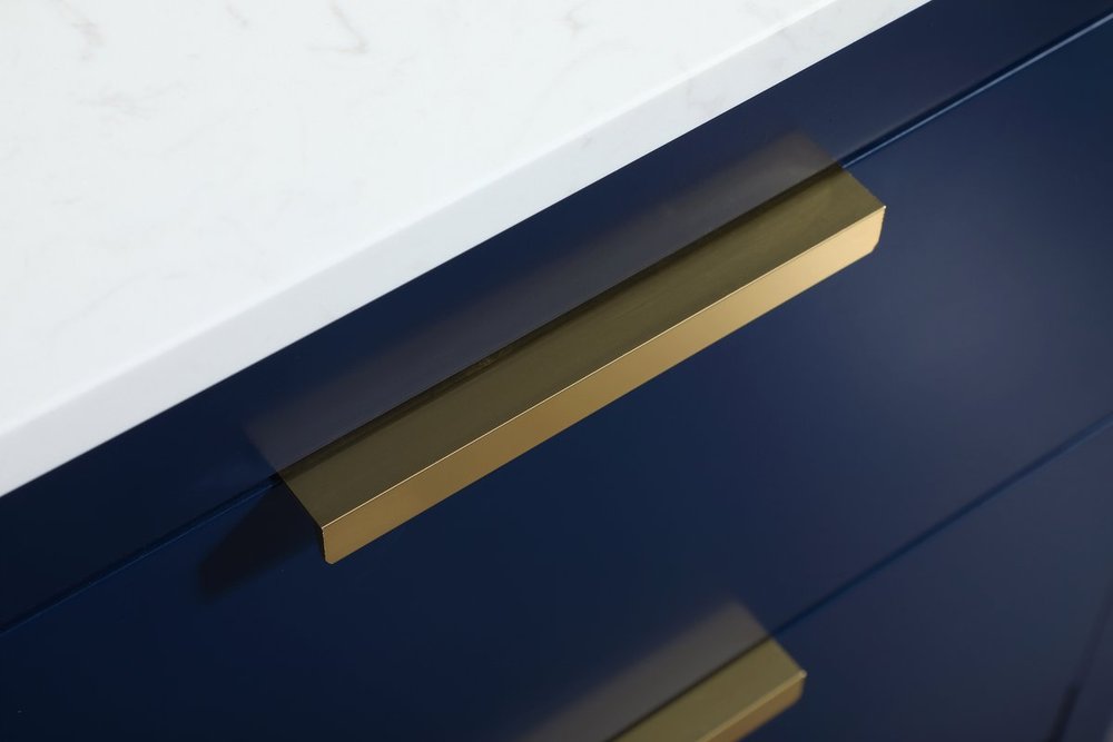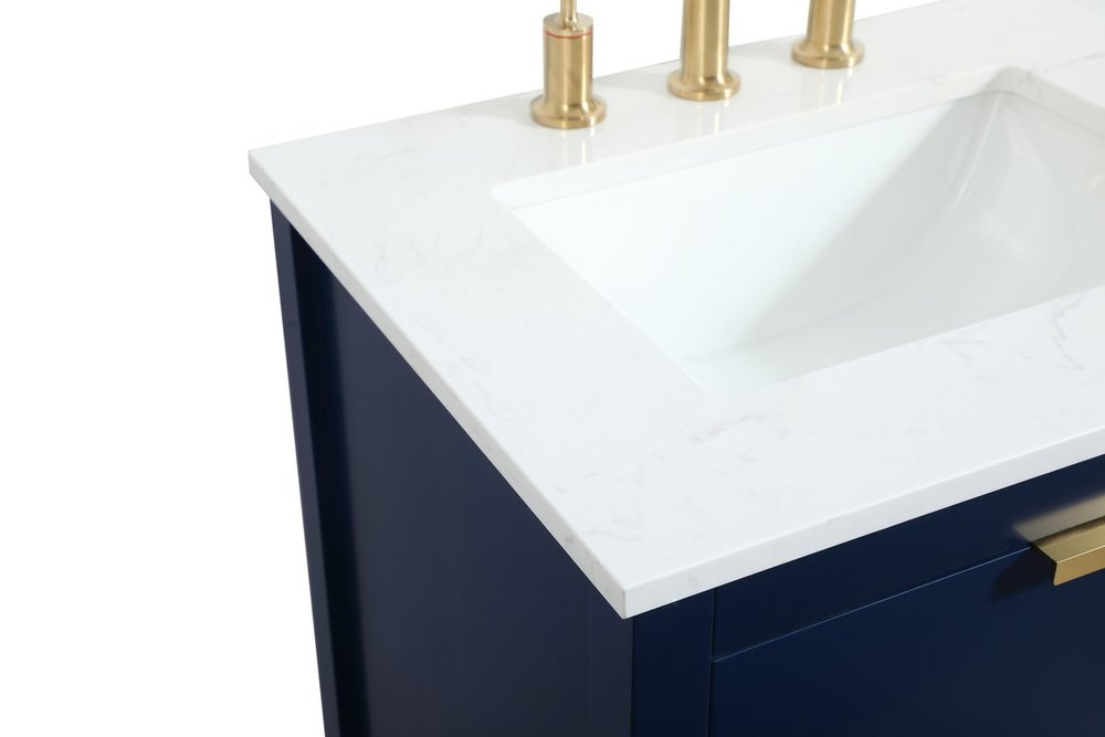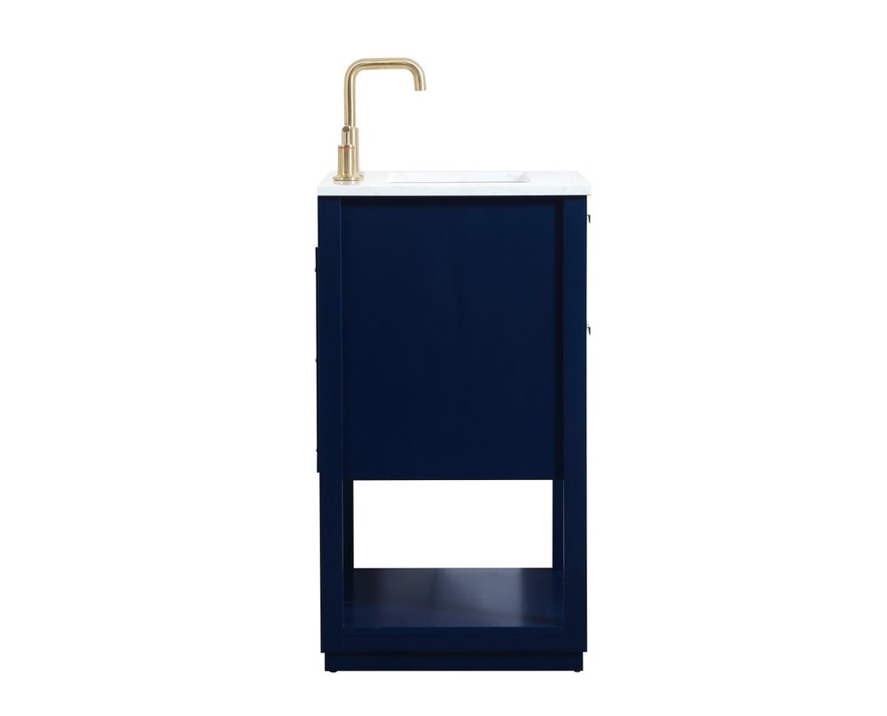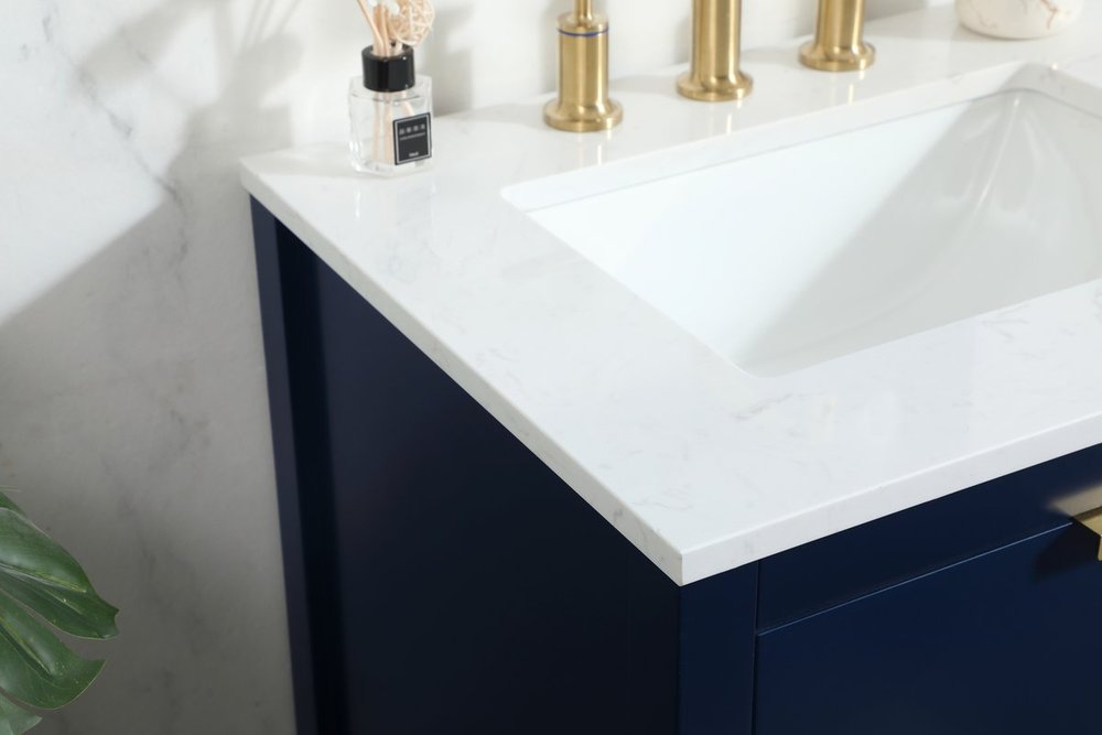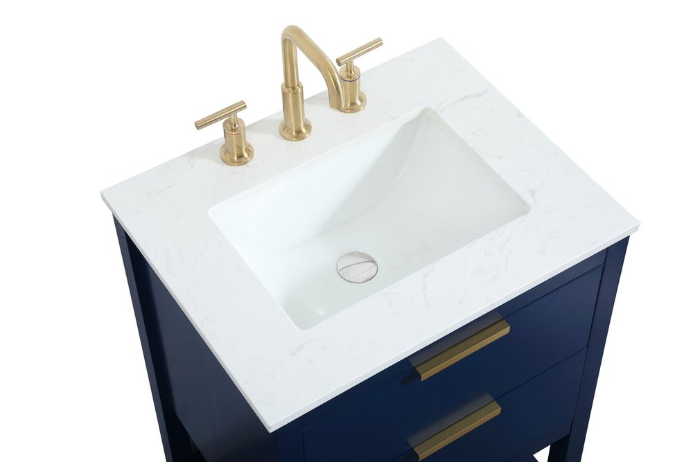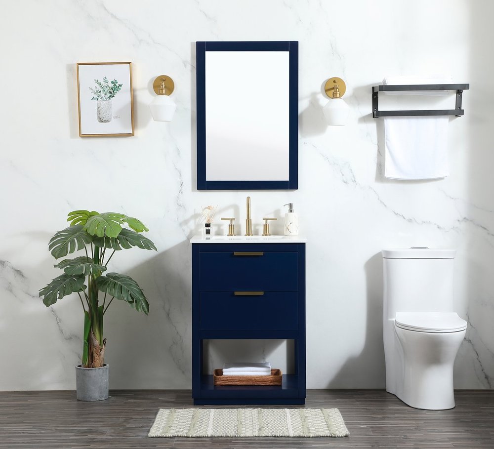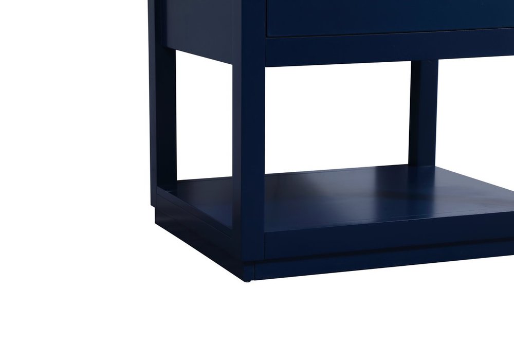 Live in modern comfort with this 24" blue finish vanity. Dressed in a blue and sleek gold metal hardware, its contemporary style will have your bathroom or powder room elevated in modern sophistication. The open shelf at the base and one drawer reveal ample storage space for your bathroom essentials and miscellany. Clean lines create its own visual interest, adding trendy looks to your already chic room.