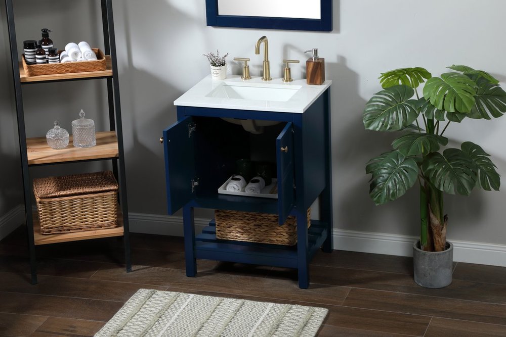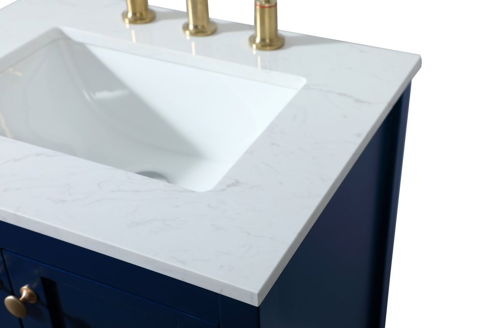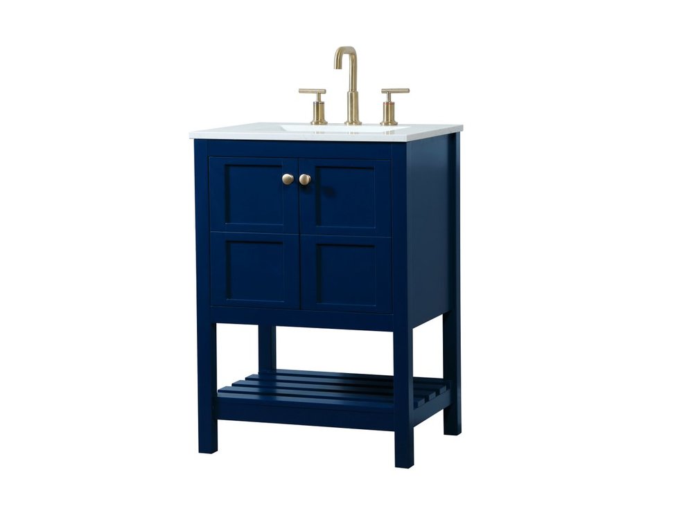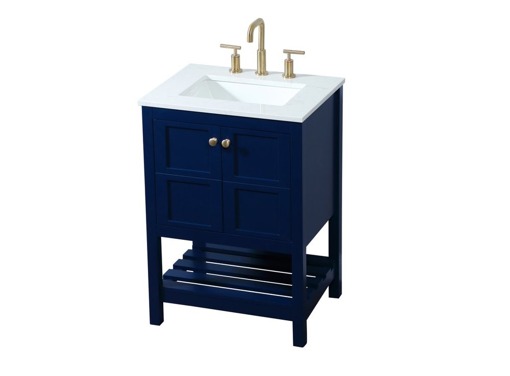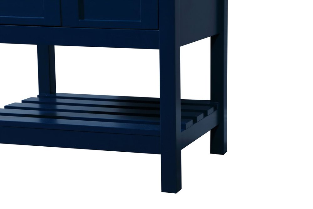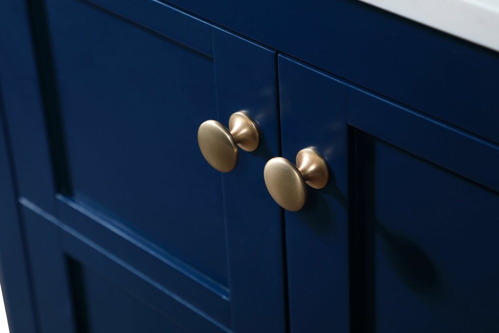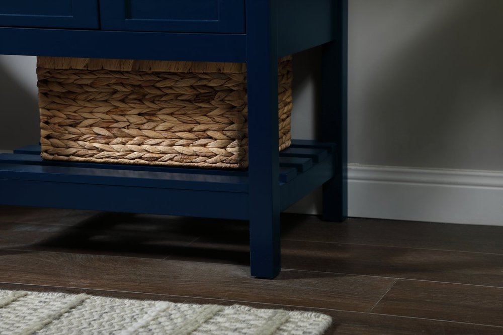 The subtle beauty of the Theo collection vanity exudes comfortable luxury. Its modern, yet traditional beauty will surely dress up your bathroom or powder room without any fuss. The calacatta engineered marble countertop and porcelain undermount sink shows quiet opulence, and the legs support upright without fail. Brushed gold hardware complements the trendy blue finish, with pulls adorning the two cabinet doors, showcasing ample storage space within. Slated shelf allows for additional space to organize your towels. Whether this vanity is in your bathroom or for guests, its presence will surely elevate the aesthetics of your room.