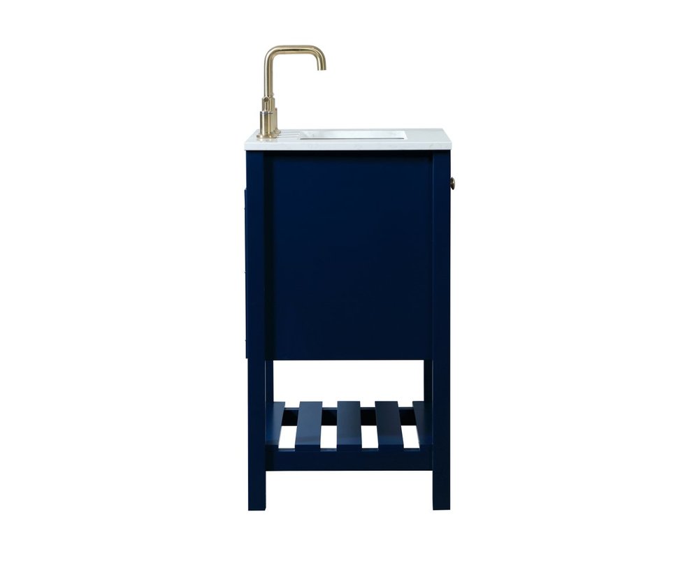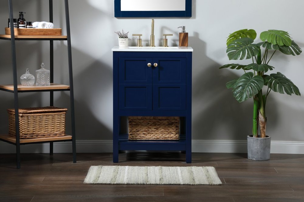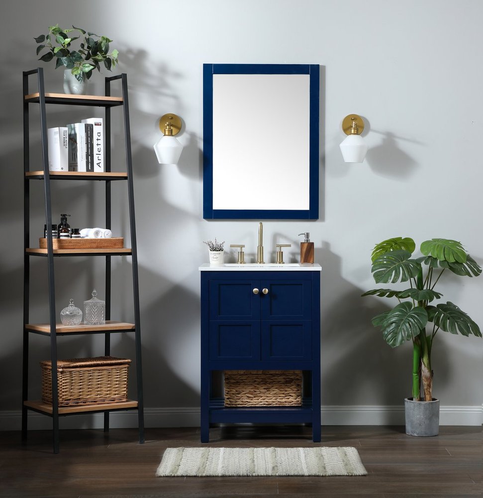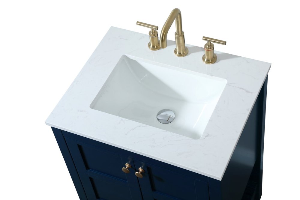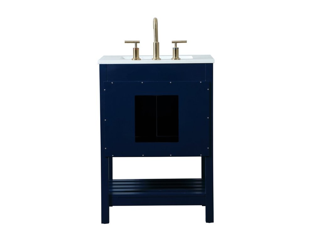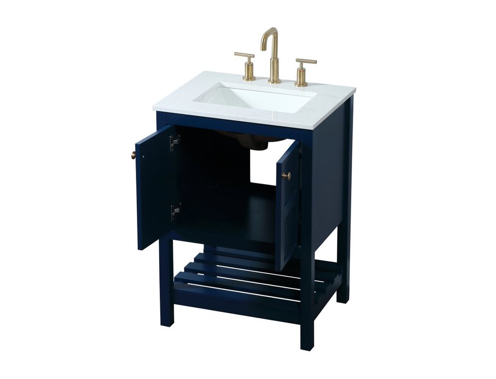 The subtle beauty of the Theo collection vanity exudes comfortable luxury. Its modern, yet traditional beauty will surely dress up your bathroom or powder room without any fuss. The calacatta engineered marble countertop and porcelain undermount sink shows quiet opulence, and the legs support upright without fail. Brushed gold hardware complements the trendy blue finish, with pulls adorning the two cabinet doors, showcasing ample storage space within. Slated shelf allows for additional space to organize your towels. Whether this vanity is in your bathroom or for guests, its presence will surely elevate the aesthetics of your room.