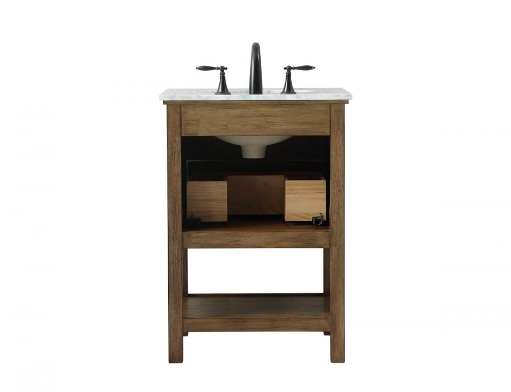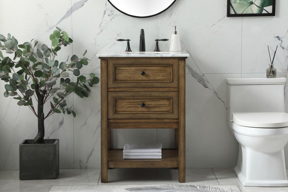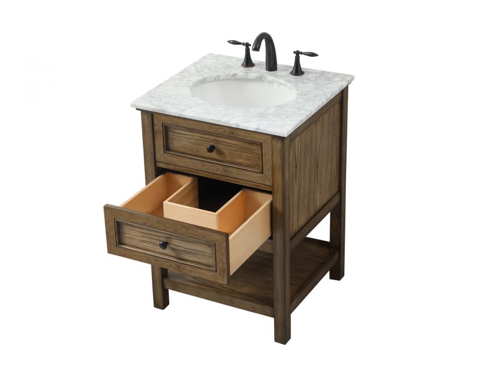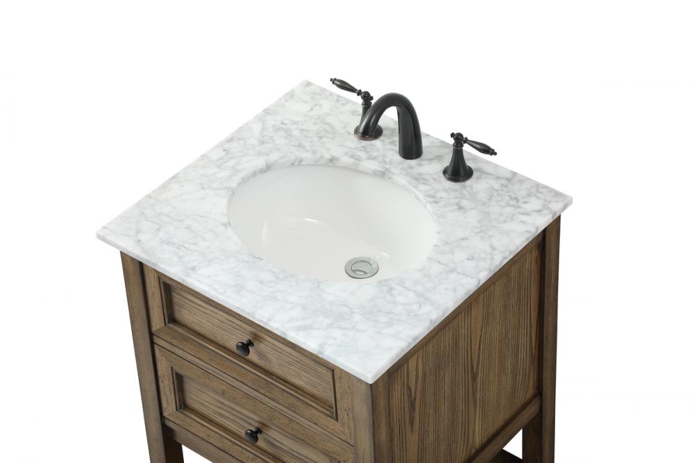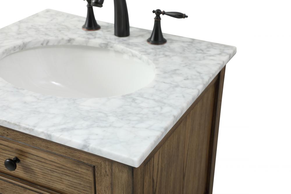 Comes with an undermount porcelain sink and a carrara white marble countertop