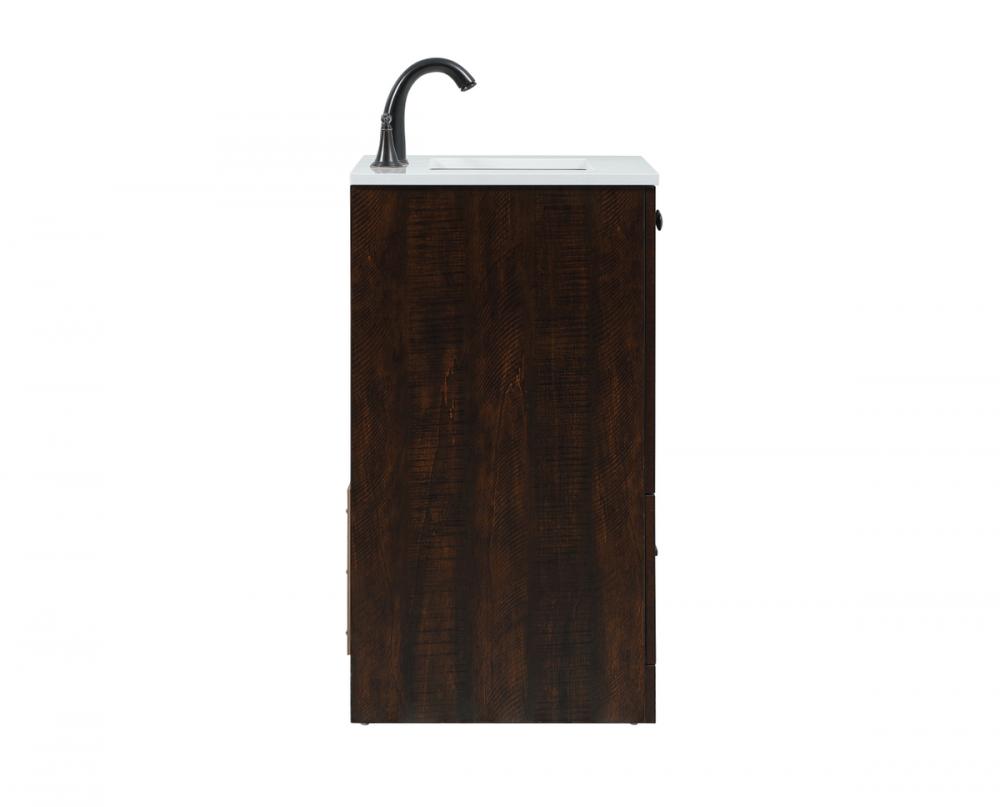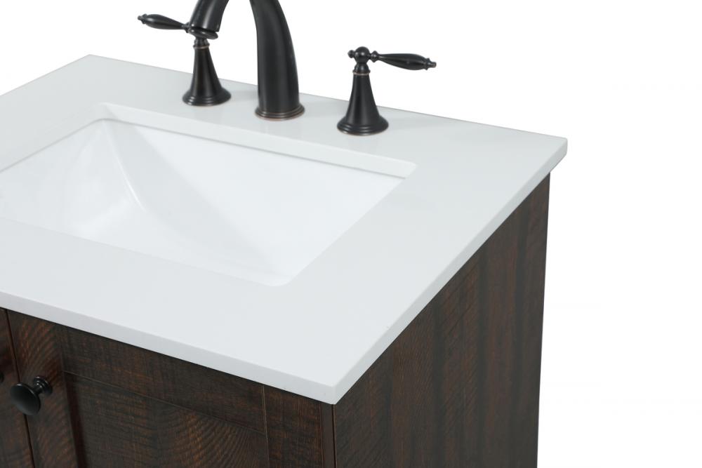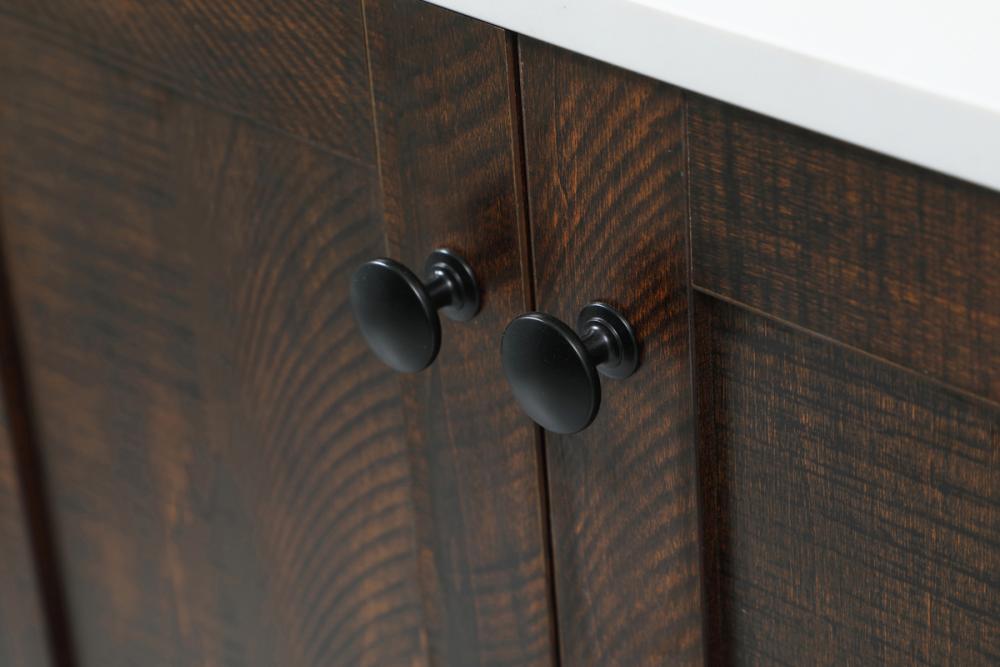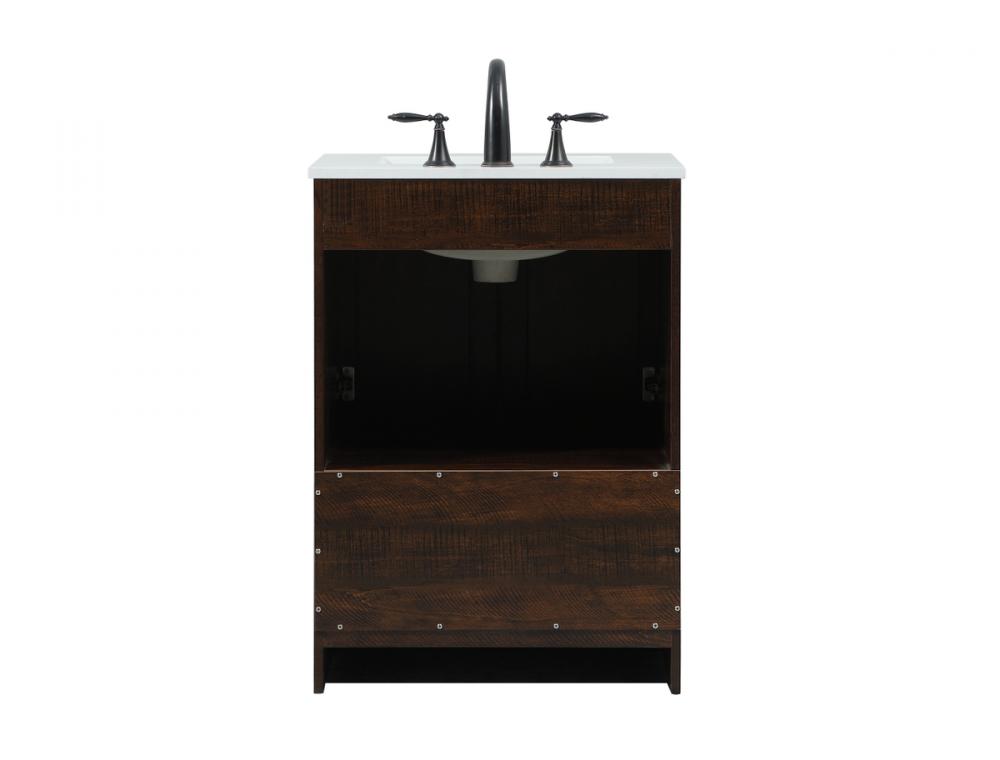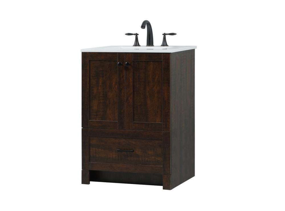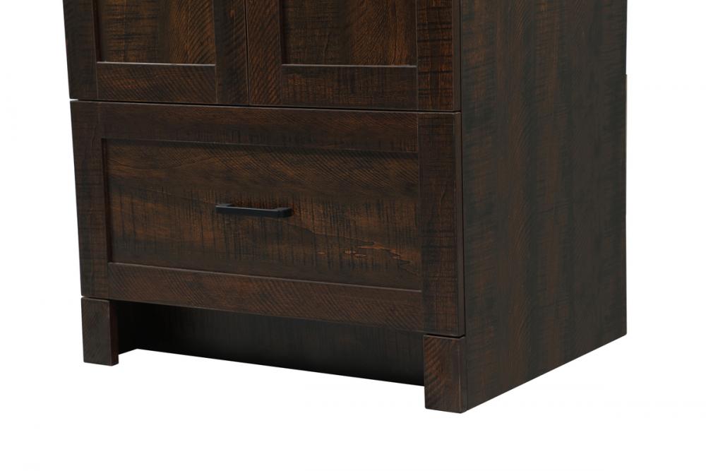 Delve into a world of minimalistic fashion and contemporary styling with this farmhouse 24" vanity. The clean faux lines anchors the weathered design. Black handle adorns the two doors hiding the base of the integrated porcelain sink while the bottom drawer allows you to store your bathroom necessities and toiletries. The compact size makes it the perfect vanity for any bathroom or powder room, regardless of size.