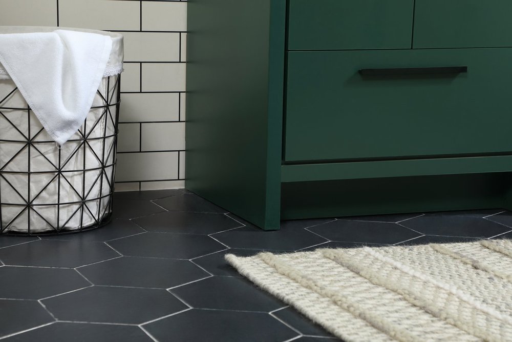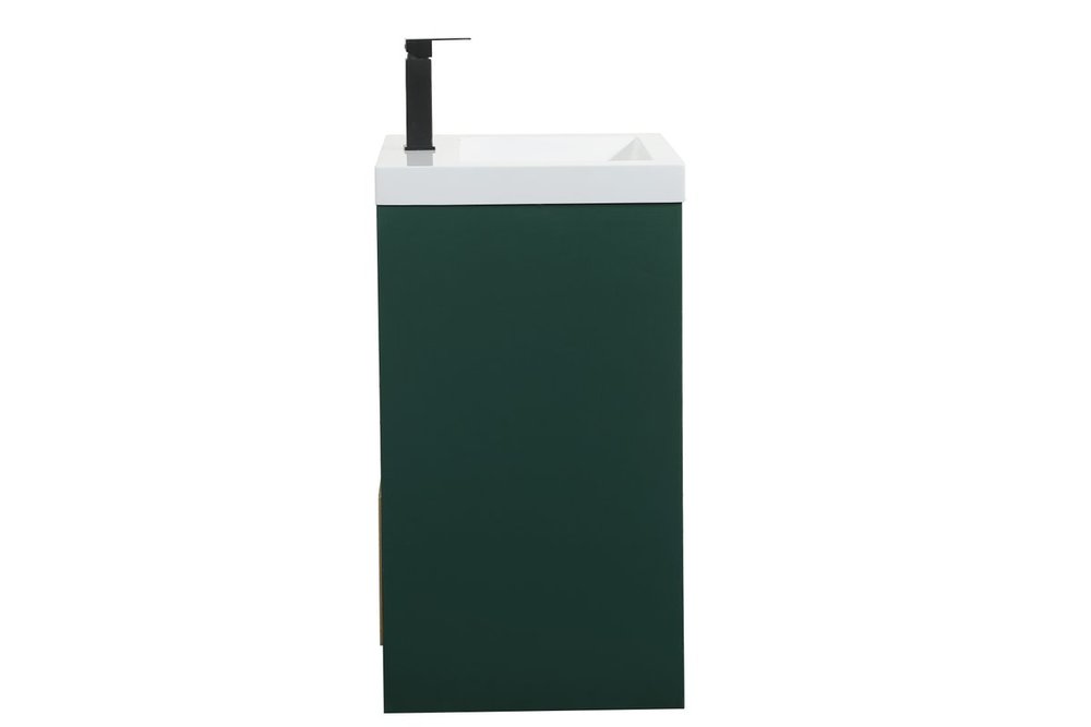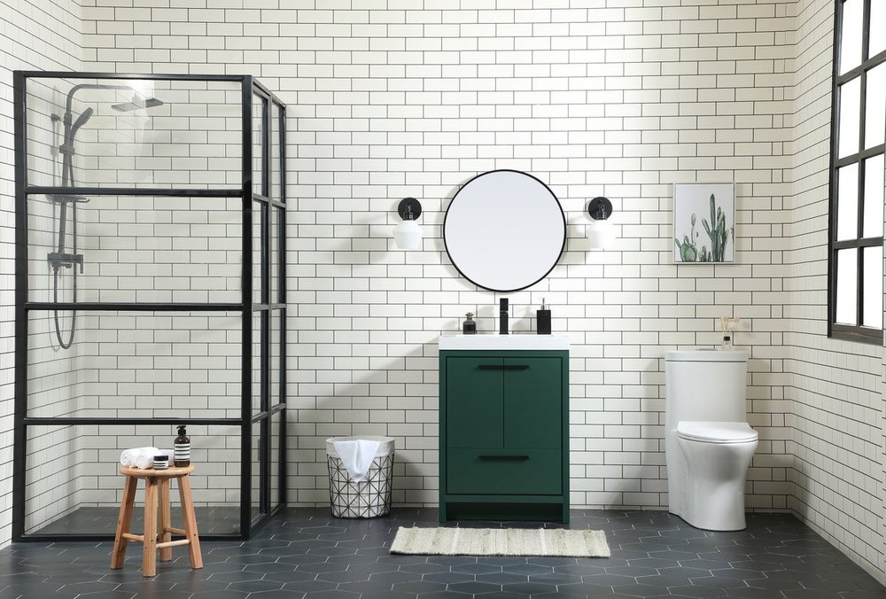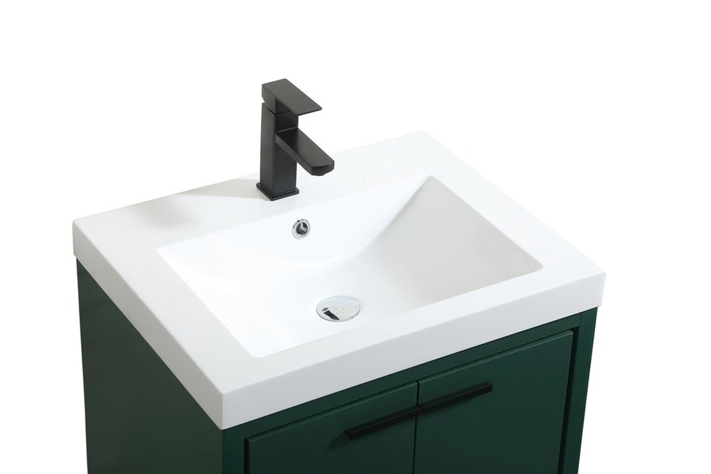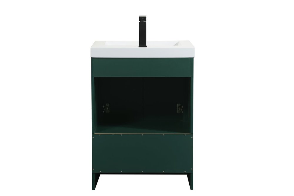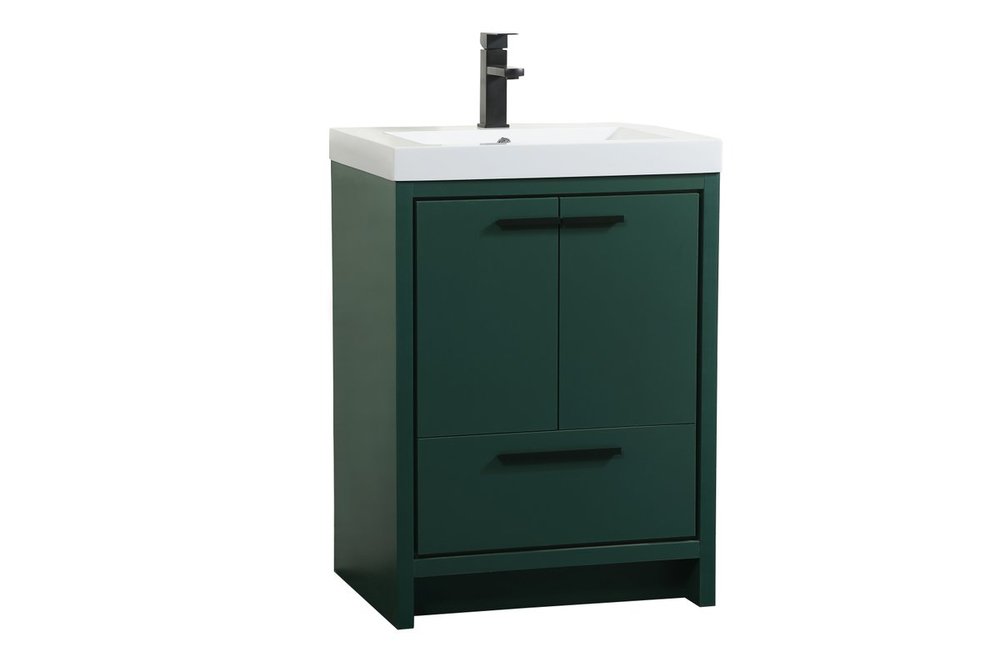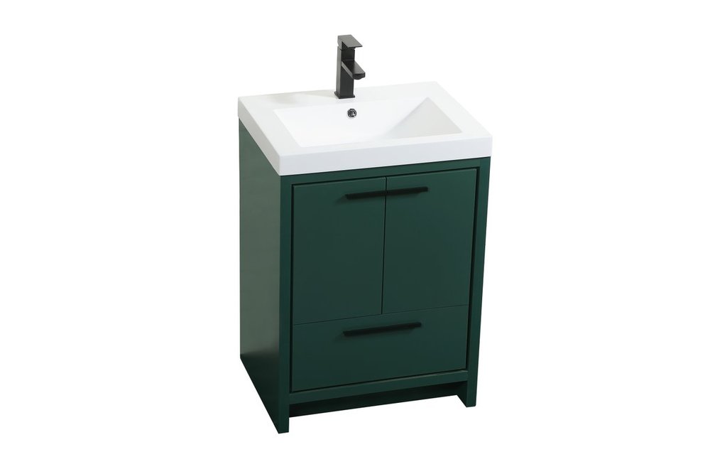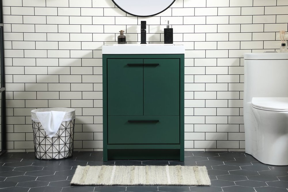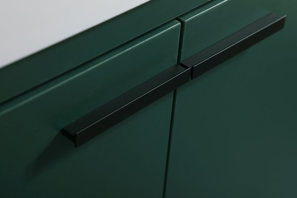 Modern sophistication is defined within the urbane green finish and black barpulls of this vanity. Its length makes it the perfect addition to any sized home, and saves space with its storage area hidden behind the double cabinet doors and one bottom drawers. Topped with a highly durable resin white counter top and an integrated sink, this modern design will add everlasting class to your bathroom and powder room.