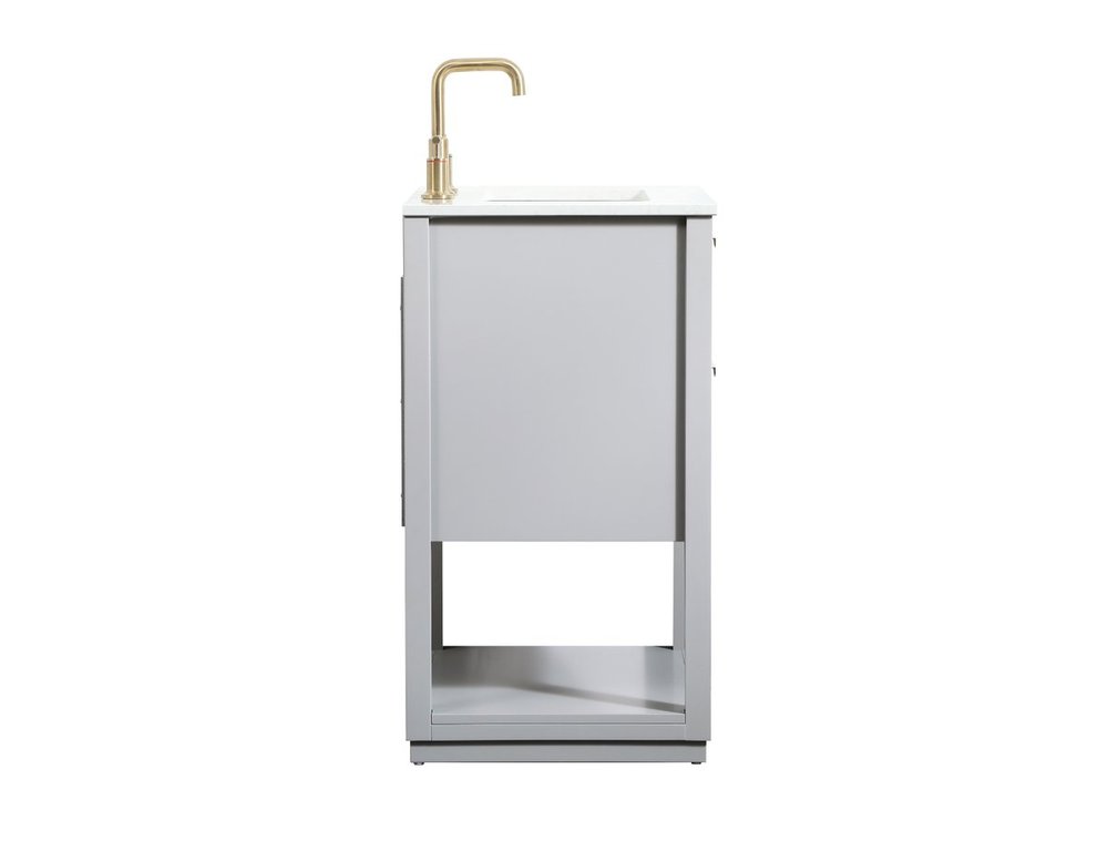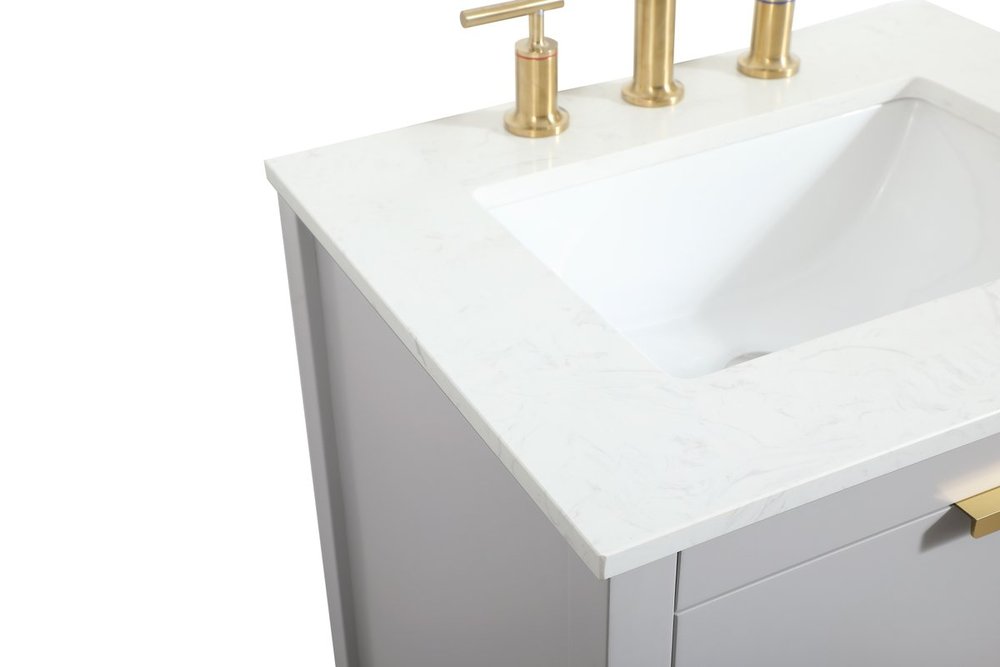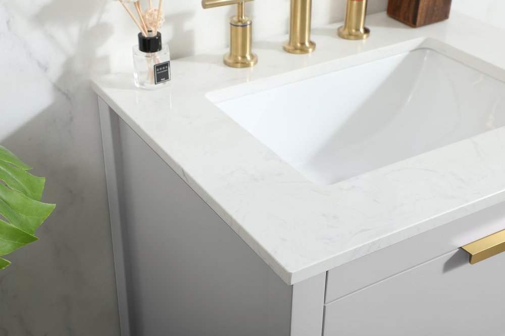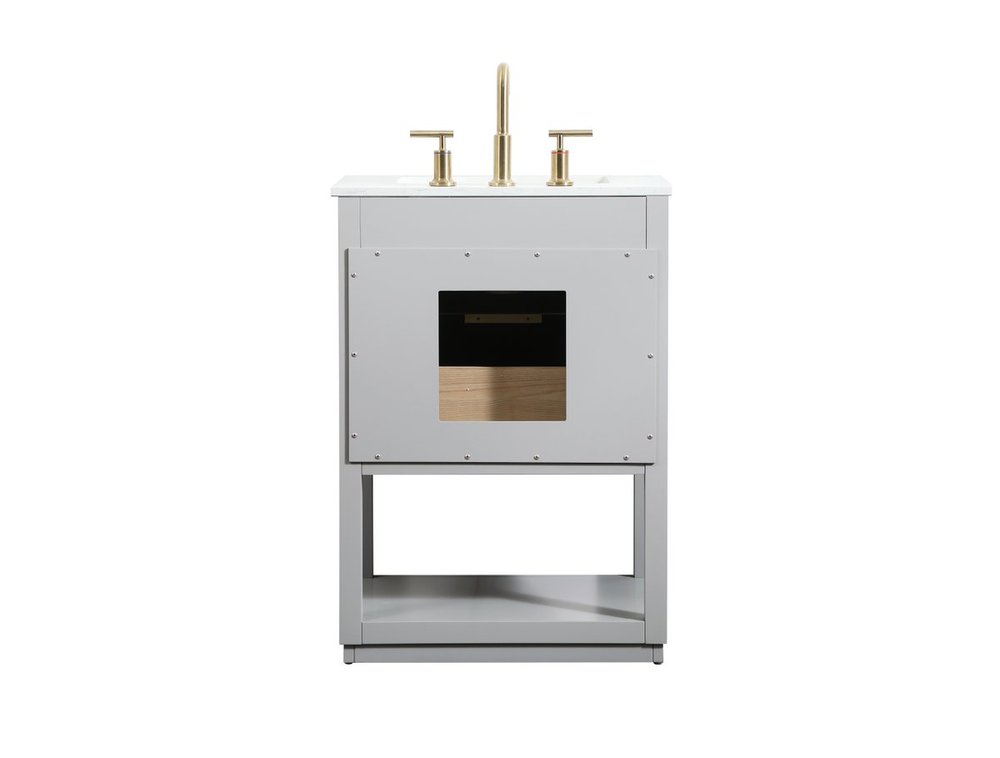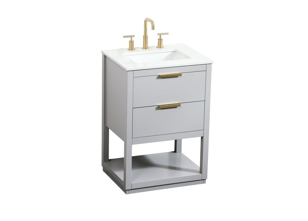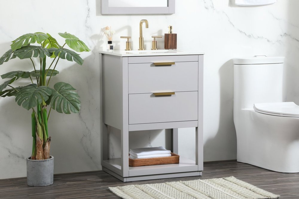 Live in modern comfort with this 24" gray finish vanity. Dressed in a gray and sleek gold metal hardware, its contemporary style will have your bathroom or powder room elevated in modern sophistication. The open shelf at the base and one drawer reveal ample storage space for your bathroom essentials and miscellany. Clean lines create its own visual interest, adding trendy looks to your already chic room.