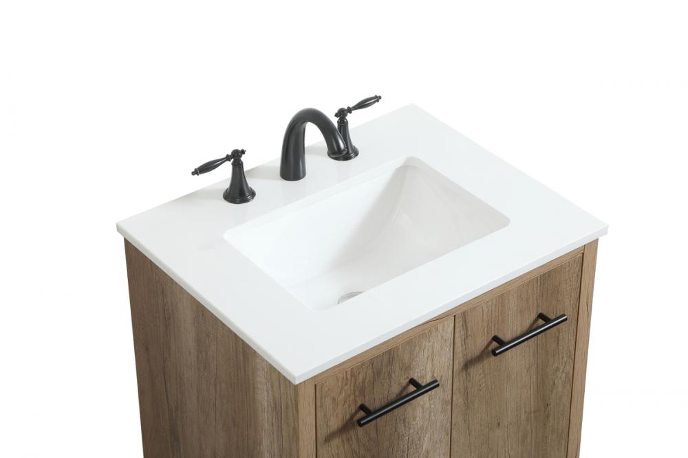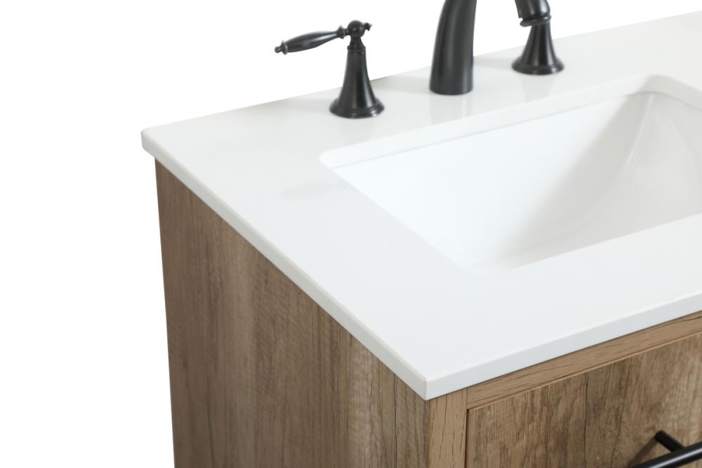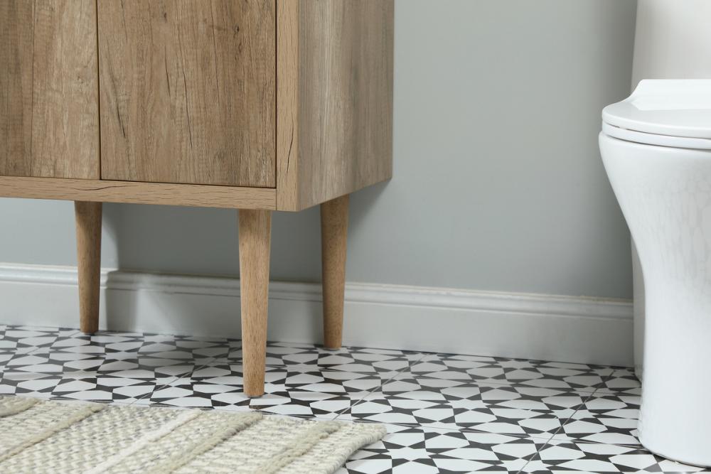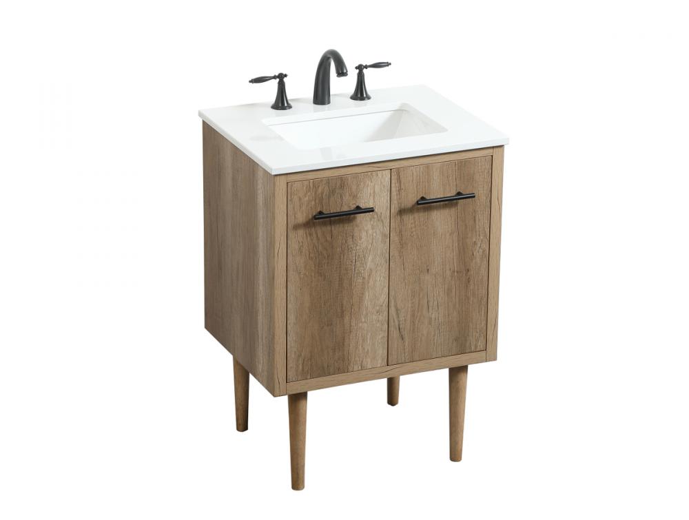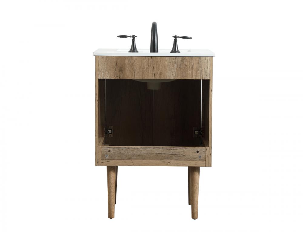 Delve into a world of minimalistic fashion and contemporary styling with this midcentury modern vanity. The clean lines anchors the design, while the straight tapered cylinder legs add subtle interest. Bar pull handle adorns the soft closing door hiding the base of the rectangular porcelain sink and letting you store your bathroom necessities and toiletries. The compact size makes it the perfect vanity for any bathroom or powder room, regardless of size. Whether you want to use this as a floating vanity or a freestanding vanity, the choice is yours. The durable ivory white engineered marble countertop complements the manufactured wood base vanity and is built to last.