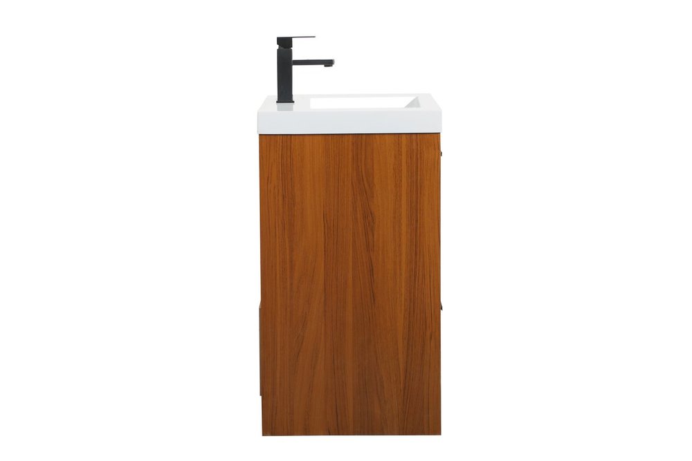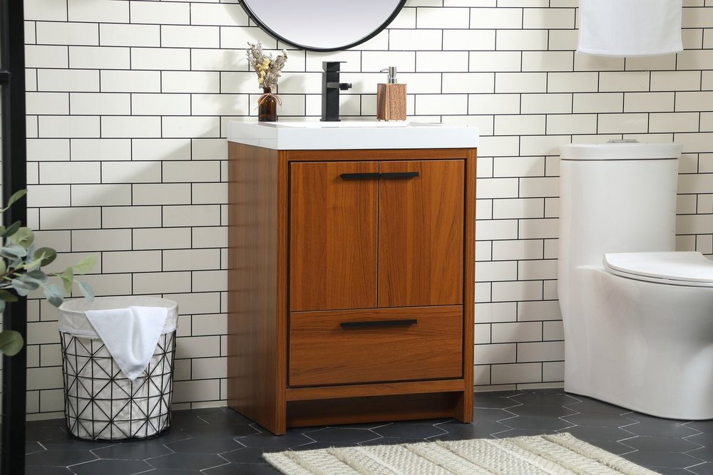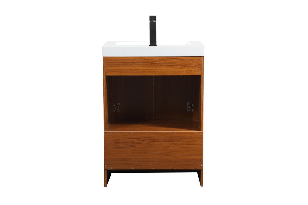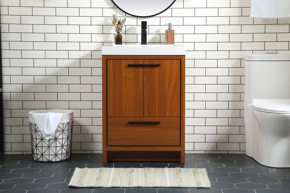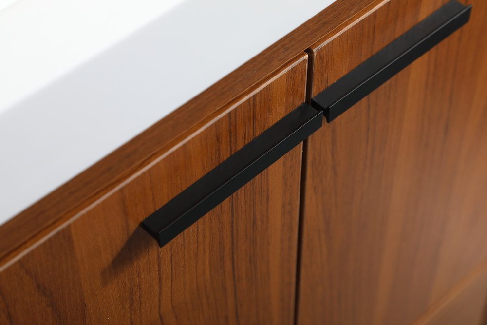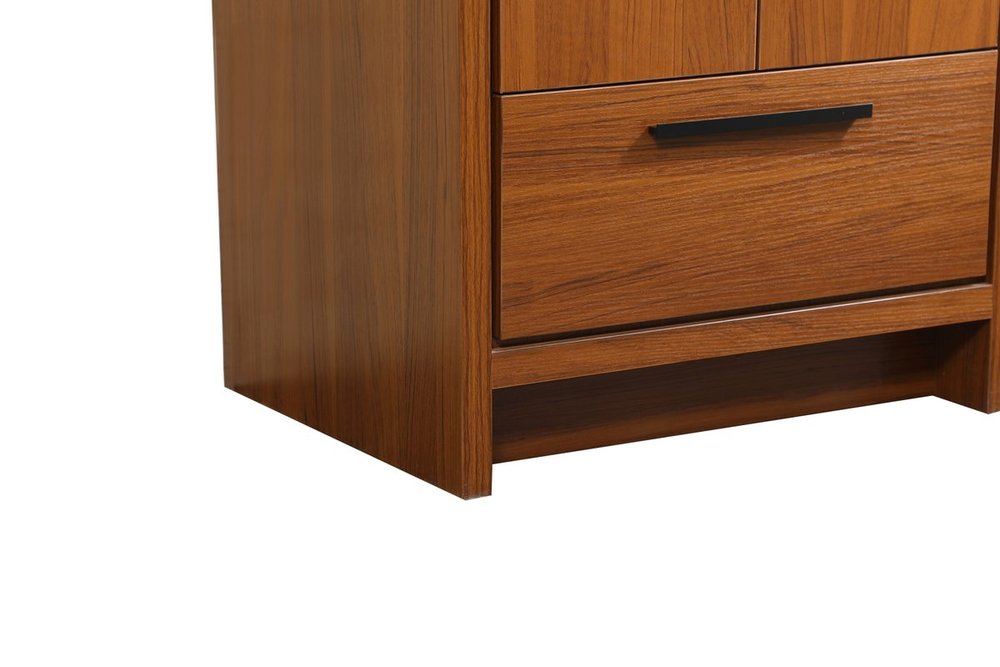 Modern sophistication is defined within the teak finish and black barpulls of this vanity. Its length makes it the perfect addition to any sized home, and saves space with its storage area hidden behind the double cabinet doors and one bottom drawers. Topped with a highly durable resin white counter top and an integrated sink, this modern design will add everlasting class to your bathroom and powder room.