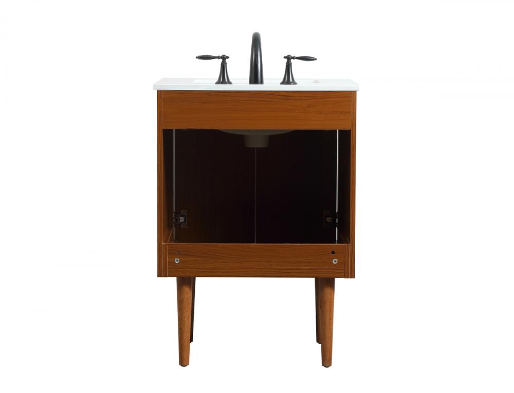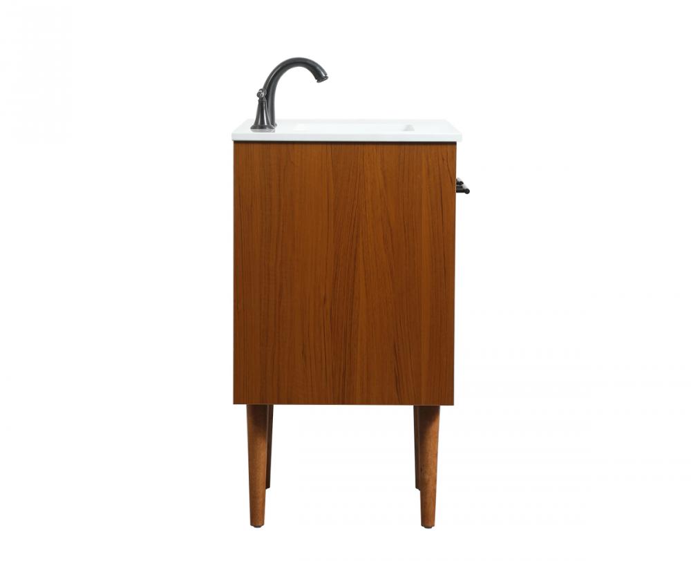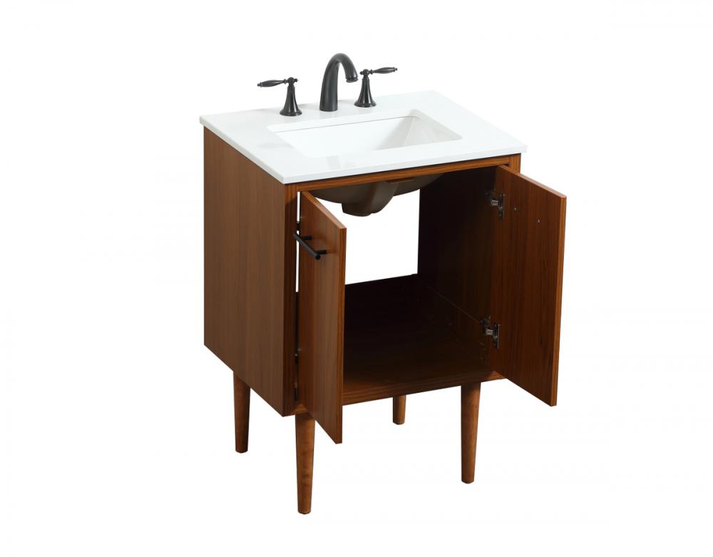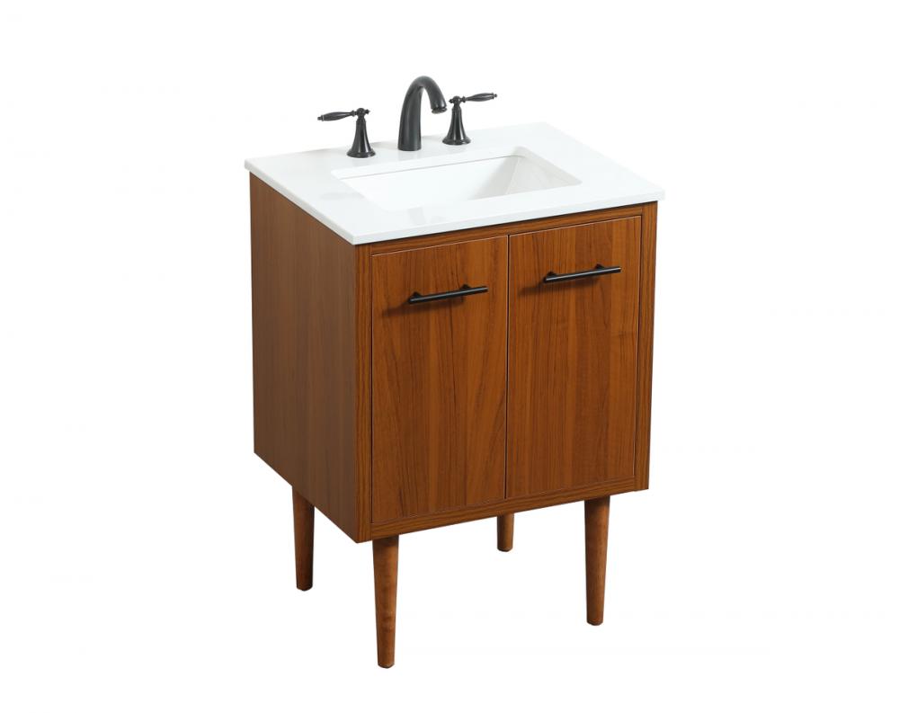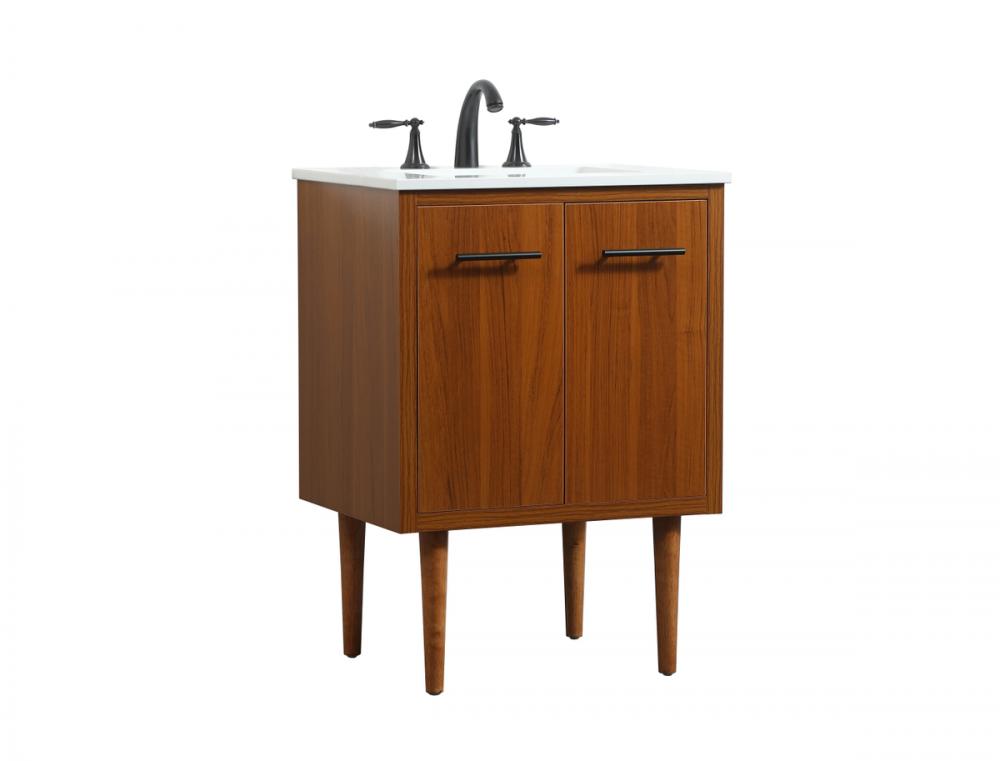 Delve into a world of minimalistic fashion and contemporary styling with this midcentury modern vanity. The clean lines anchors the design, while the straight tapered cylinder legs add subtle interest. Bar pull handle adorns the soft closing door hiding the base of the rectangular porcelain sink and letting you store your bathroom necessities and toiletries. The compact size makes it the perfect vanity for any bathroom or powder room, regardless of size. Whether you want to use this as a floating vanity or a freestanding vanity, the choice is yours. The durable ivory white engineered marble countertop complements the manufactured wood base vanity and is built to last.